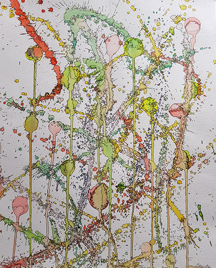 When the work dries, I highlight the edges where the colours end, or merge with ink. I call this The Midas Technique because adding the ink elevates the painting to a new and brighter level. Just like everything Midas touched turned to gold, after highlighting the edges with ink my work becomes golden in my eyes.
