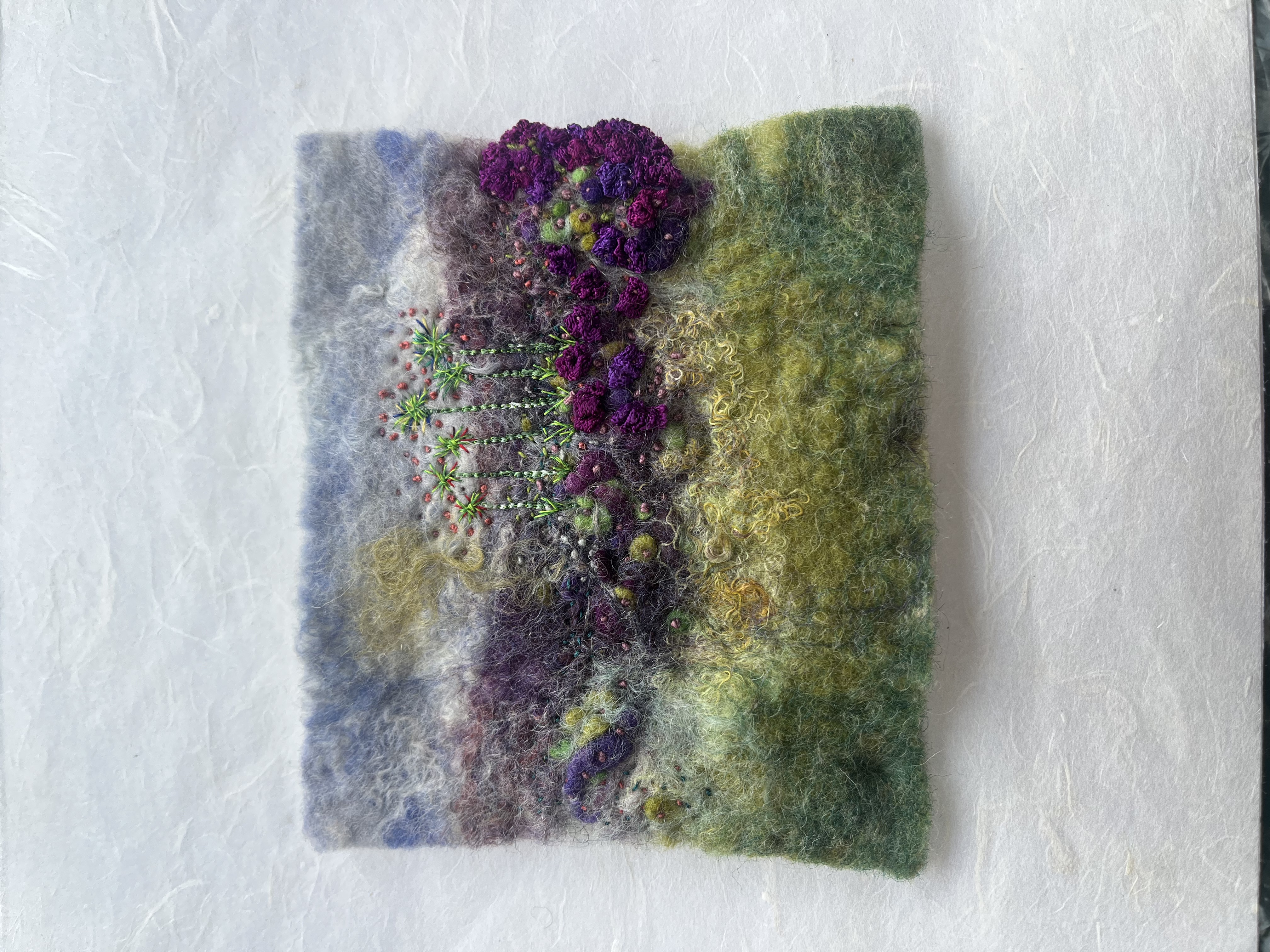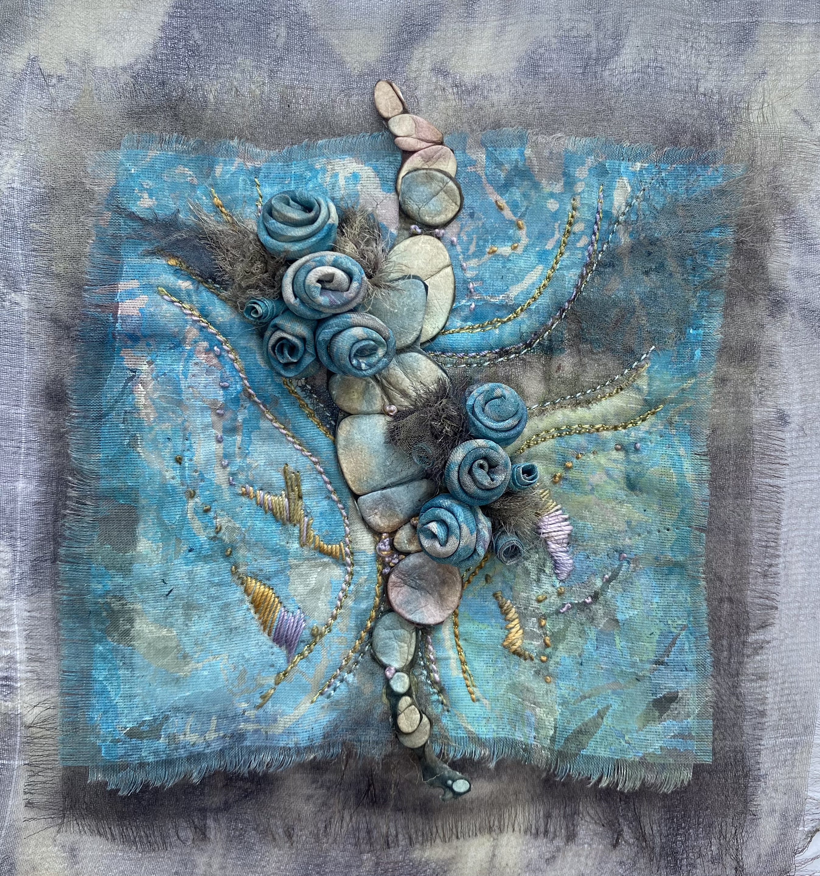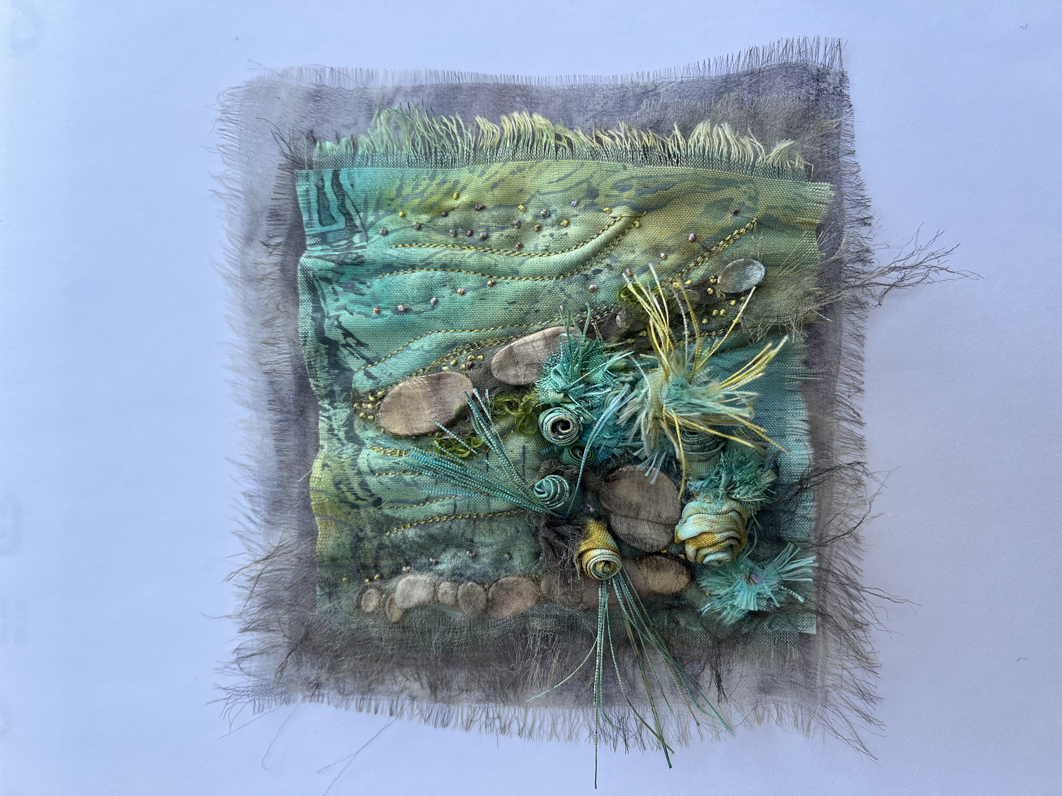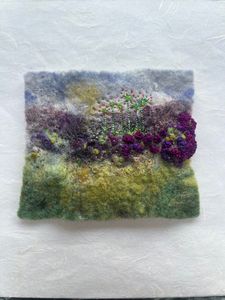 I look towards the land and sea for inspiration and natures flawless artworks. My art explores and exploits textile materials and I use stitch and dyes to express imagery on silk, paper and embellished felt.