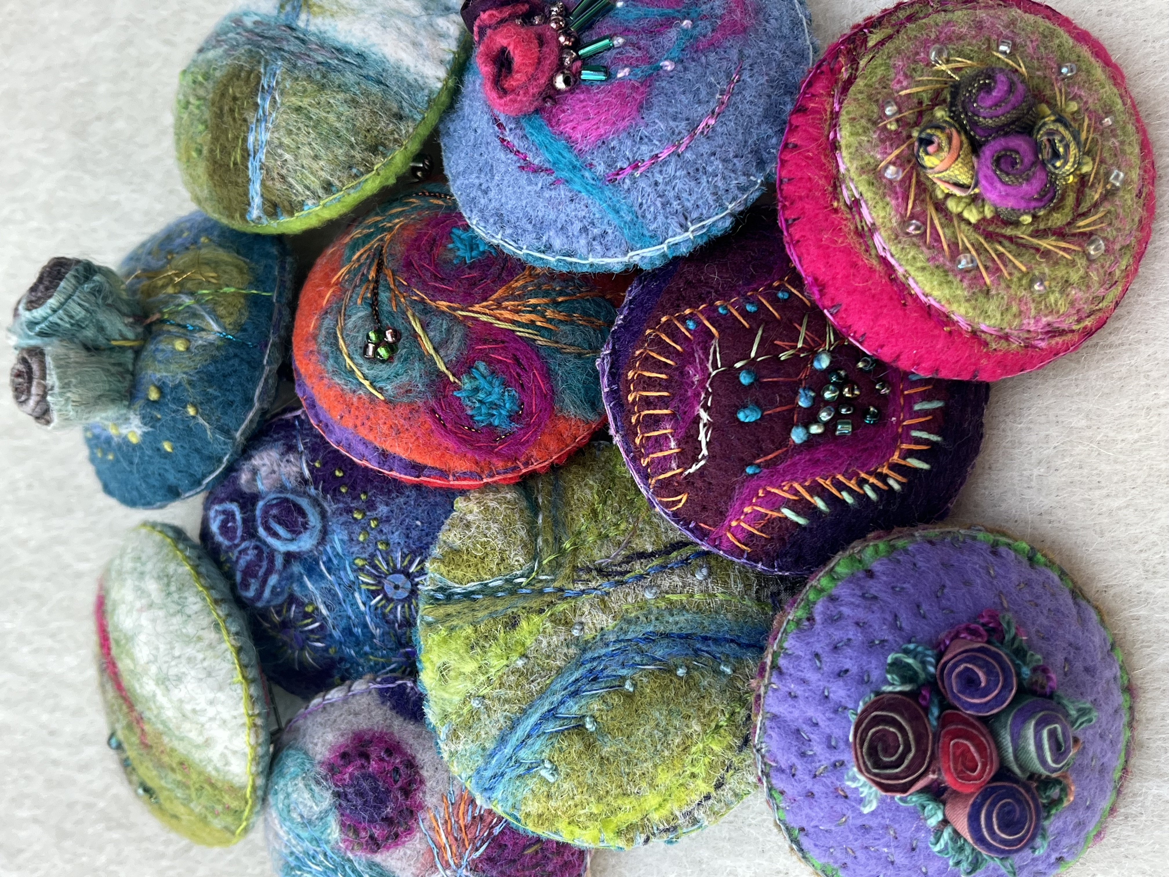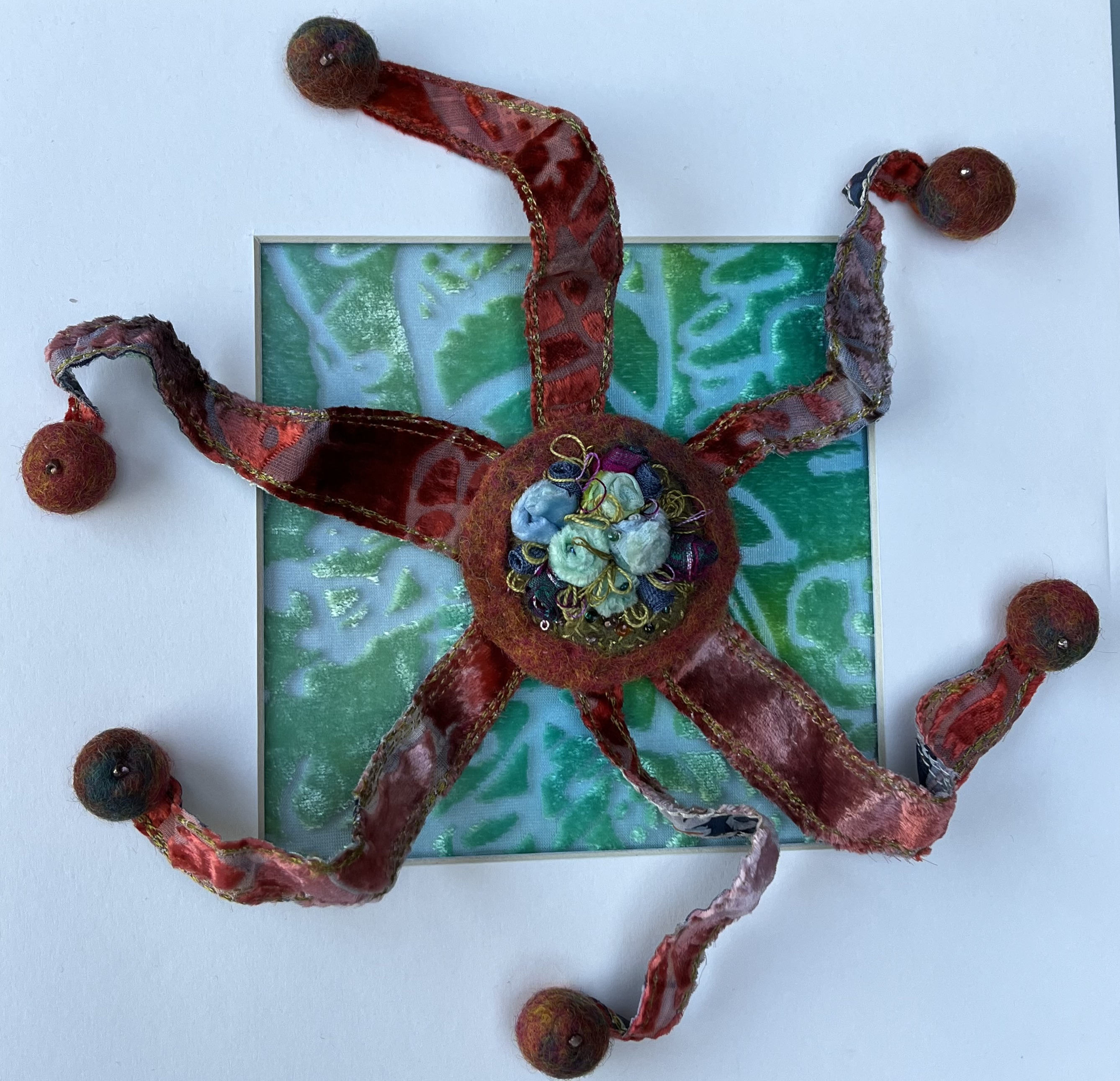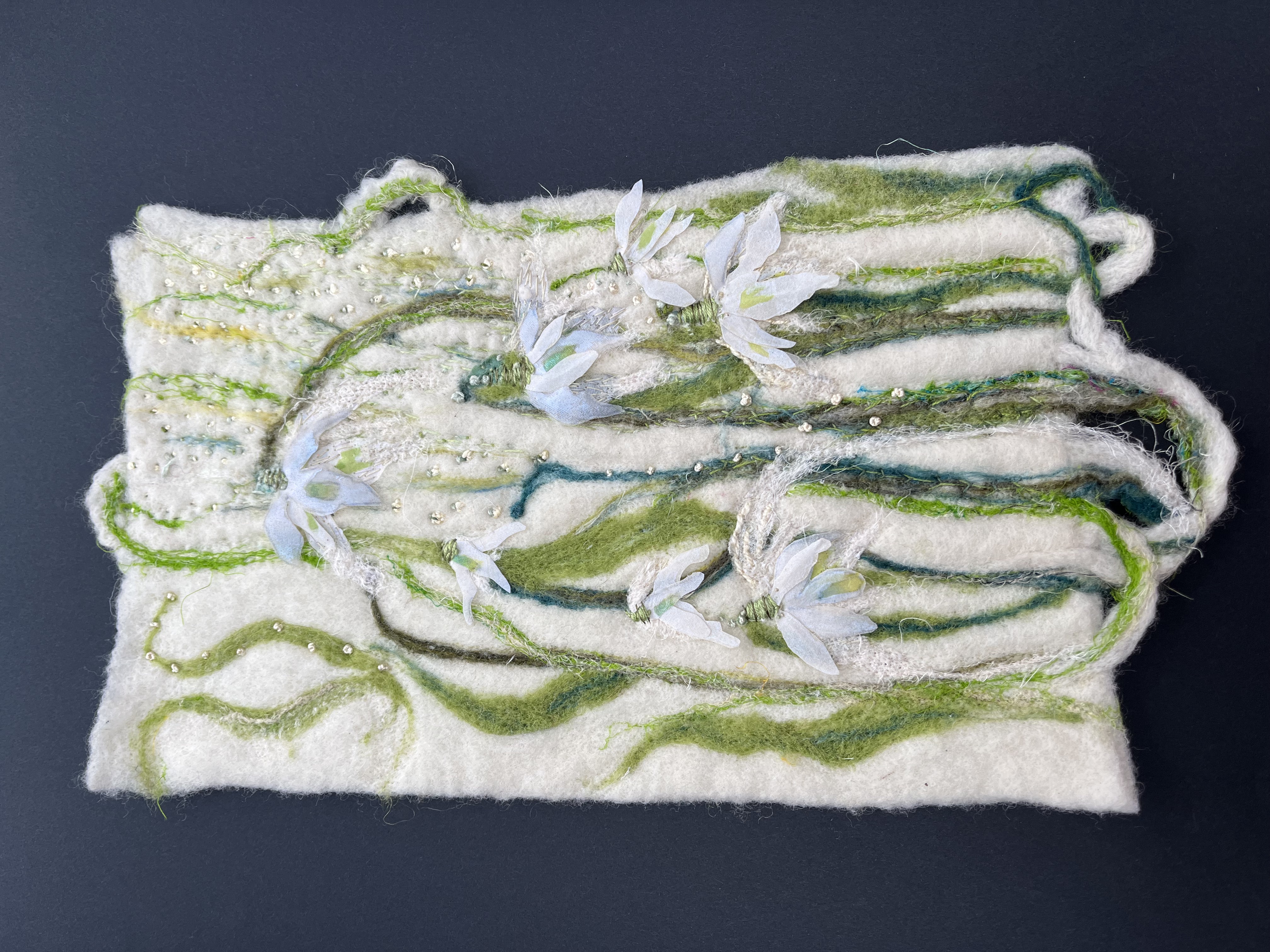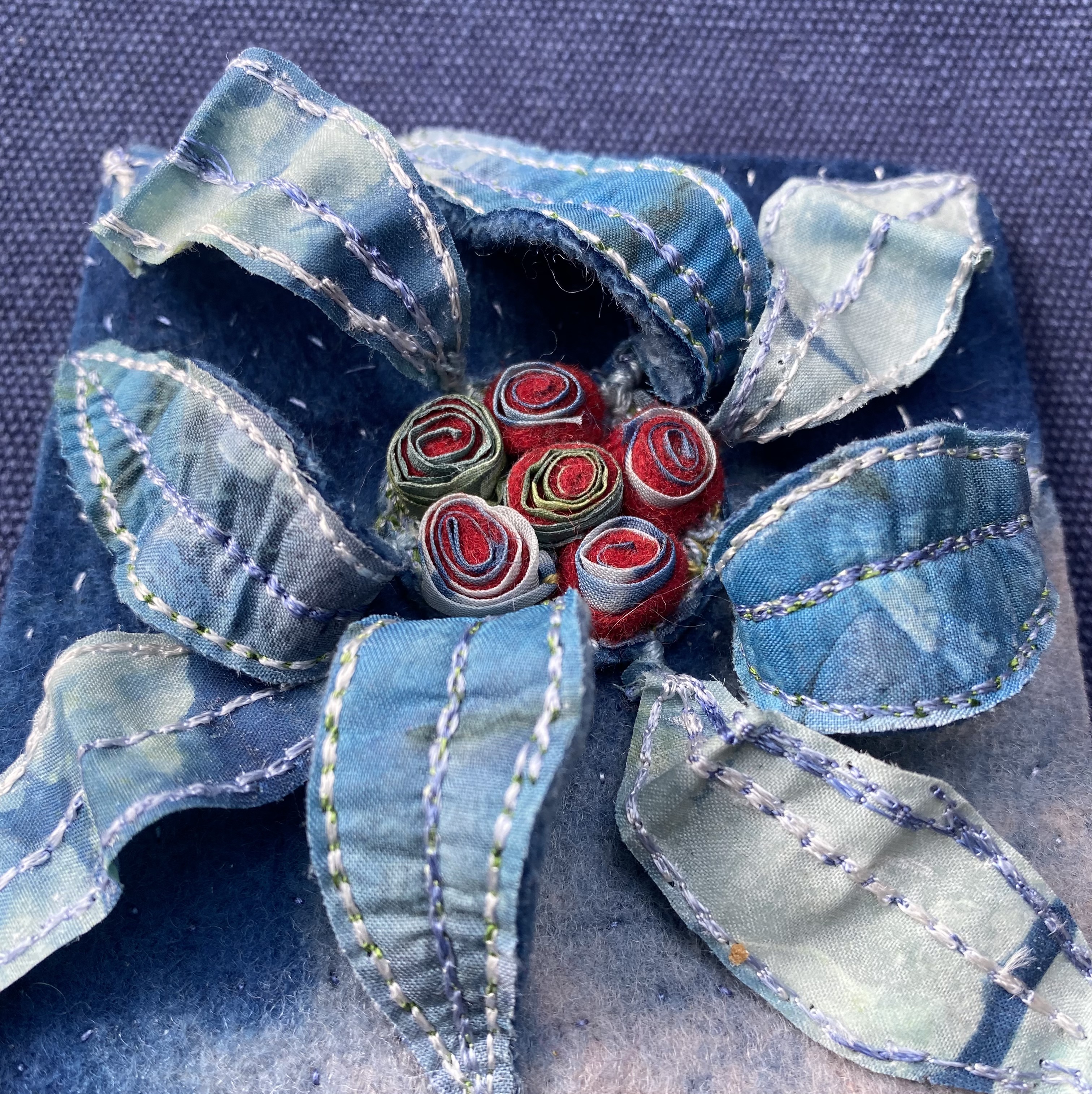 I look towards the land and sea for inspiration and natures flawless artworks. My art explores and exploits textile materials and I use stitch and dyes to express imagery on silk, paper and embellished felt.