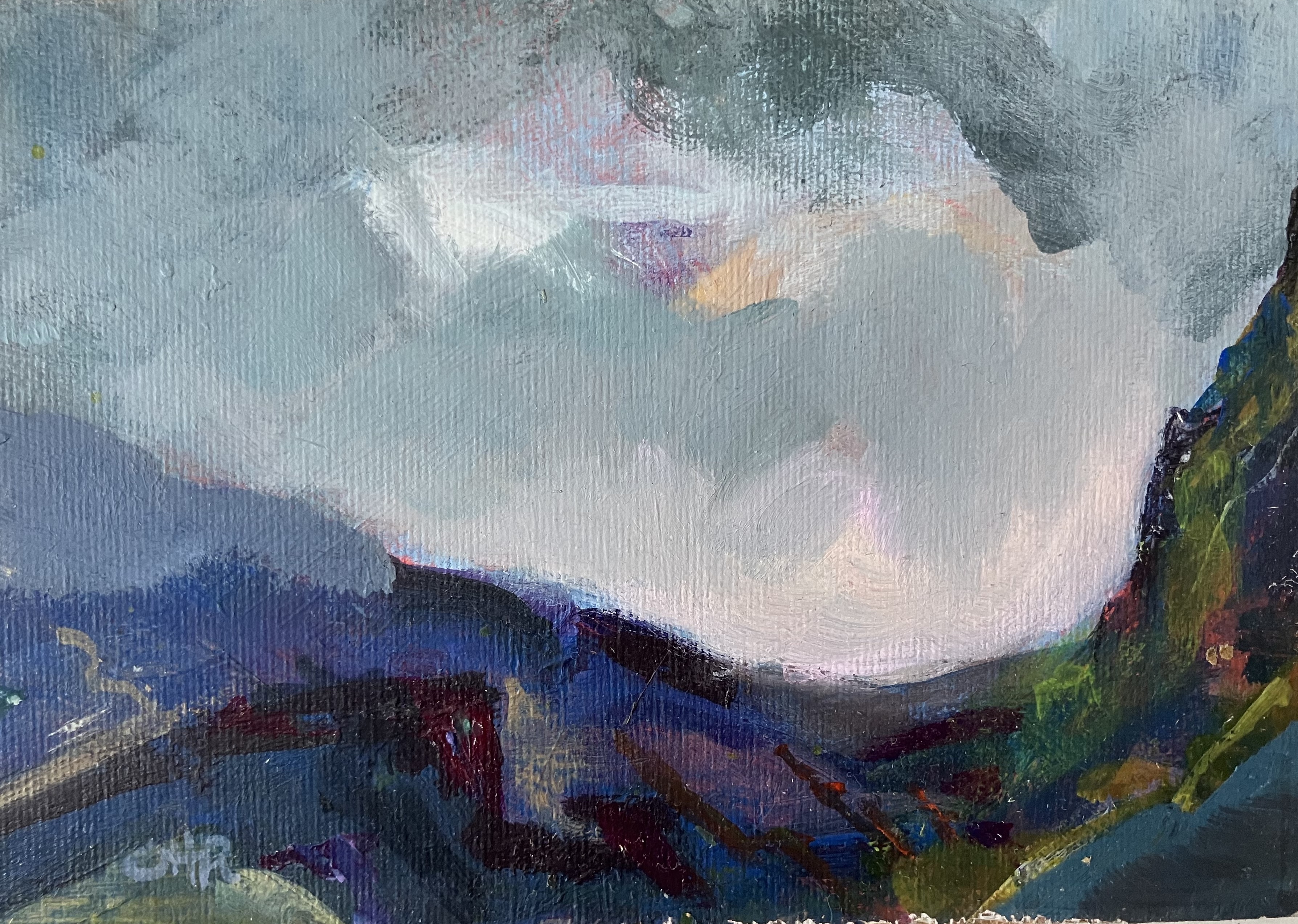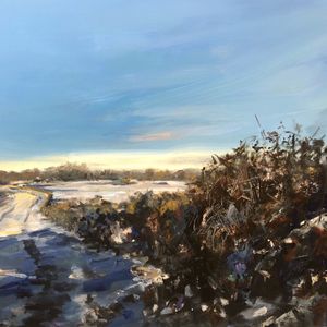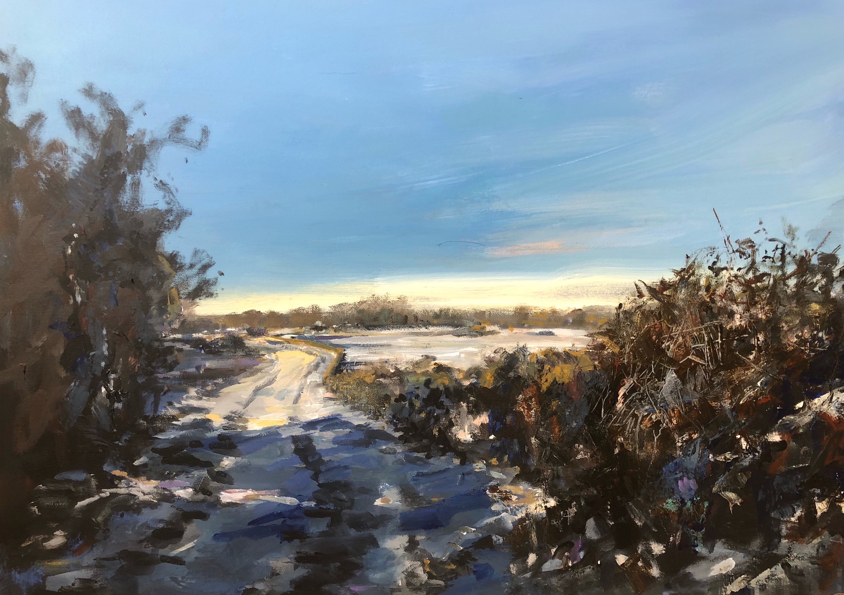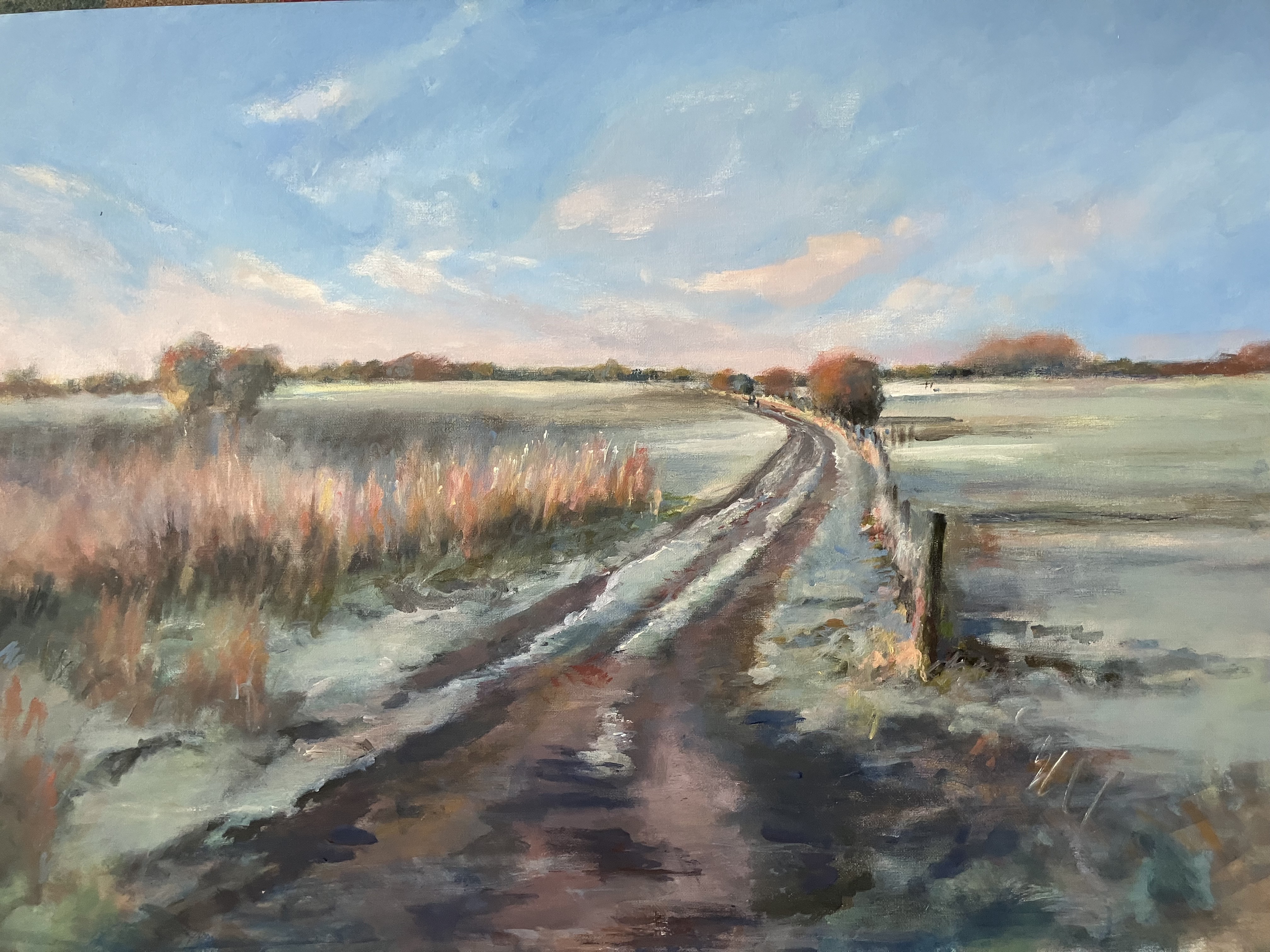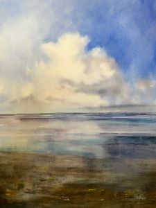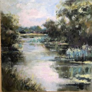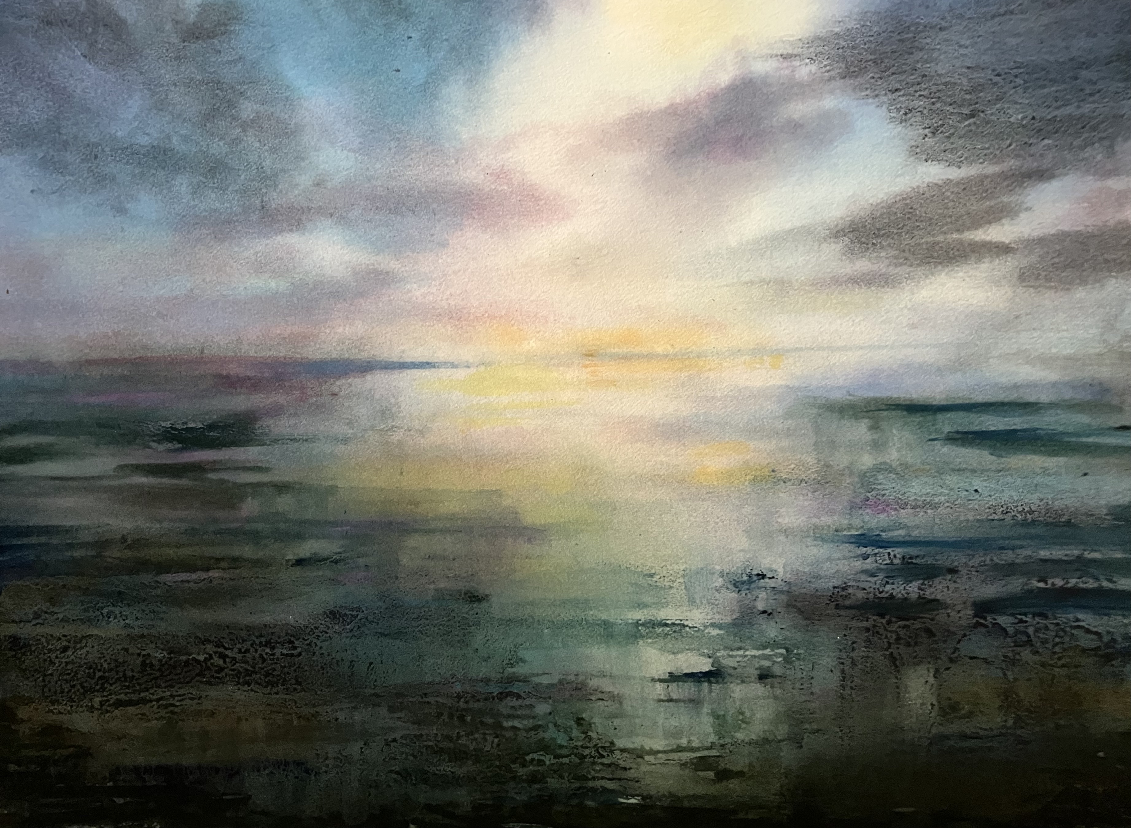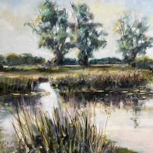 I paint mainly in acrylic or watercolour, and sometimes with mixed media. I prefer to paint outside whatever the weather which can bring a whole new meaning to watercolour!