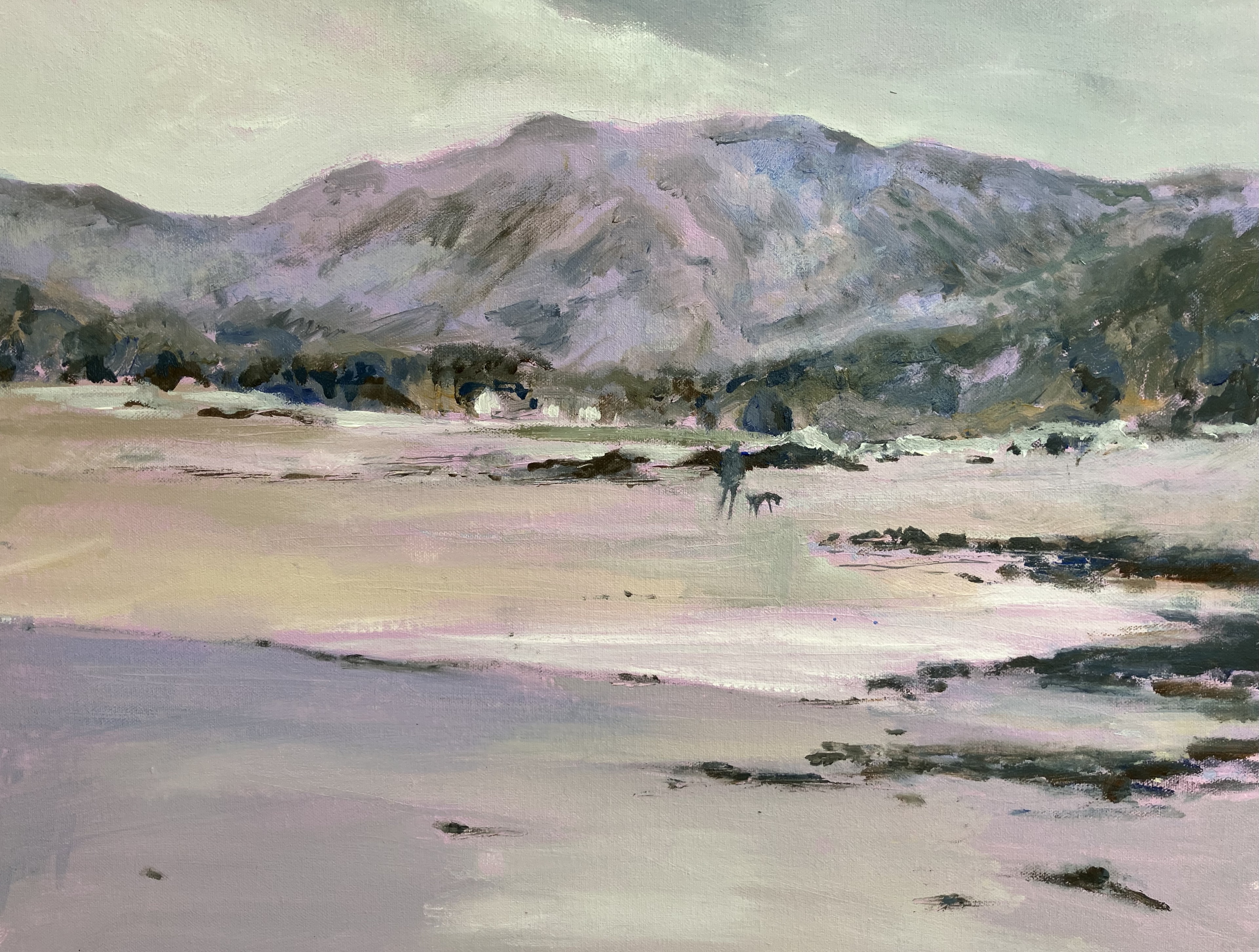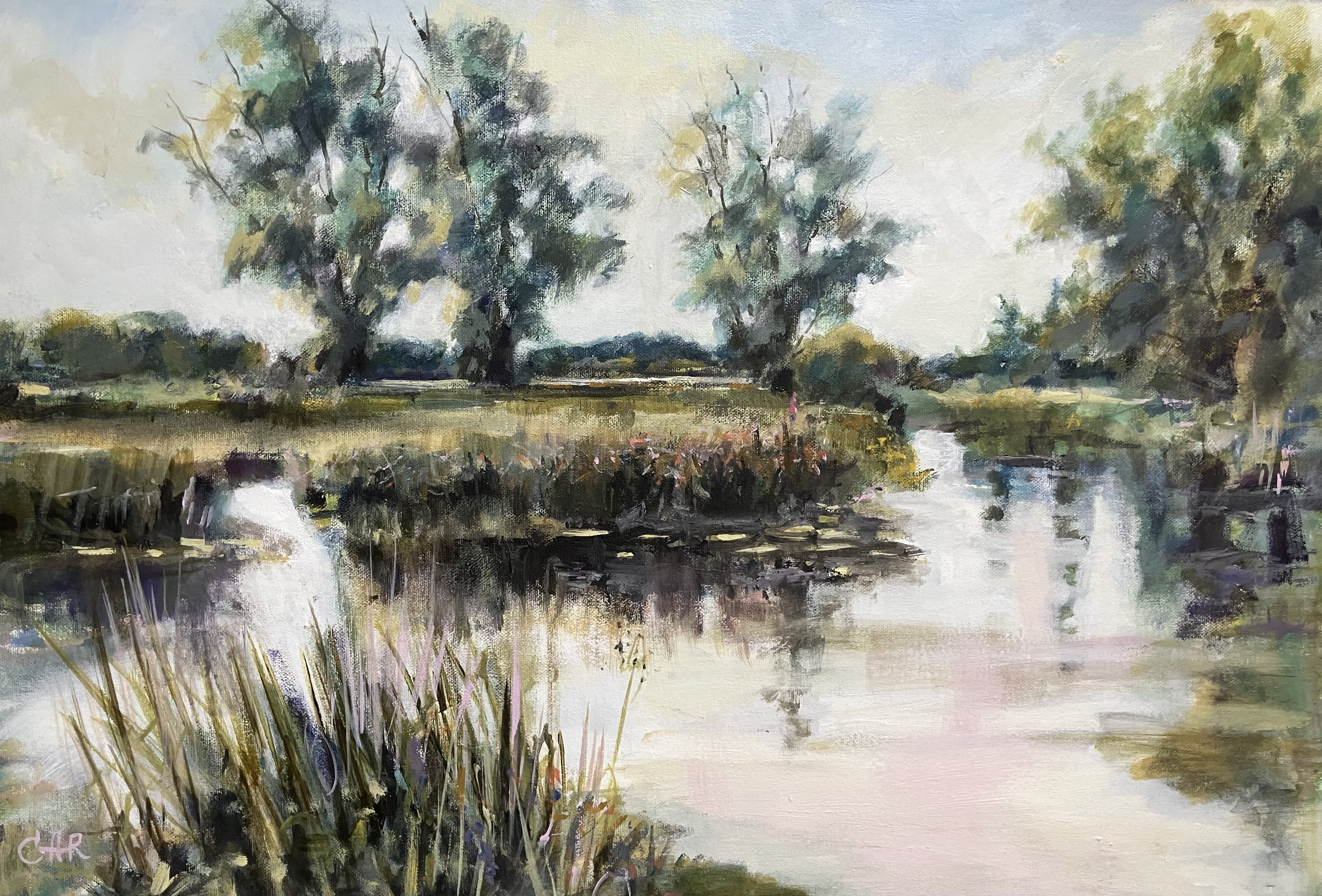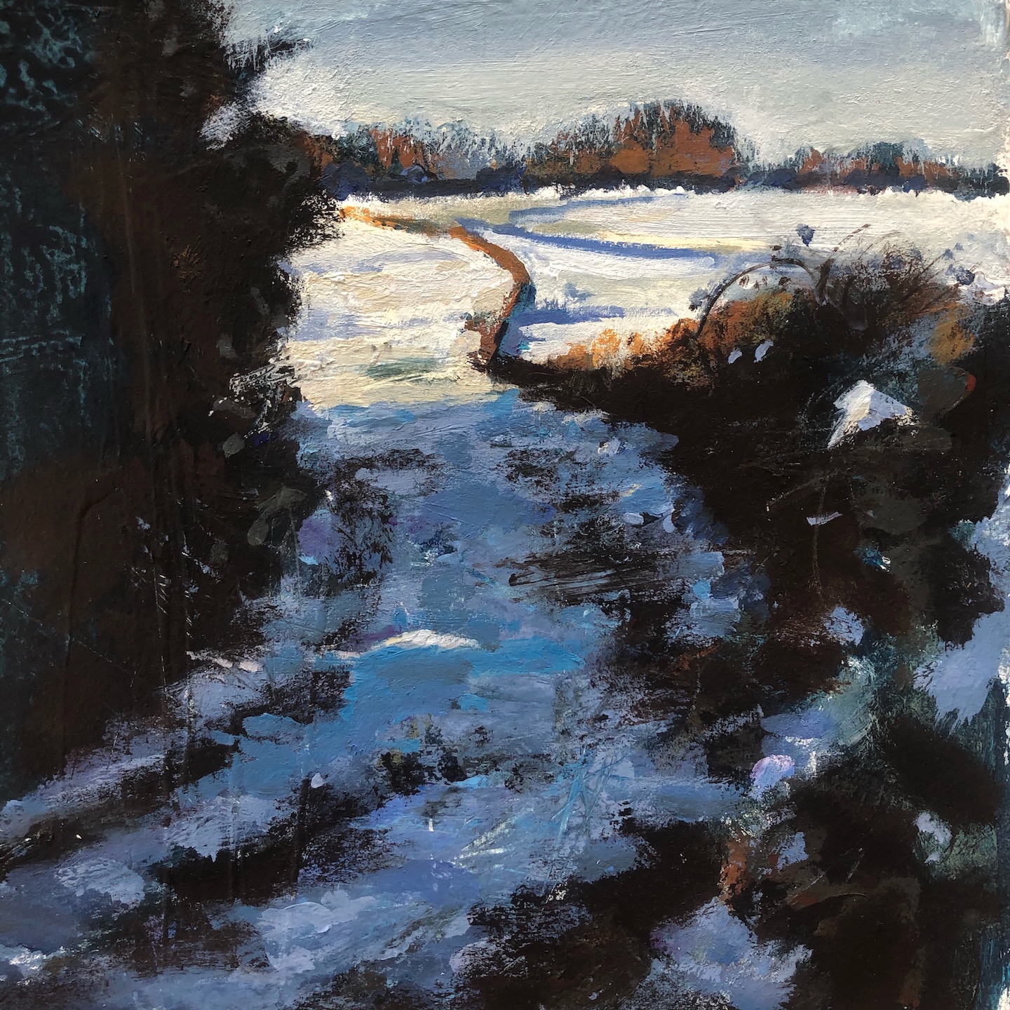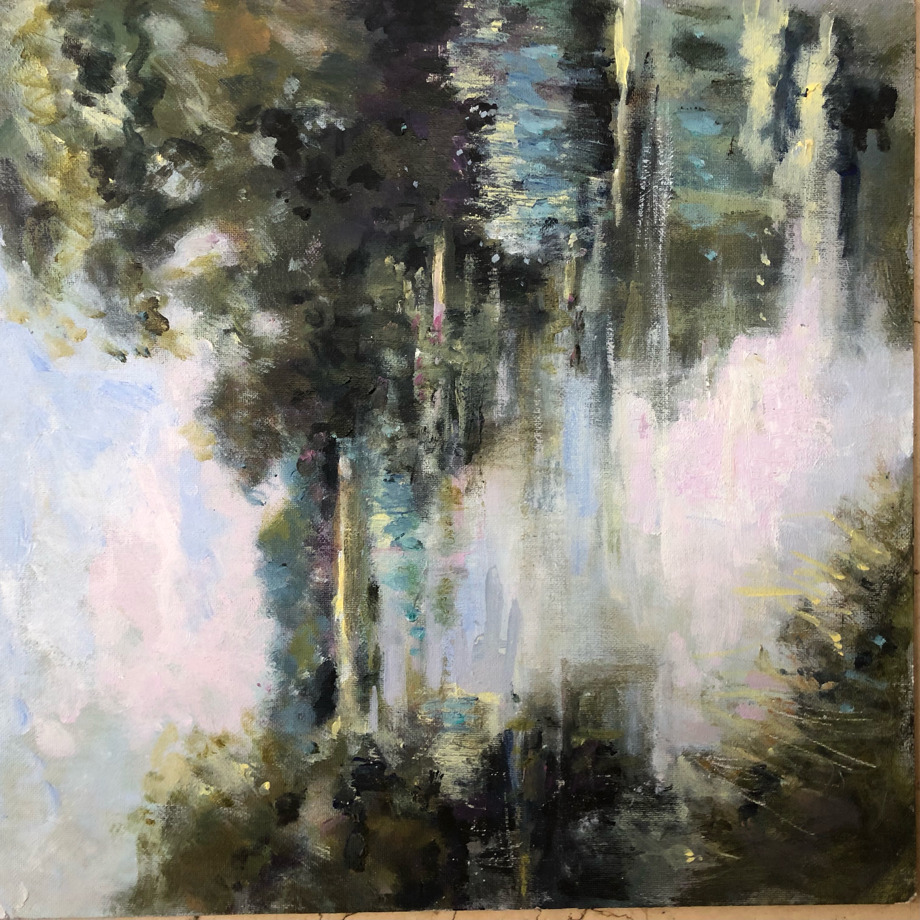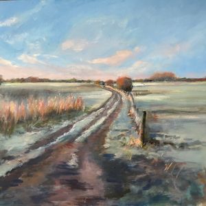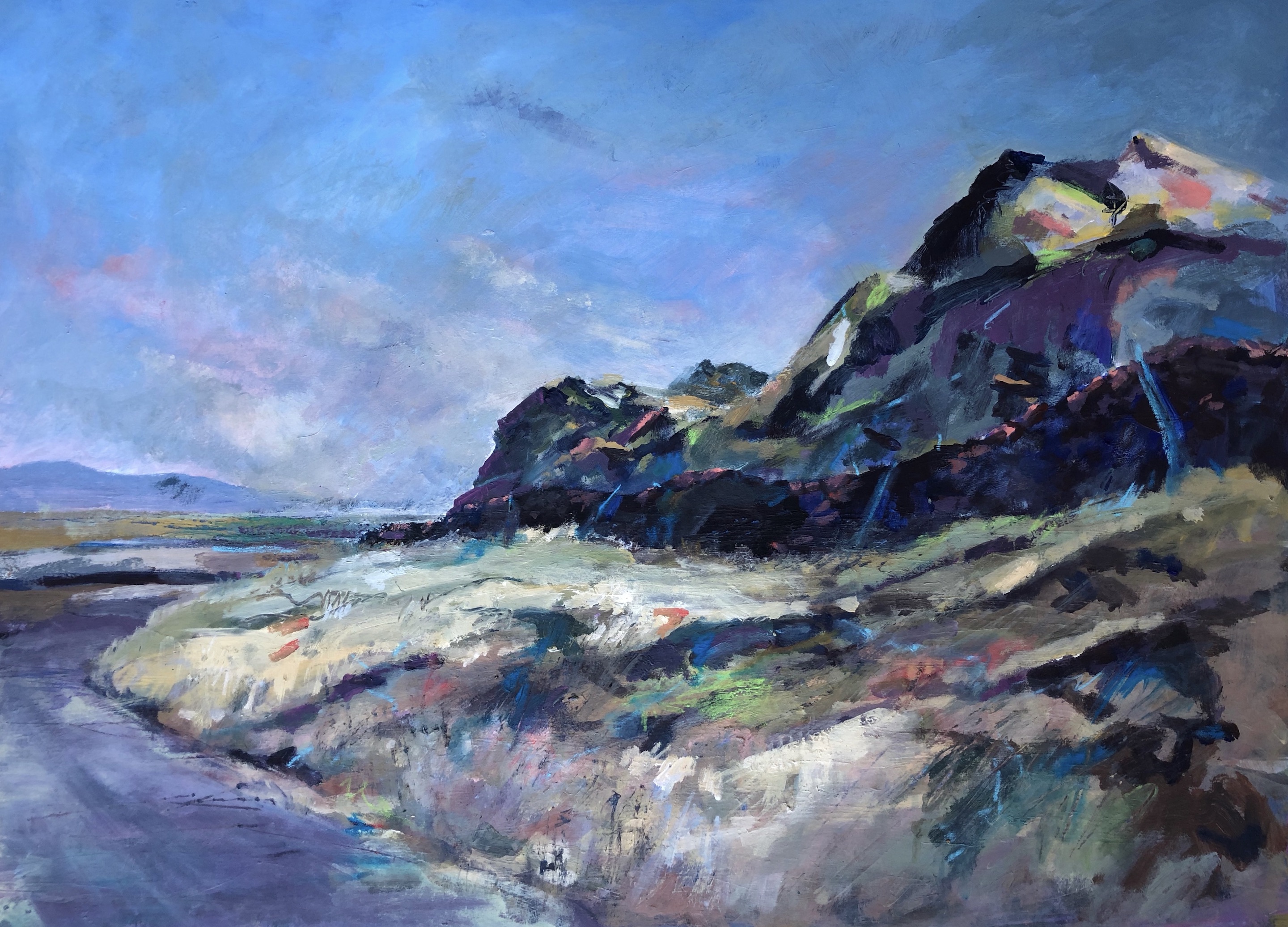I paint mainly in acrylic or watercolour, and sometimes with mixed media. I prefer to paint outside whatever the weather which can bring a whole new meaning to watercolour!