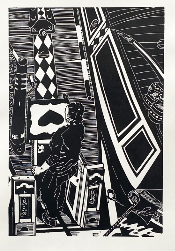 Working with Linocut also has this thread that connects the medium to the way life is lived on water. The process goes through transformations between two and three dimensions as the printing plate is cut and subsequently printed. This liminality emerges in the life of the boater. Life is not lived in one place but between places, moving from village to village, never a resident but never a stranger either. It is the transition that Charlotte enjoys, stories evolving and changing. Like the water, like the material and like the audience and narrator. Somewhere an image is remembered from the journey and that is what becomes a print.