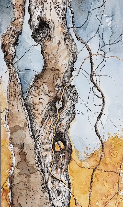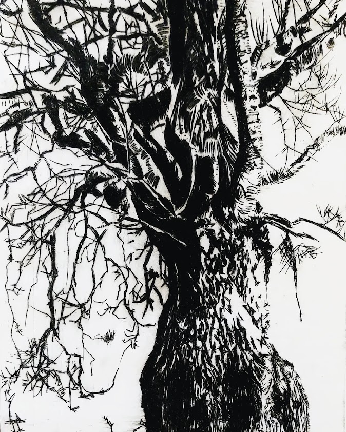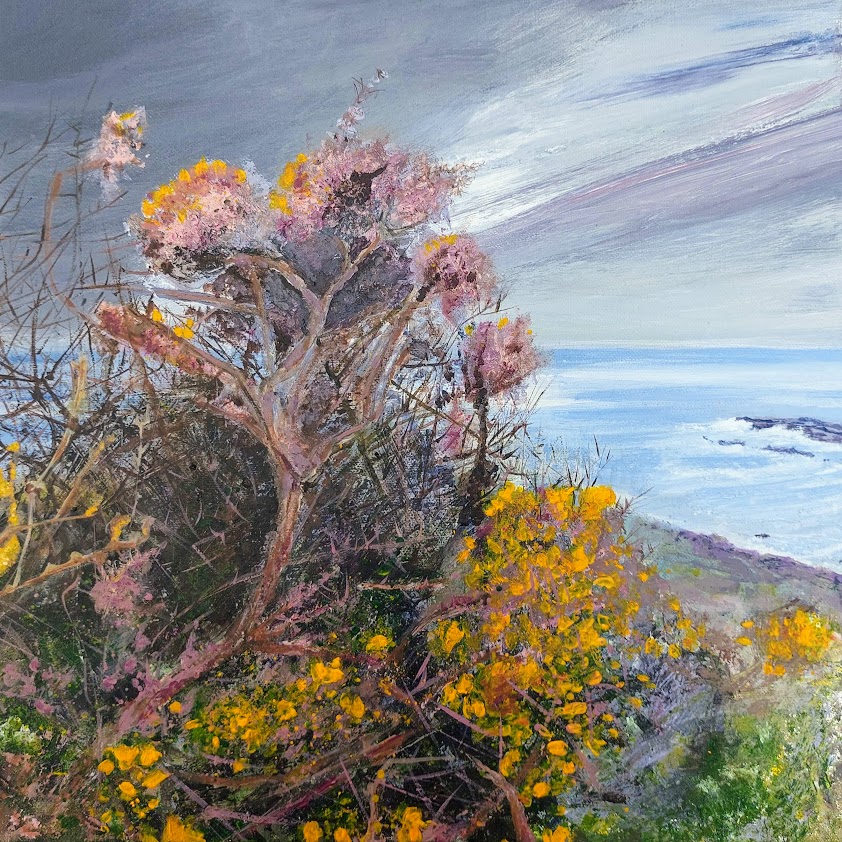 Garden flowers, gnarly ancient trees and weather worn branches, shaped by the elements excite me. I am drawn to woodland, coast and wild, untamed places, where I can seek out and investigate the tangled forms of trees in an overgrown spinney or the reflections in a field margin pond. When landscape painting, I use oils, acrylics or watercolours, often taking inspiration from rural Britain. Employing a range of tools including palette knives, mop brushes rounds and filberts allows me to create gestural marks, colourful washes and expressive brushwork. I love to capture the intense detail and natural textures of trees, combining micron pens with inks and watercolours on heavy cold pressed papers. Furthermore, stepping out from my home studio takes me directly into the cottage garden where I sketch and experiment with compositions for lino designs and drypoint plates. Home-grown flowers and their seed heads are fun to carve and incise as they provide exciting lines, shapes and forms - perfect for relief and intaglio printmaking. My artwork is certainly a result of my passion for gardening and the natural world.