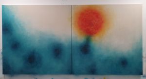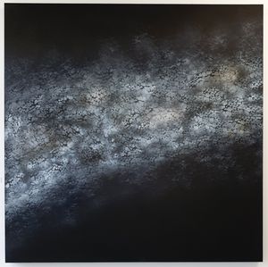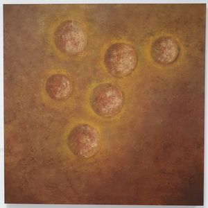 The paintings hint at the shapes of microscopic images but have no set orientation and no fixed focal points. A suspension of shapes, with diffused repetitions, and a weightless, ethereal atmosphere, started in the science realm, but shifts the direction of the subject matter through interpretation and processes and elective responses.