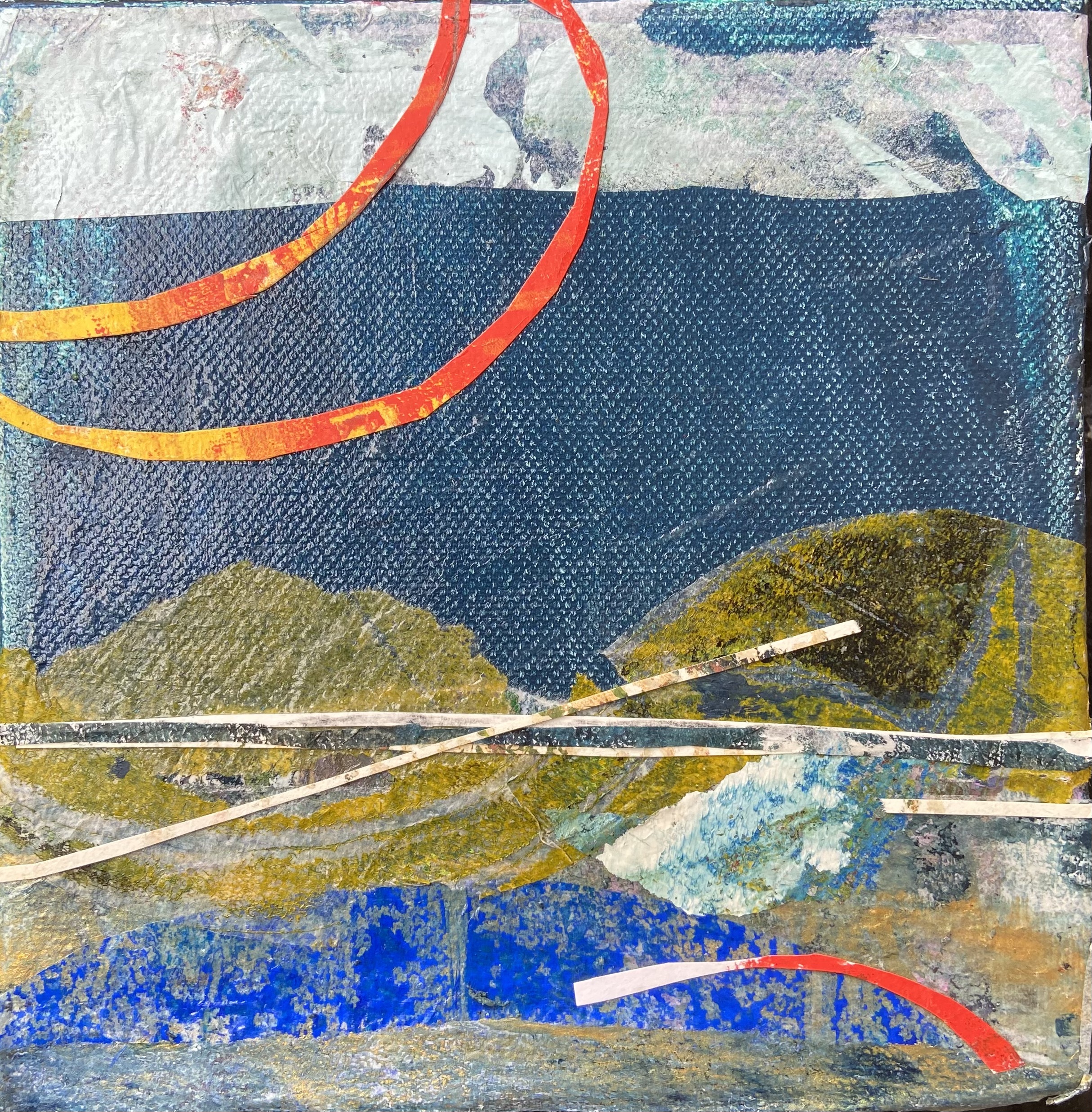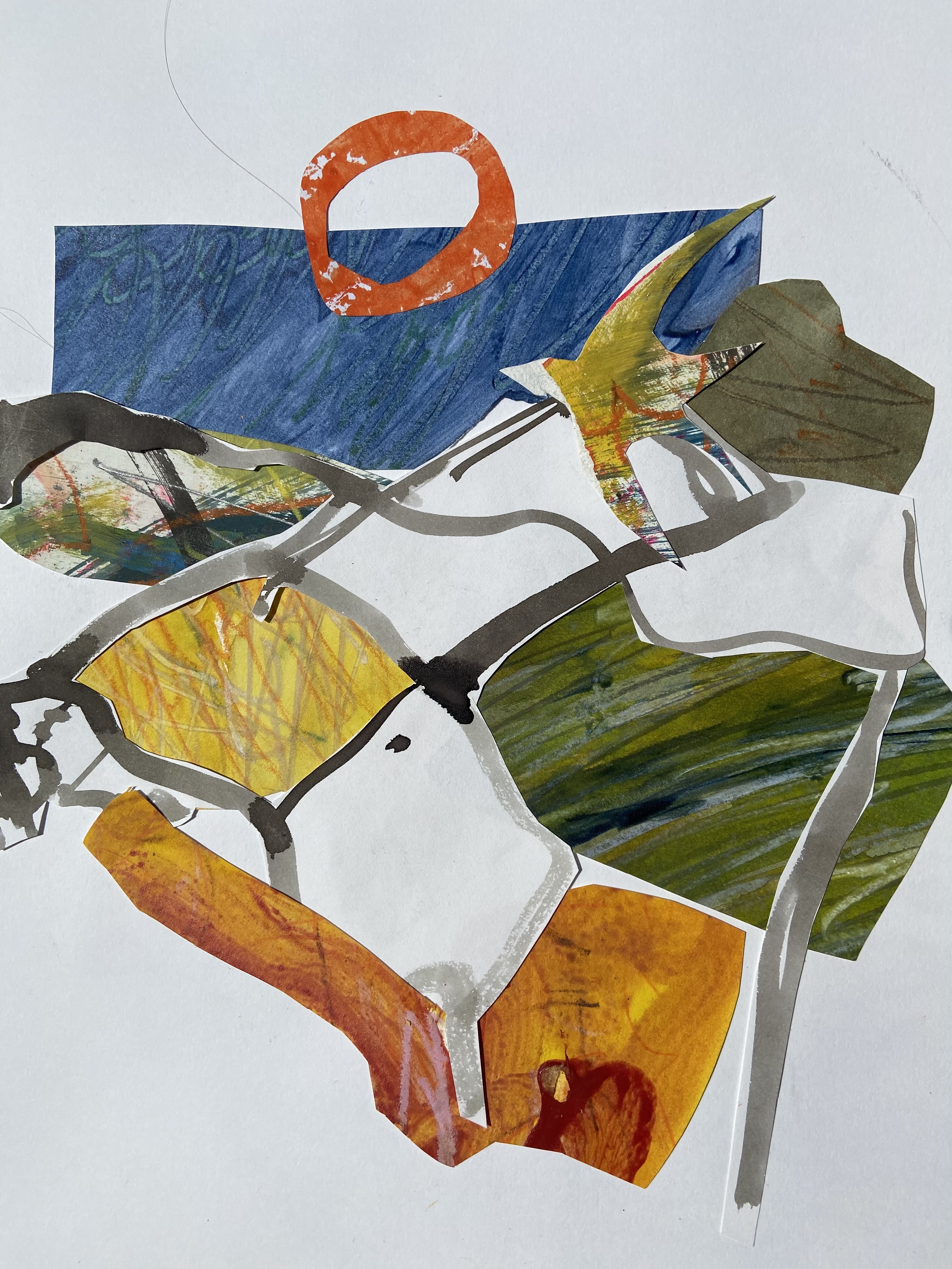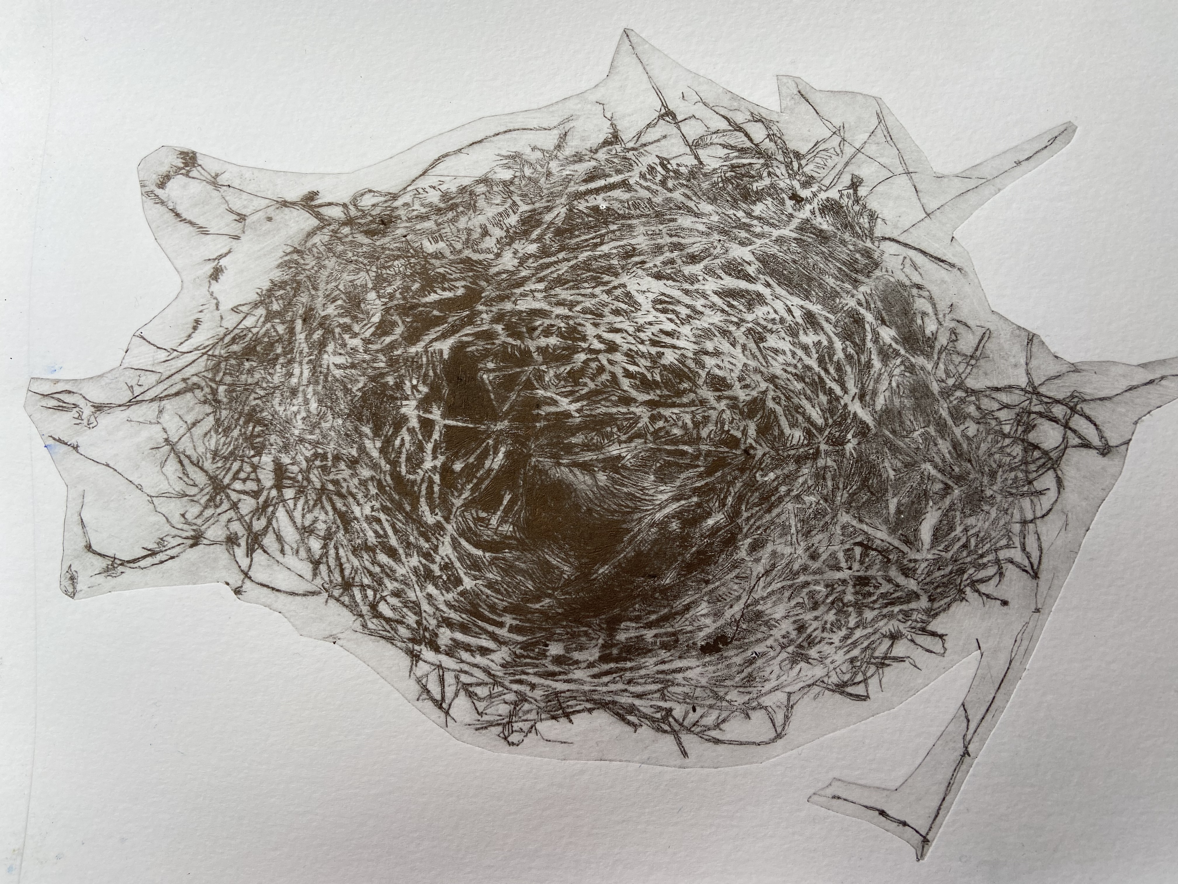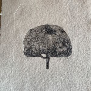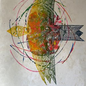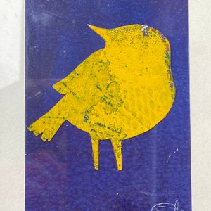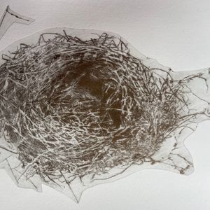 Donna Drouin is a printmaker, poet and painter whose work stems from an almost daily plein air practice of using inks, watercolours, pencils and found natural media. These observations are from places that she knows and loves in the surrounding landscape l she tries to capture an essence of being present in reworded spaces. The threshold of wild and domesticated places which bare the marks of human existence, from the bailing string repairing fences, wonky telegraph poles, to the ridge and furrow of oxen and farmer. She explores the Narrative of the Delphic marks of ancient river beds, where nature rubs uneasy shoulders with the human and birds watch the rhythm of life. Those marks and repeating forms become the bedrock of her studio practice. Where she pushes, pulls and manipulates the marks and words through the processes of collage, printmaking and painting. Donna is mindful of the environment in her work, and is constantly looking at ways of reducing her impact in her work, experimenting with making her own pigments as part of the process of carving, scratching and inking mirroring the drilling, broadcasting and harvesting of the landscape, the current print works are exploring using repeating motifs of bold abstracted bird forms containing and overlooking the topographies that they inhabit.