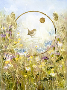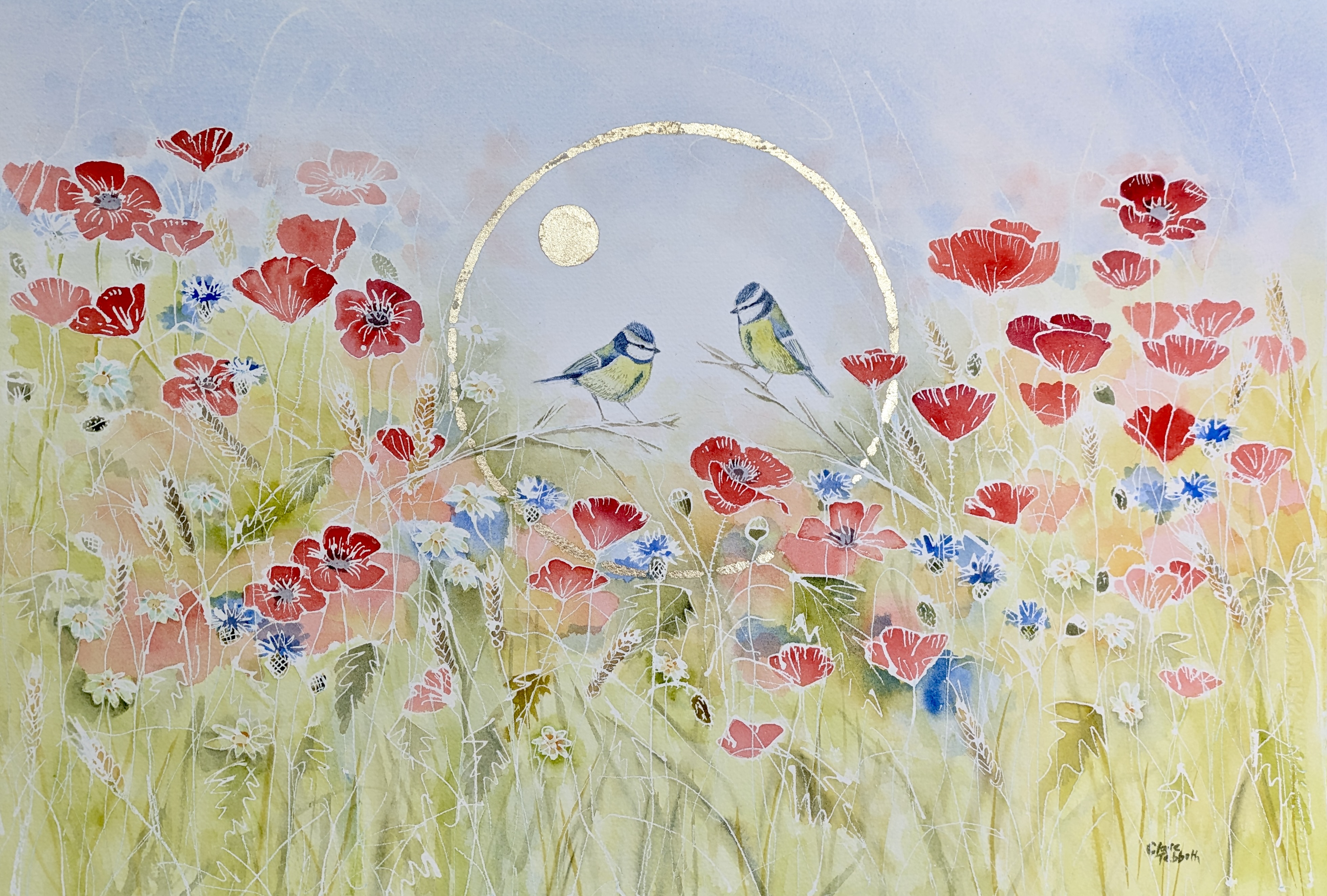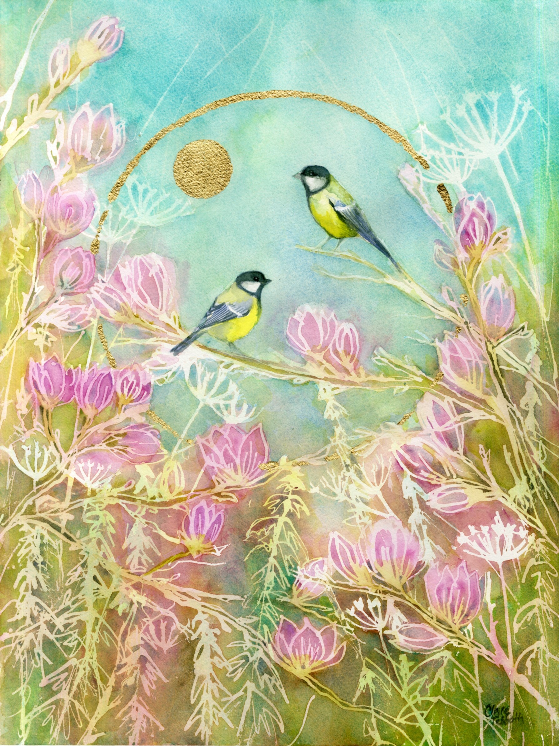 Using highly pigmented watercolours on 100% cotton paper, each painting goes through a process of careful colour selection to ensure each has a unique colour palette of its own to match the mood, season and nature depicted. Working expressively, using large brushes dripping with water, colours are allowed to mingle and create new and often unpredictable effects. Her use of drawing gum providing an underlying structure to control this loose effect. More recently this has involved gilding with gold leaf to spotlight the birds often depicted in her work