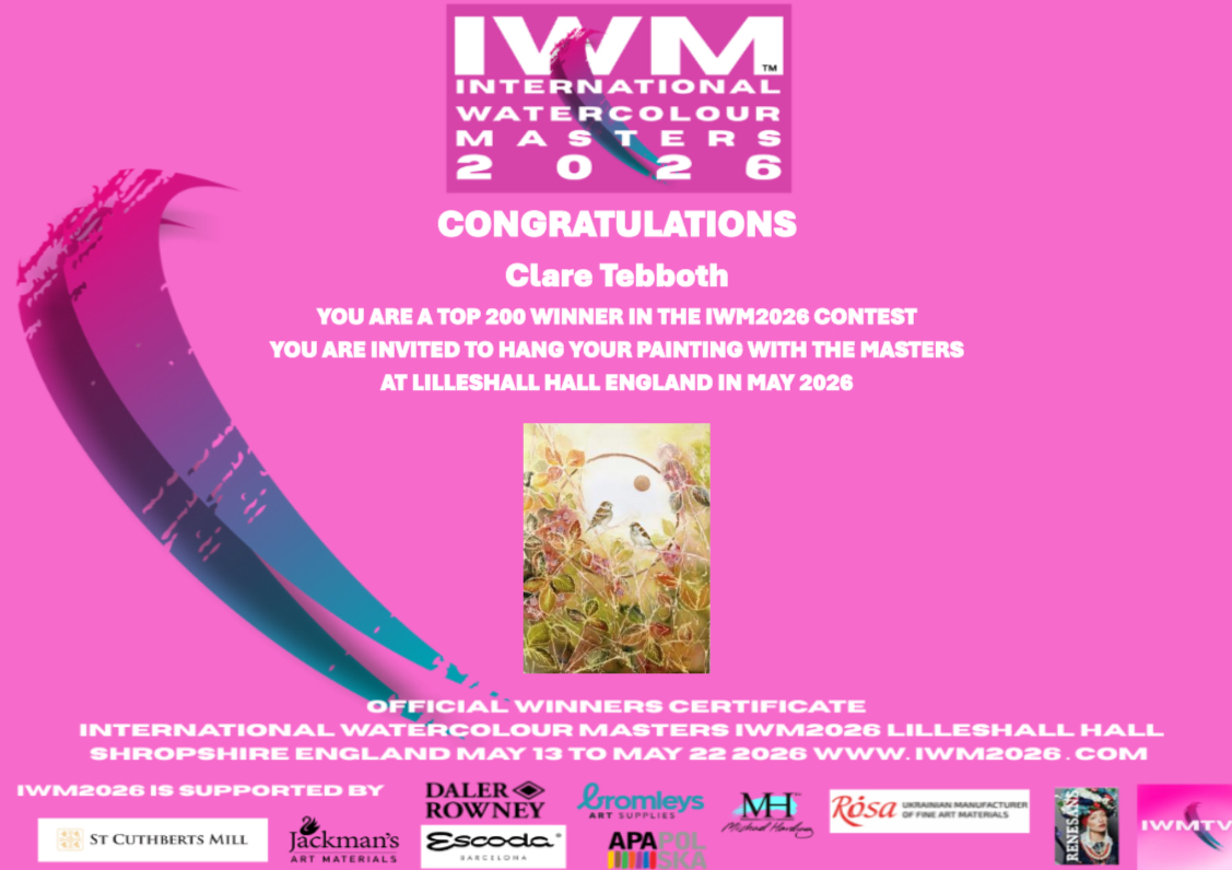 Clare has exhibited with the Royal Watercolour society at the Bankside Gallery, at the Green and Stone Gallery, Chelsea, and was shortlisted for the Royal Institute of Watercolour exhibition at the Mall Galleries. Clare is an International Watercolour Masters 2026 winner and will exhibit alongside the world's watercolour masters in the elite IWM exhibition next May at the beautiful Lilleshall Hall, Shropshire.