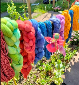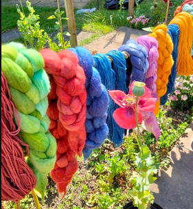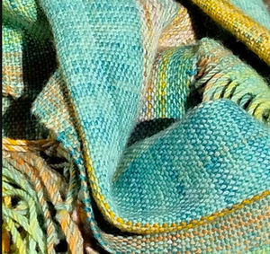 By 2015 following early retirement I was a trustee of the Association of Guilds of Weaving Spinning and Dyeing, convenor of the 2015 summer school (which led to many friendships with other fibre artists and becoming Programme Secretary for the Stratford upon Avon Guild of WSD for several years). I completed the challenging AGWSD Certificate of Achievement in Spinning in 2018, having learned how to spin fibres from flax to recycled bottles. I also dived into weaving (by now I had 8 wheels and 6 floor looms!) and during COVID took up machine knitting using vintage flatbed and circular machines.