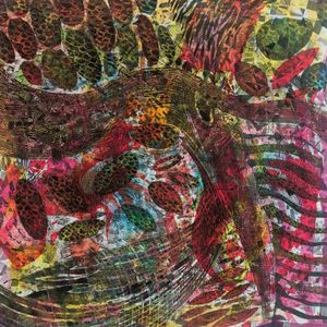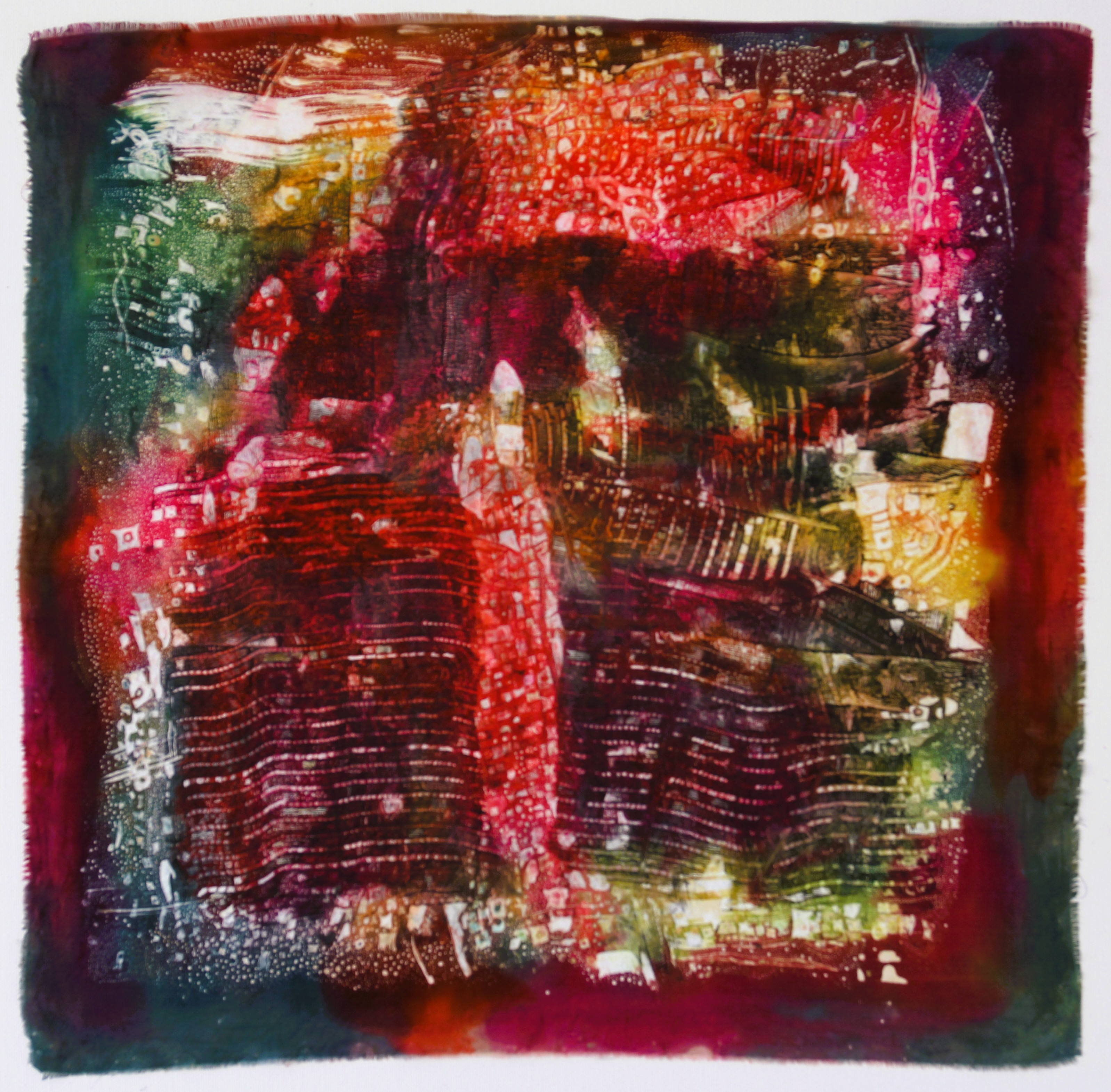 For me, the unique interaction of the wax resist, discharge medium, and dye on the fabric and all the 'chance elements' that happen along the way inspire me to constantly explore its potential as an expressive art medium. My recent works have been an exercise in risk-taking, deliberately bypassing the thought processes with those of feeling, often incorporating other mediums such as mono-printing and collage.