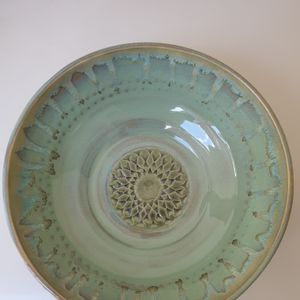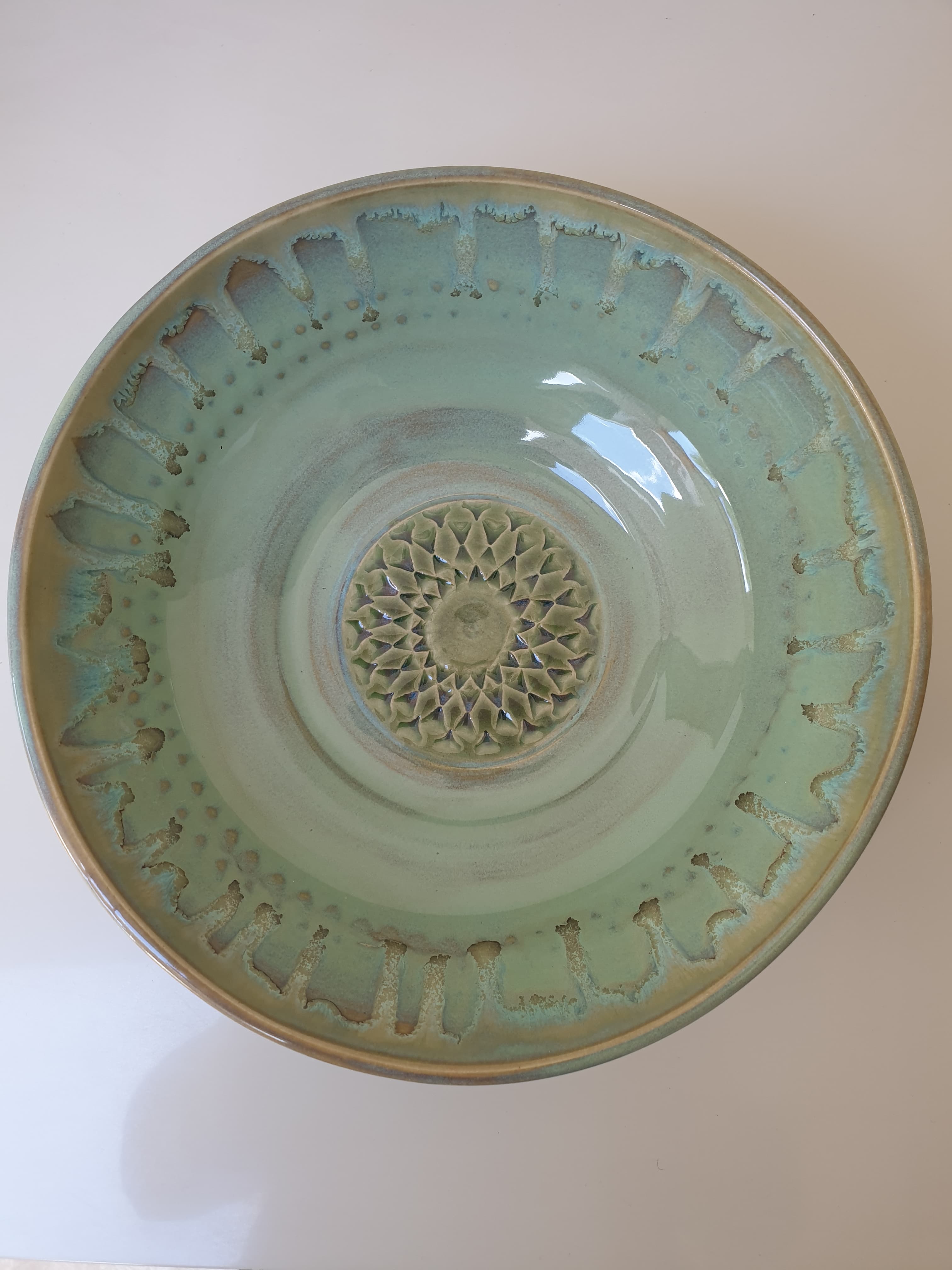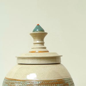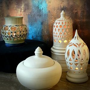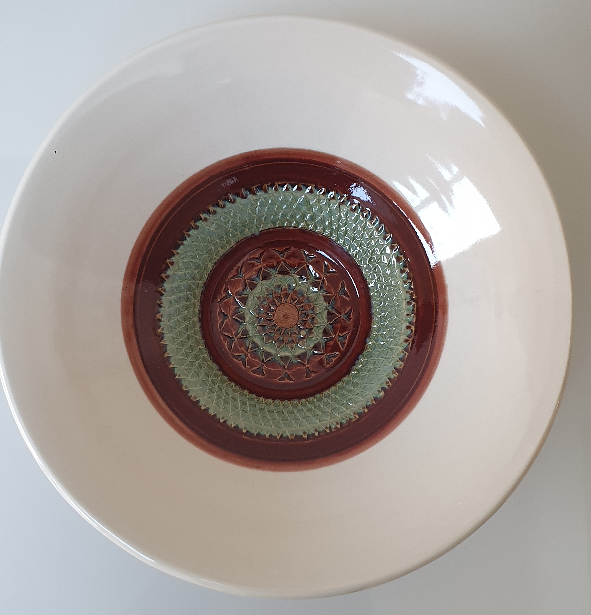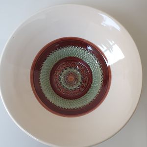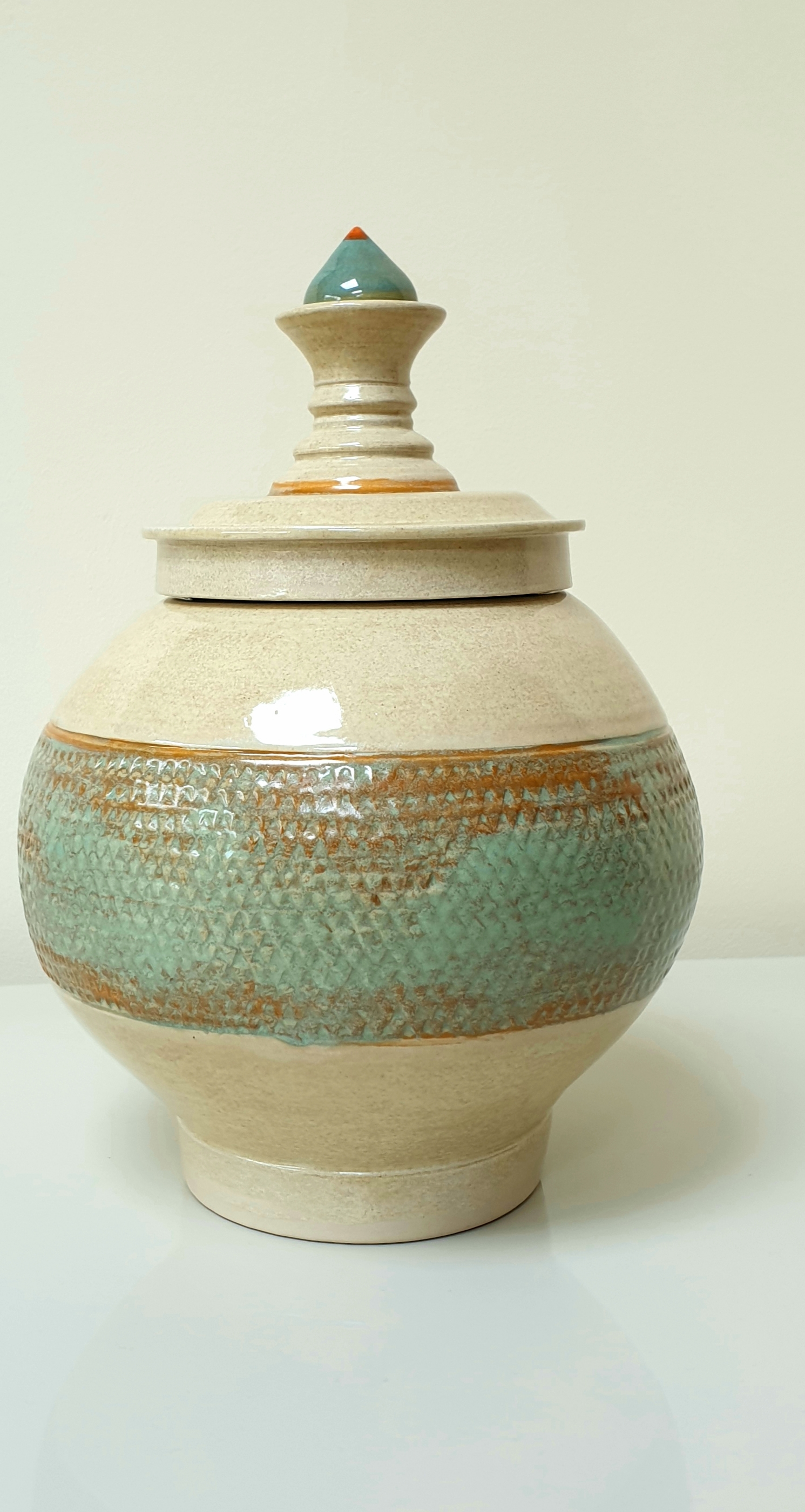 Sabari uses a highly versatile white-bodied clay which matures between 1160-1280 degrees. For her ceramic artifacts and as an artist concerned about her environment, she is particular about keeping the glazed surfaces of her ceramic wares chemical-free and safe for use as kitchenware. Her richly glazed kitchenware or artifacts to be showcased in homes, offices, and festivals are refreshing works of art which speak of homely comfort and a subtle beauty and charm coupled with functionality.