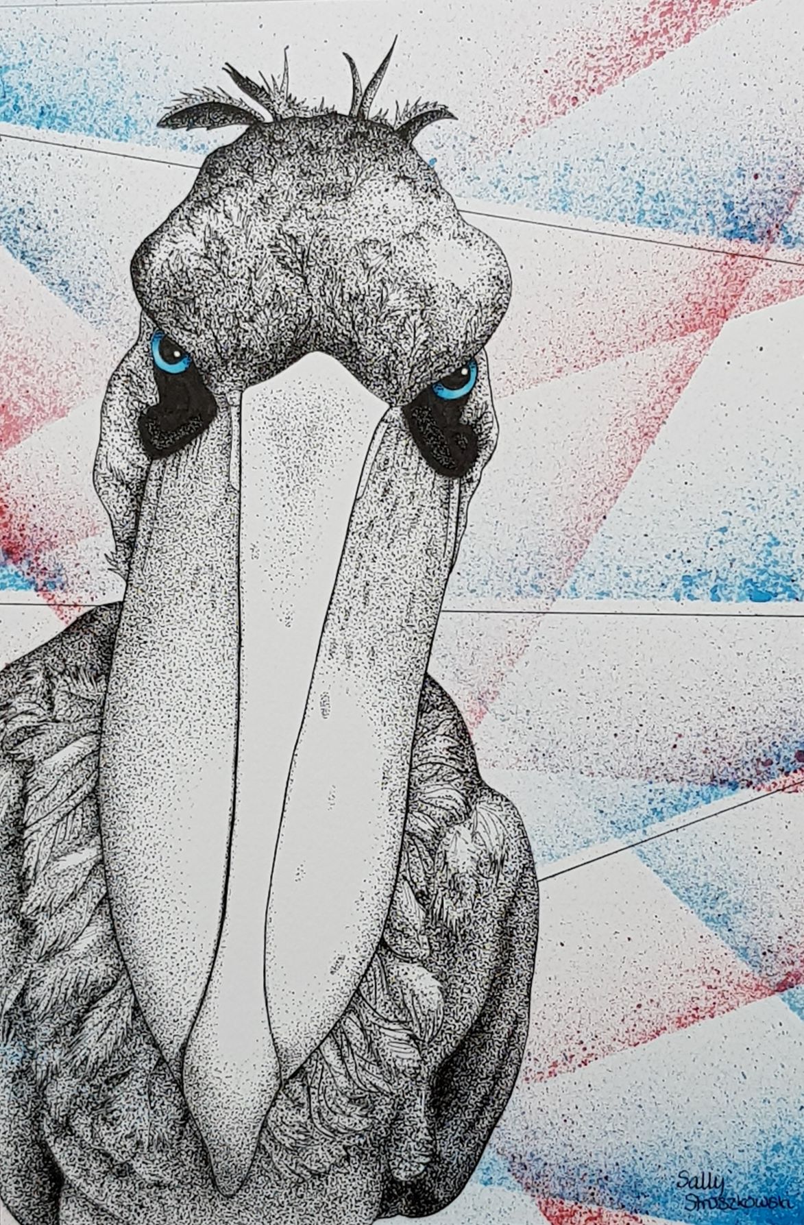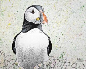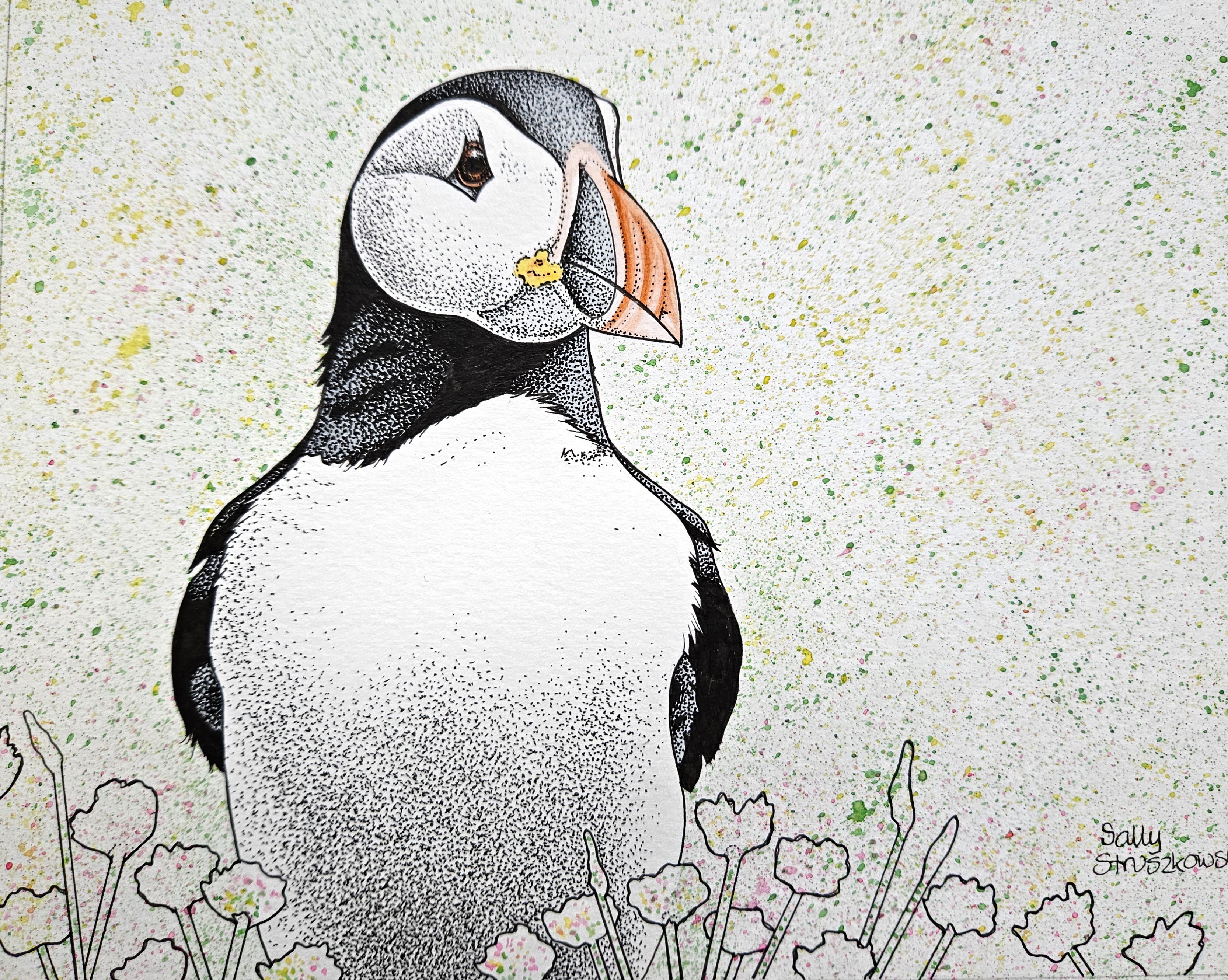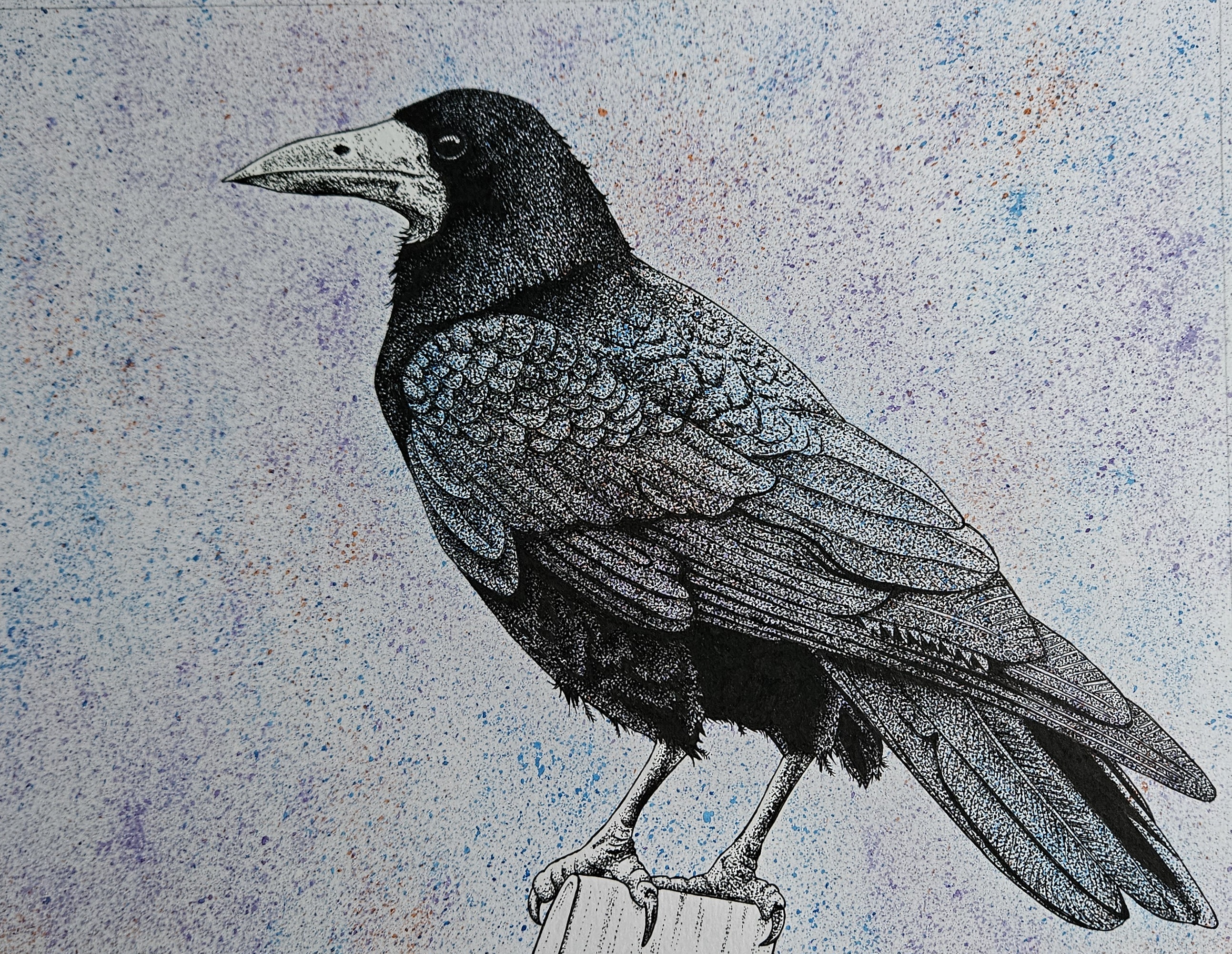 With a love of nature I like to represent the subject in a realistic, but fresh, sometimes fun, and dramatic way. I draw with pen and ink, often using splattered watercolour as a background.