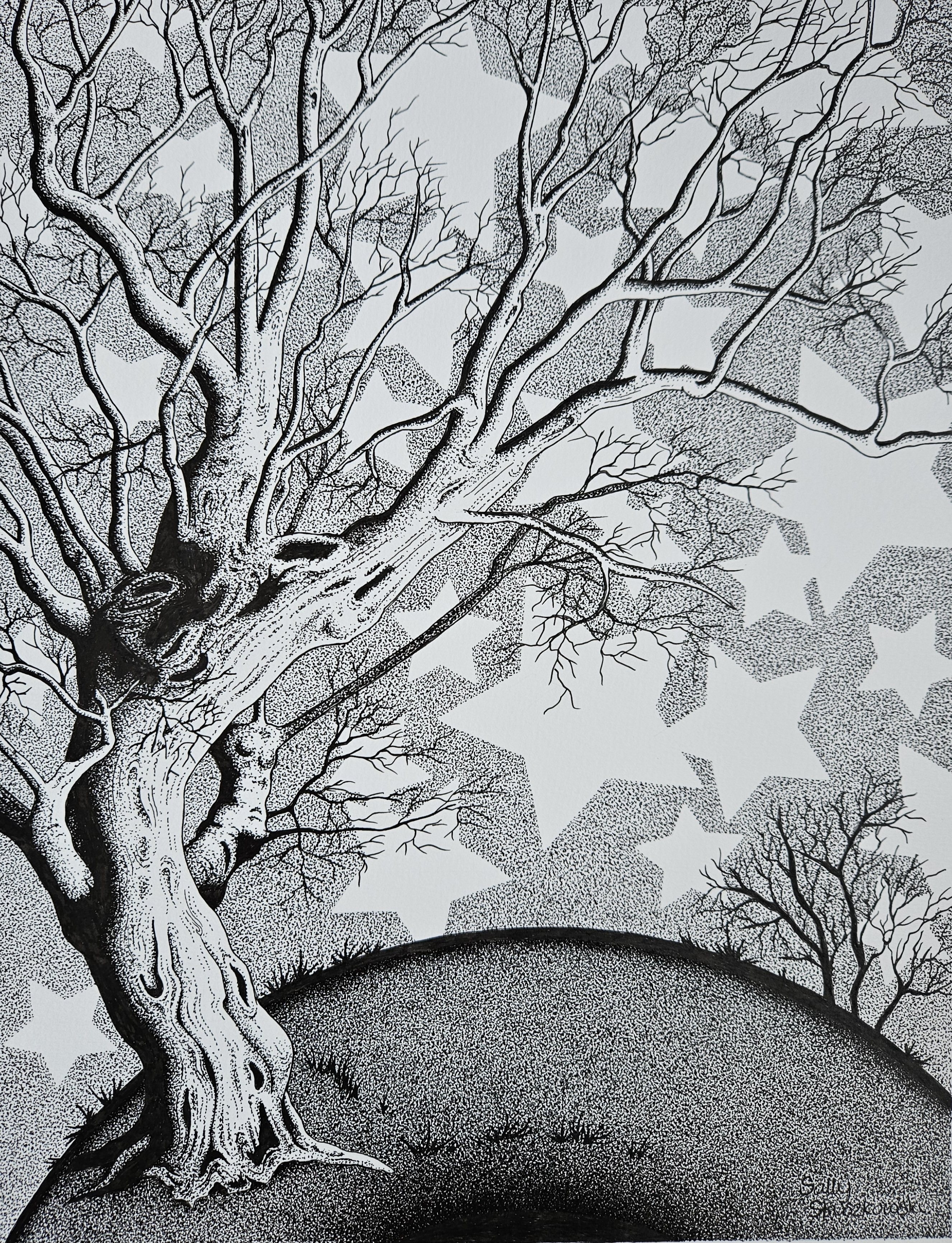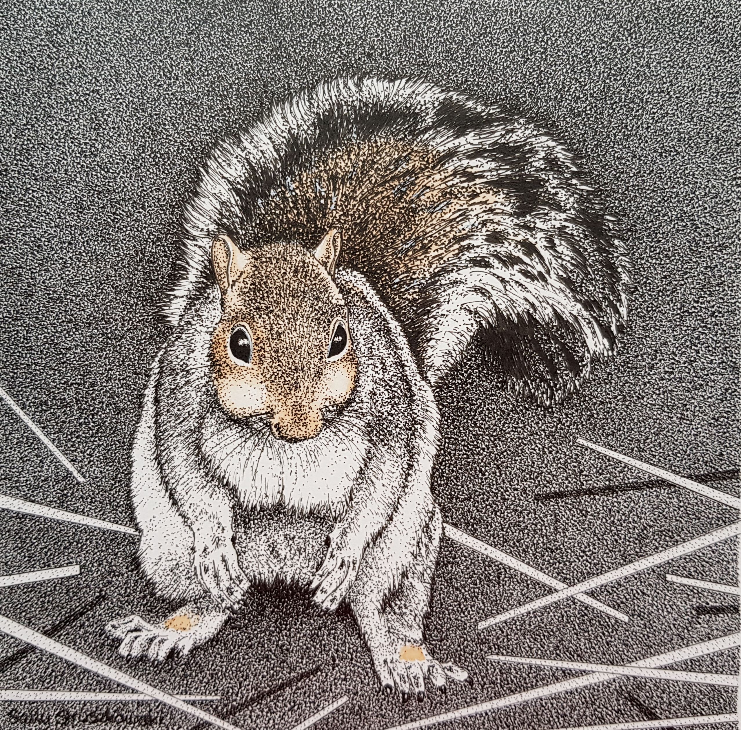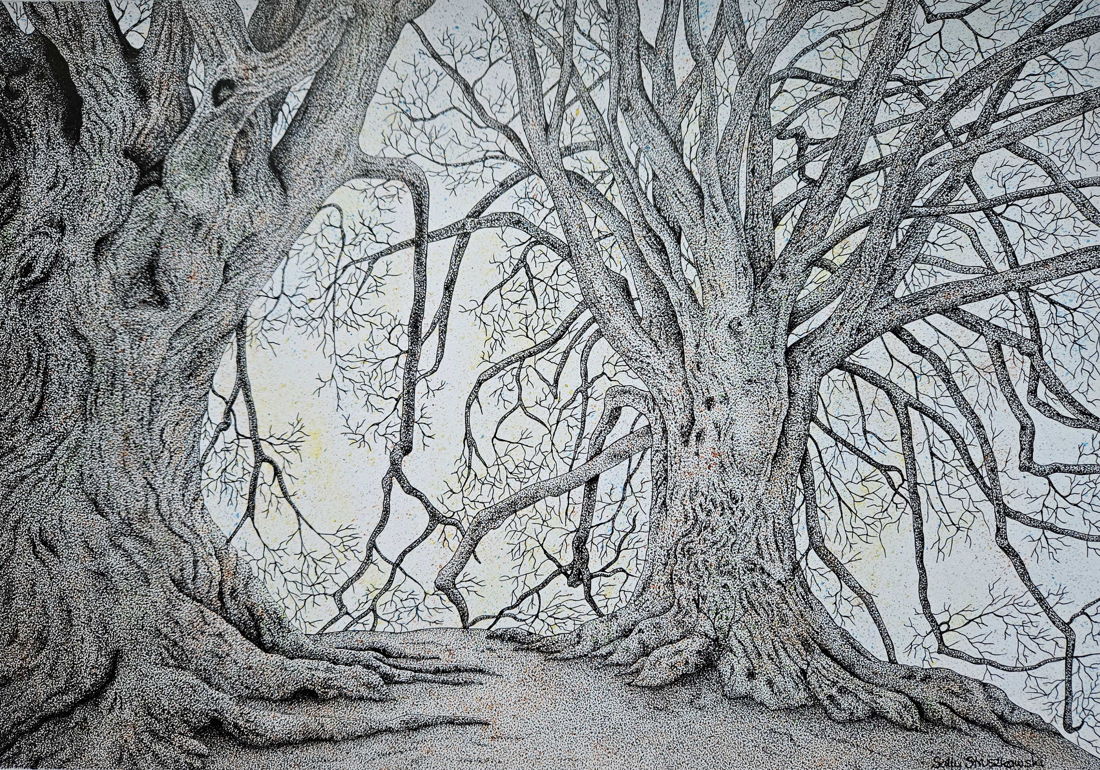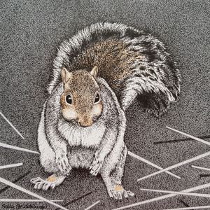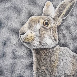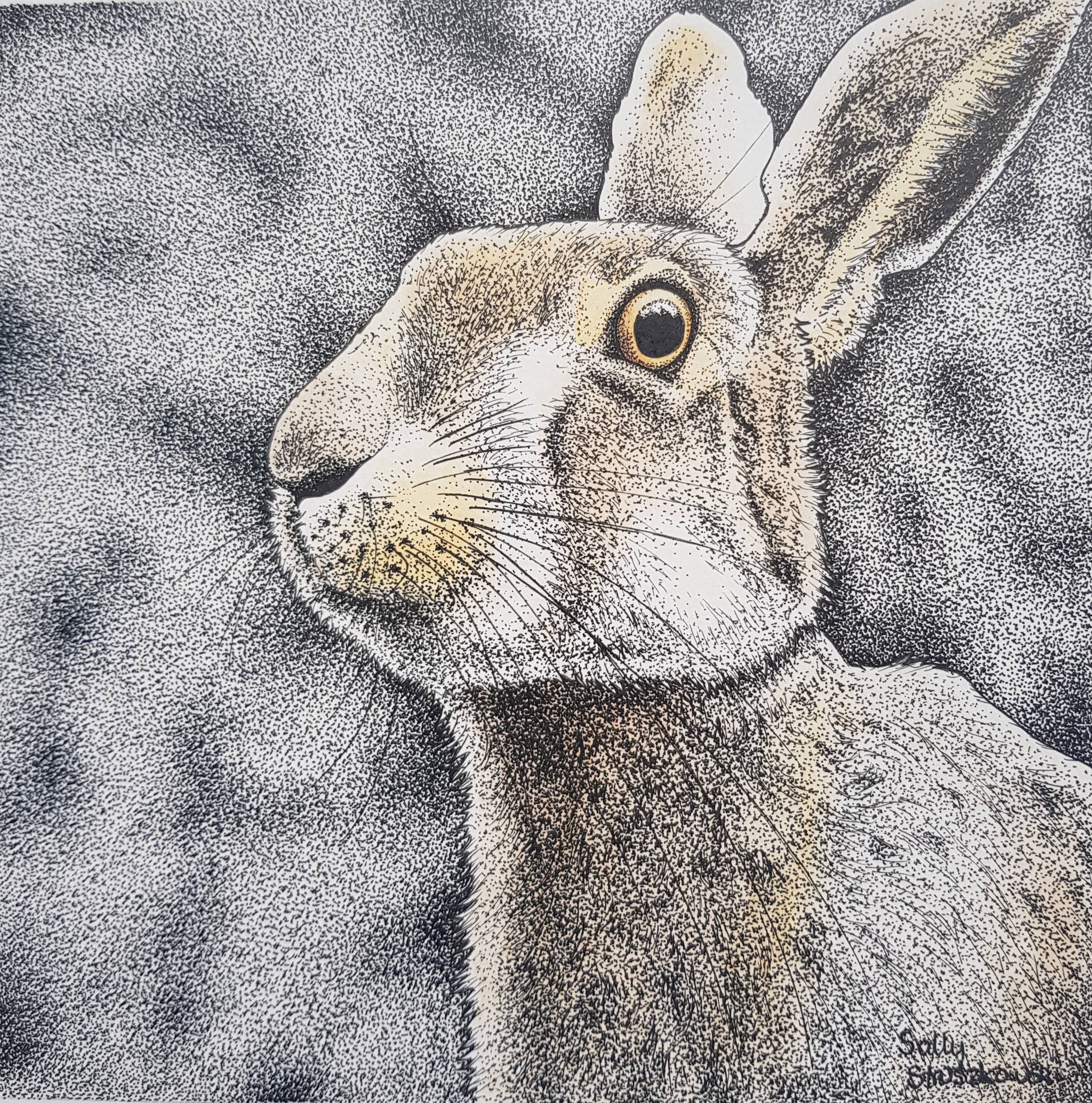 My artwork is produced using pen and ink and watercolour. I draw rough outlines in pencil and then go over them in ink. The detail comes last as I build up texture and shadows with individual dots, the personality of the subject slowly emerging. Subjects have usually been animals and birds, but now I include trees and people. I like to represent the subject in a realistic, but fresh, sometimes fun, and dramatic way. I have always loved nature and it has always been a significant element in my pictures. A walk in the countryside and spotting different birds and animals has been a favourite pastime since childhood and provides my inspiration. I get great satisfaction in capturing the character of my subjects.