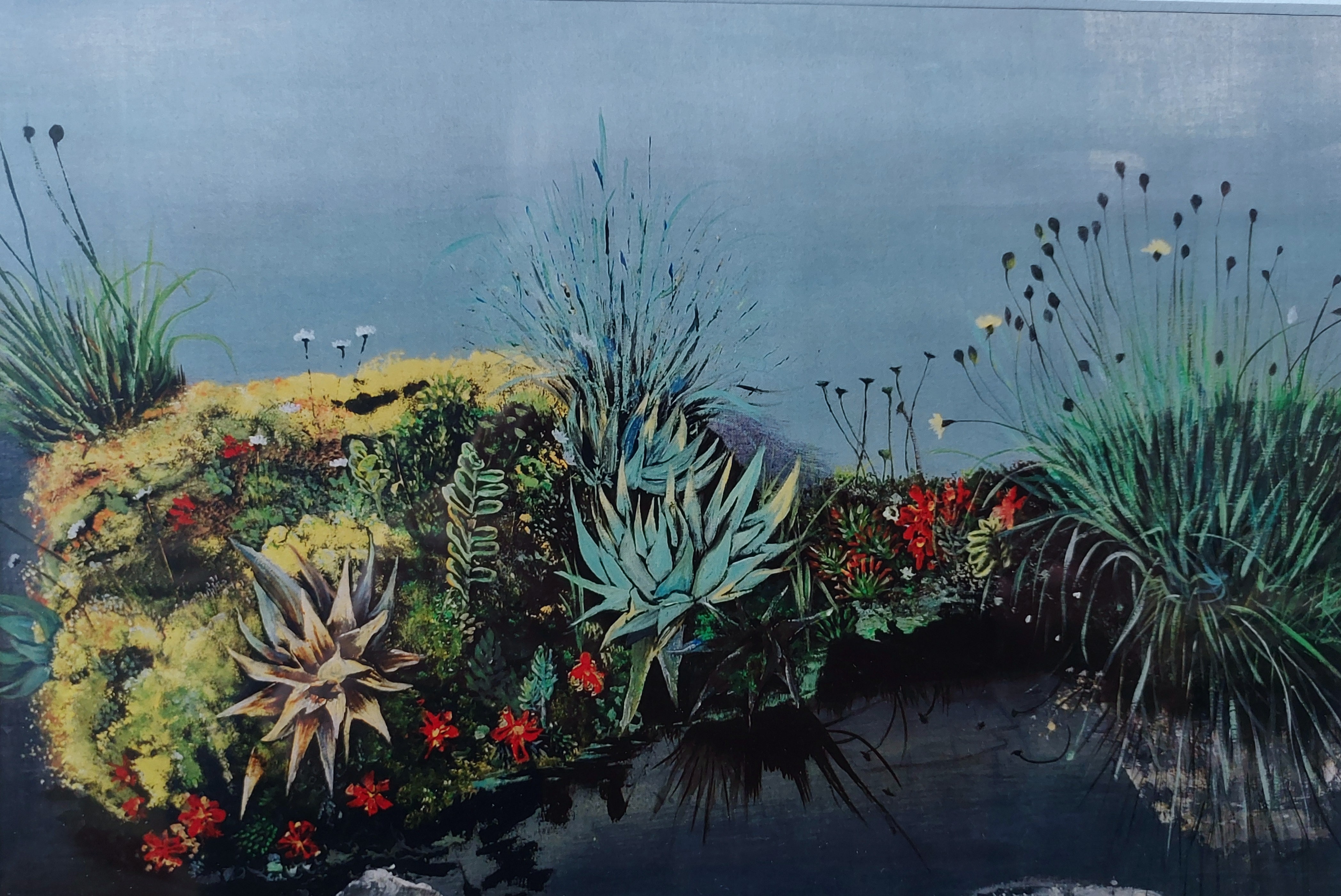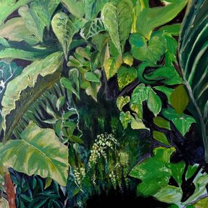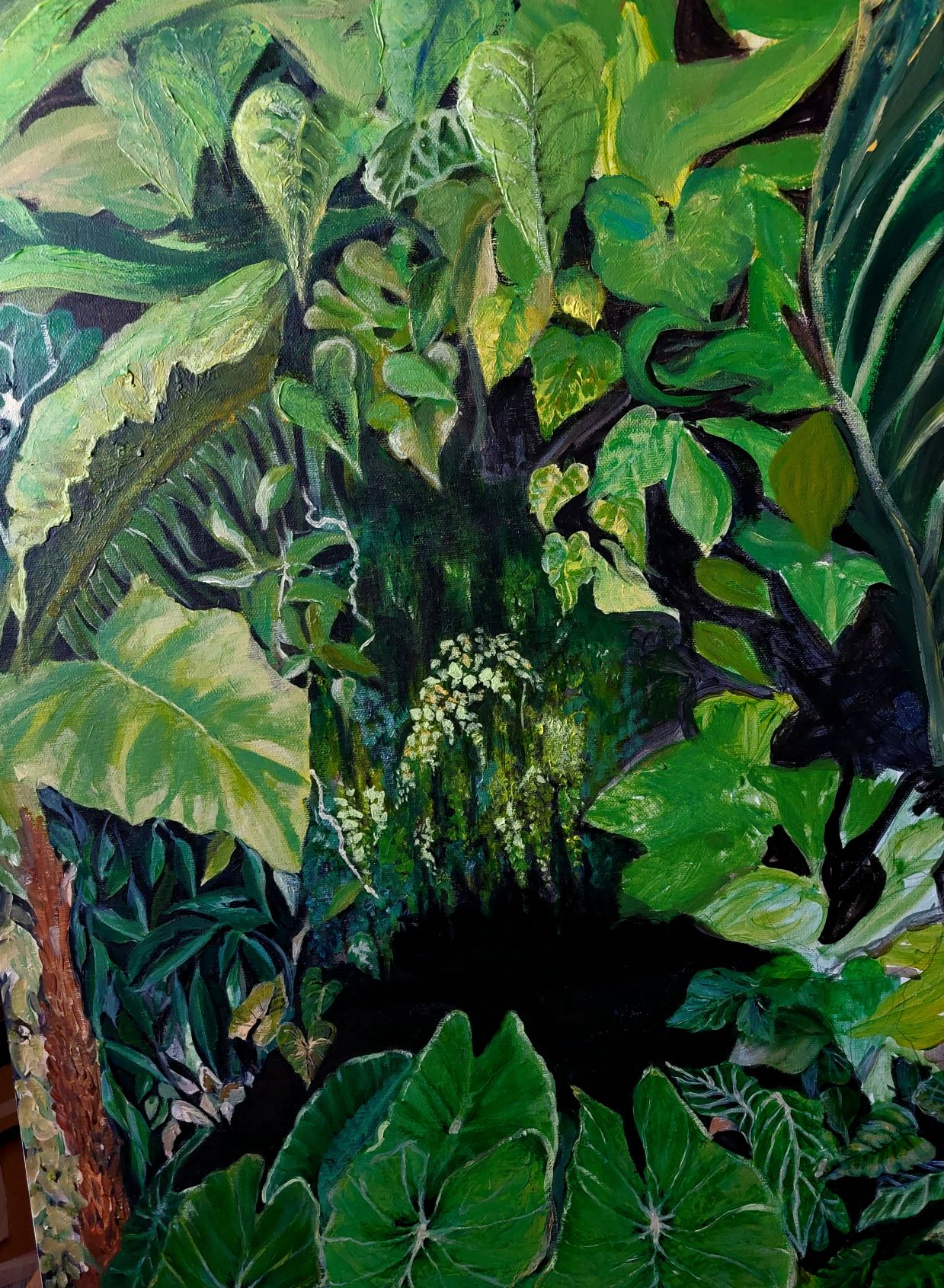 I love plants and am concerned about the loss of tropical and hardy forests. Therefore, I like to paint plant life as a kind of record in case of loss. Life issues such as Covid 19 were and are traumatic for our populations, and I felt like "Saving Lives" responded to the speed in which vaccinations were developed to control the pandemic - an assemblage of basic laboratory apparatus and a bed of vials for the product.