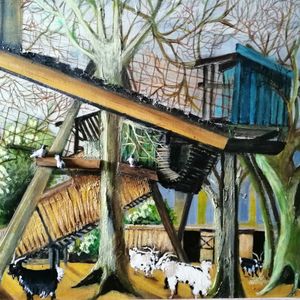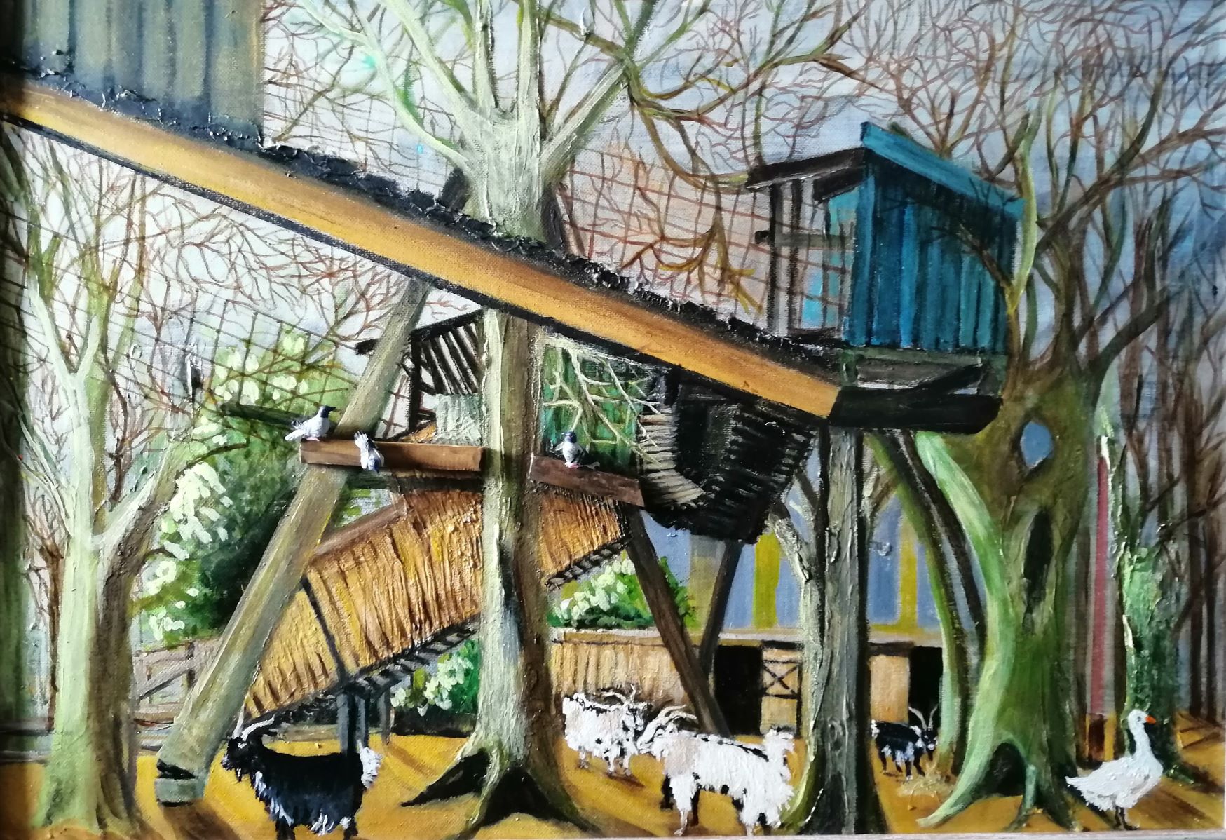The painting of Wicksteed Park Goats was part of a project to promote Wicksteed centenary. I chose the goats in their pen because I thought they were a bit distanced from all fun areas. I like goats, and so they were my choice. I also liked the rickety-looking walkways.