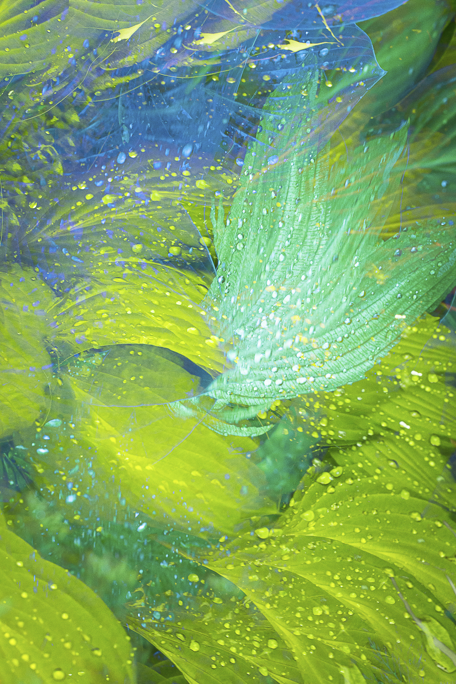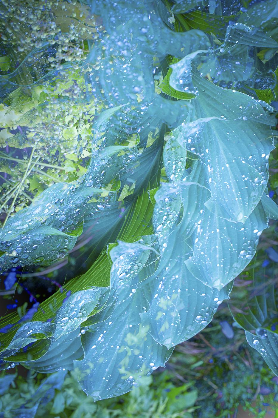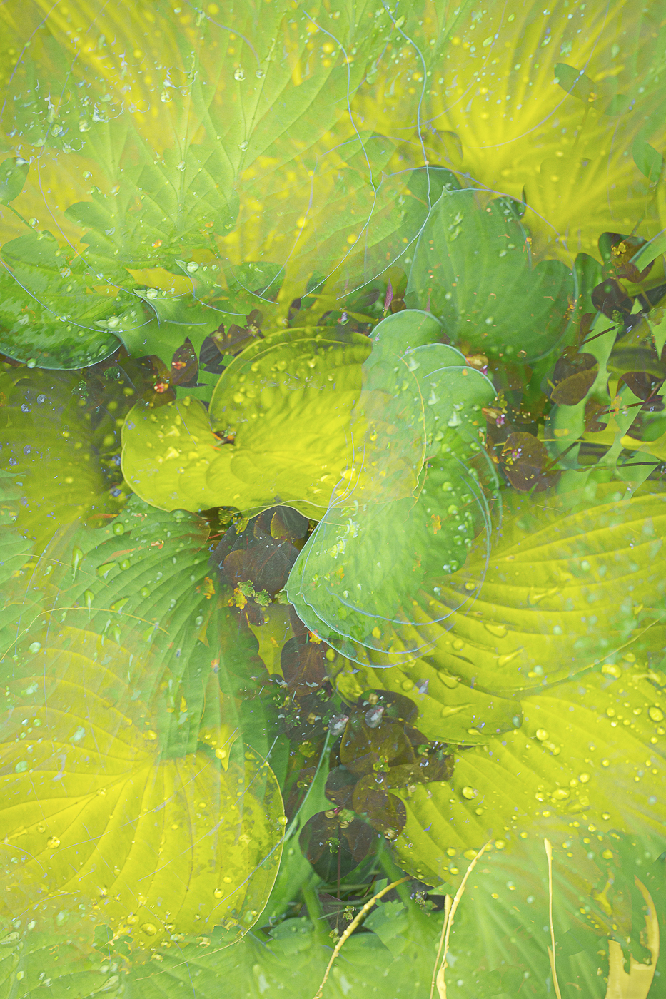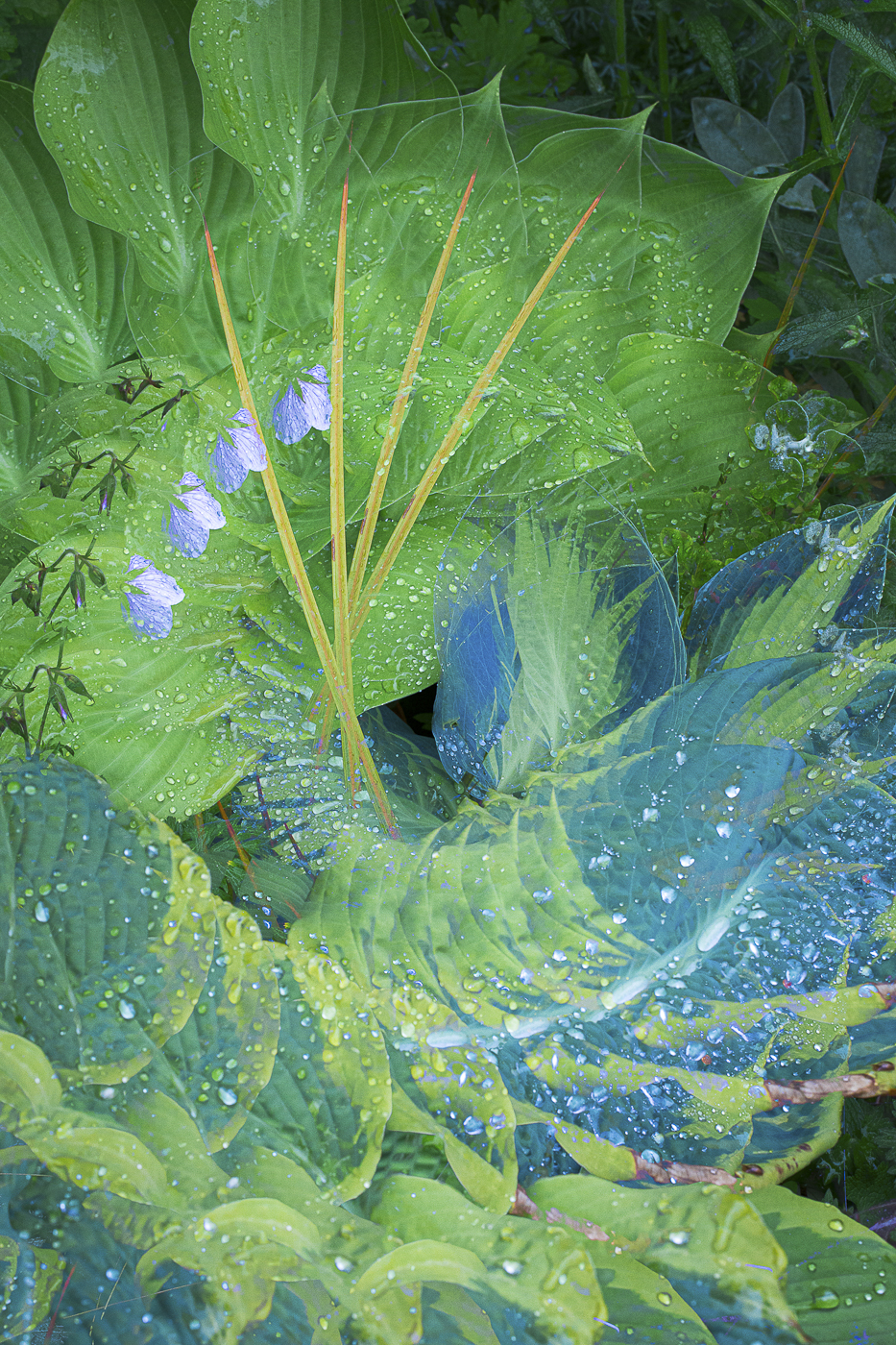 There are always images waiting to be created, even early on a wet June morning. Pots of Hosta, Heuchera and Libertia on my patio, each with their own distinctive leaf shapes, textures and colours, were transformed as rain droplets collected on them, with the gloom accentuating their colour.
