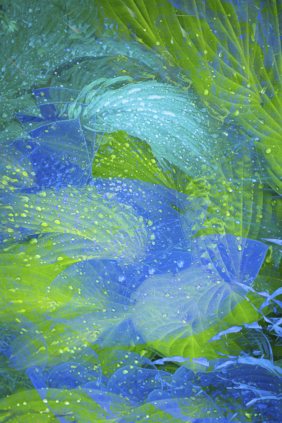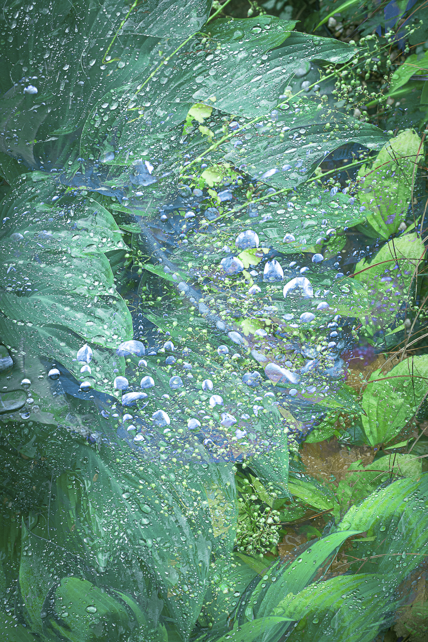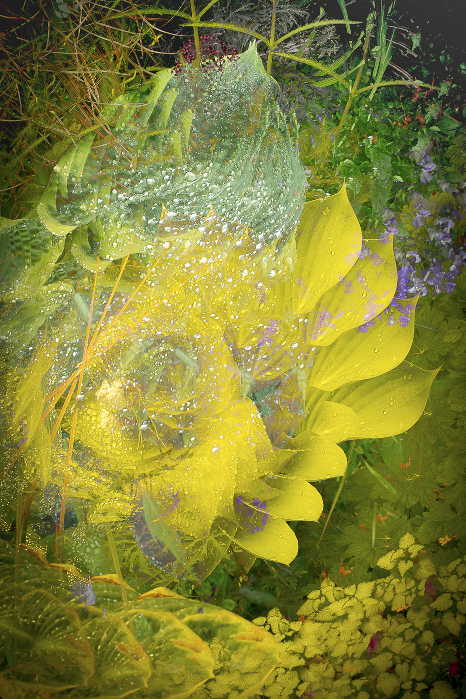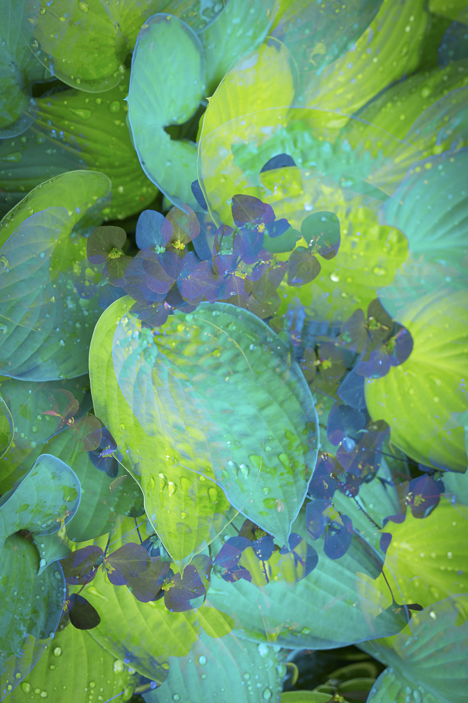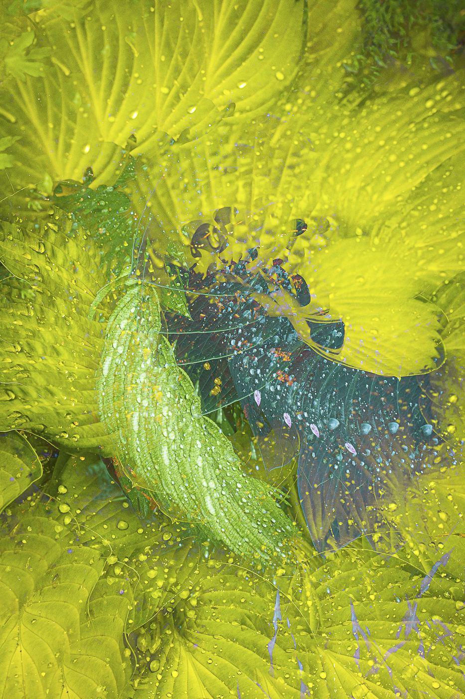 There are always images waiting to be created, even early on a wet June morning. Pots of Hosta, Heuchera and Libertia on my patio, each with their own distinctive leaf shapes, textures and colours, were transformed as rain droplets collected on them, with the gloom accentuating their colour.