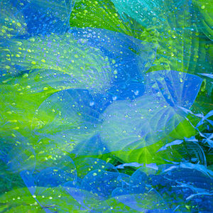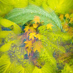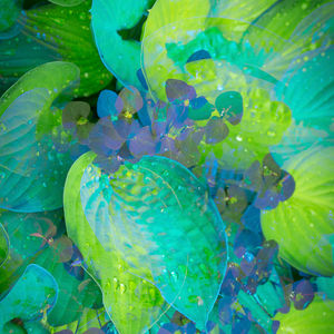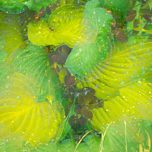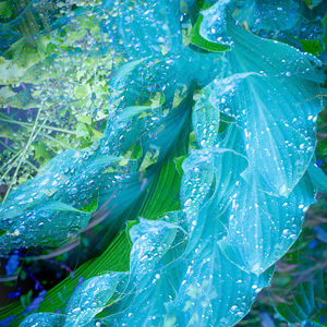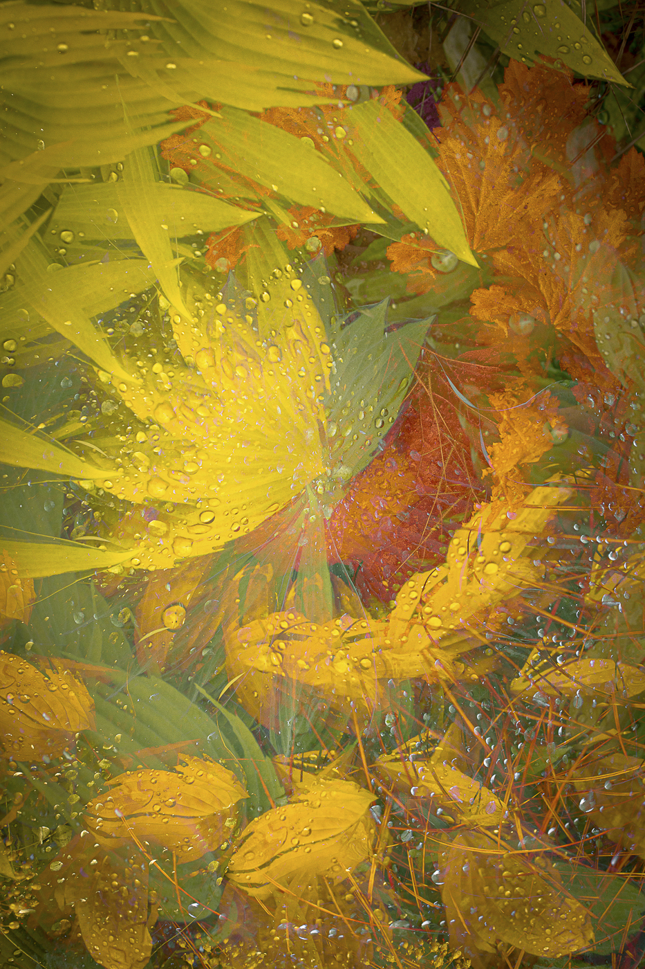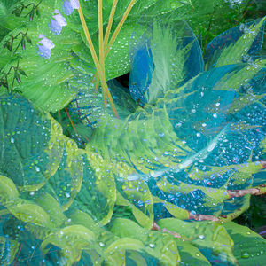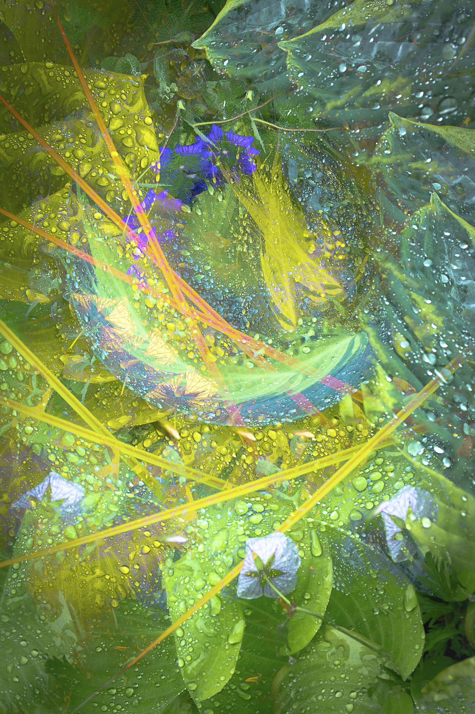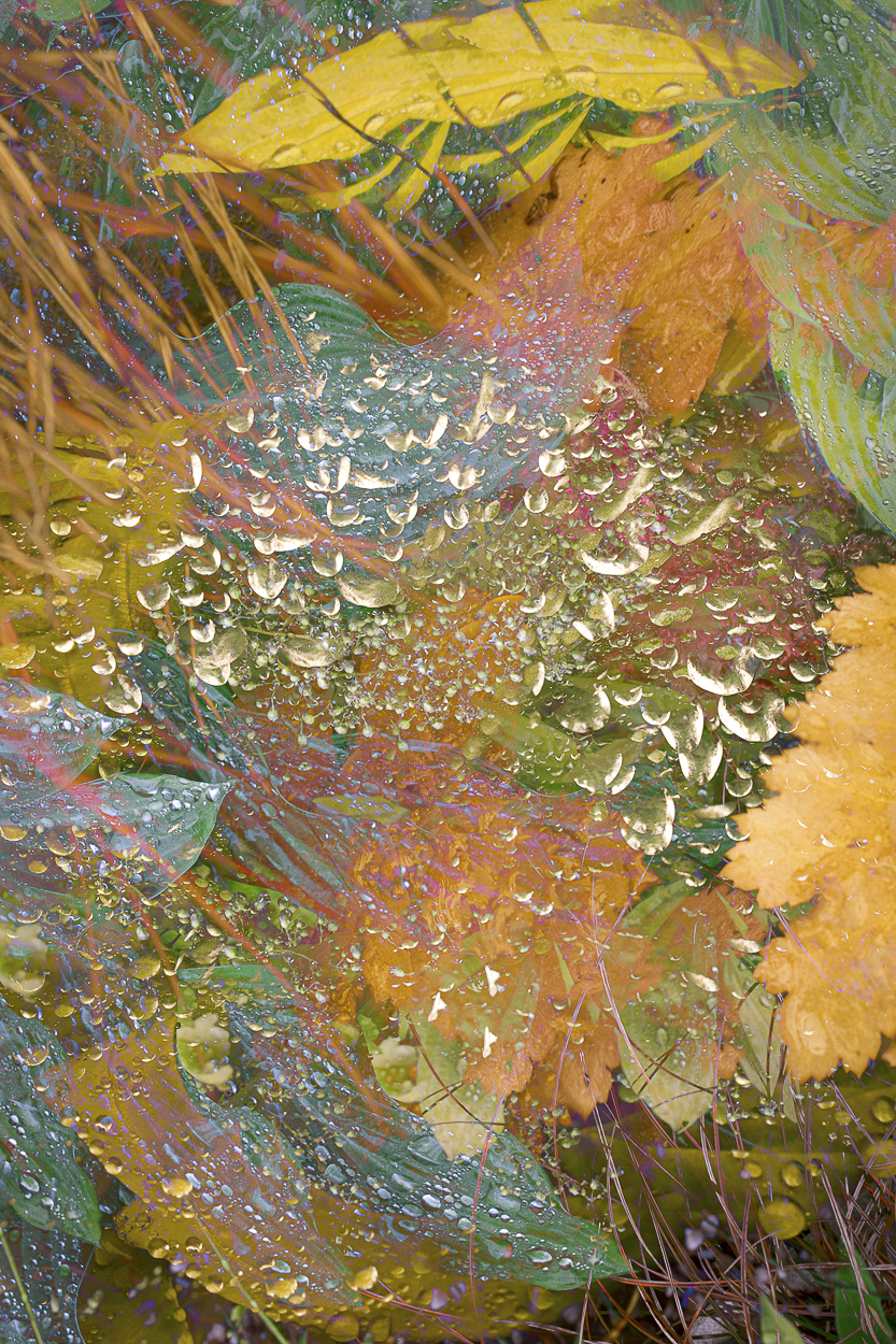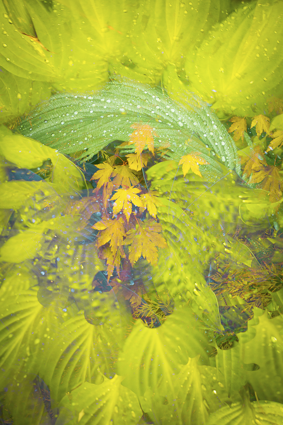 There are always images waiting to be created, even early on a wet June morning. Pots of Hosta, Heuchera and Libertia on my patio, each with their own distinctive leaf shapes, textures and colours, were transformed as rain droplets collected on them, with the gloom accentuating their colour.