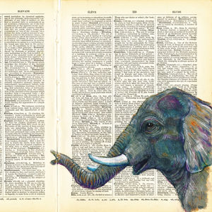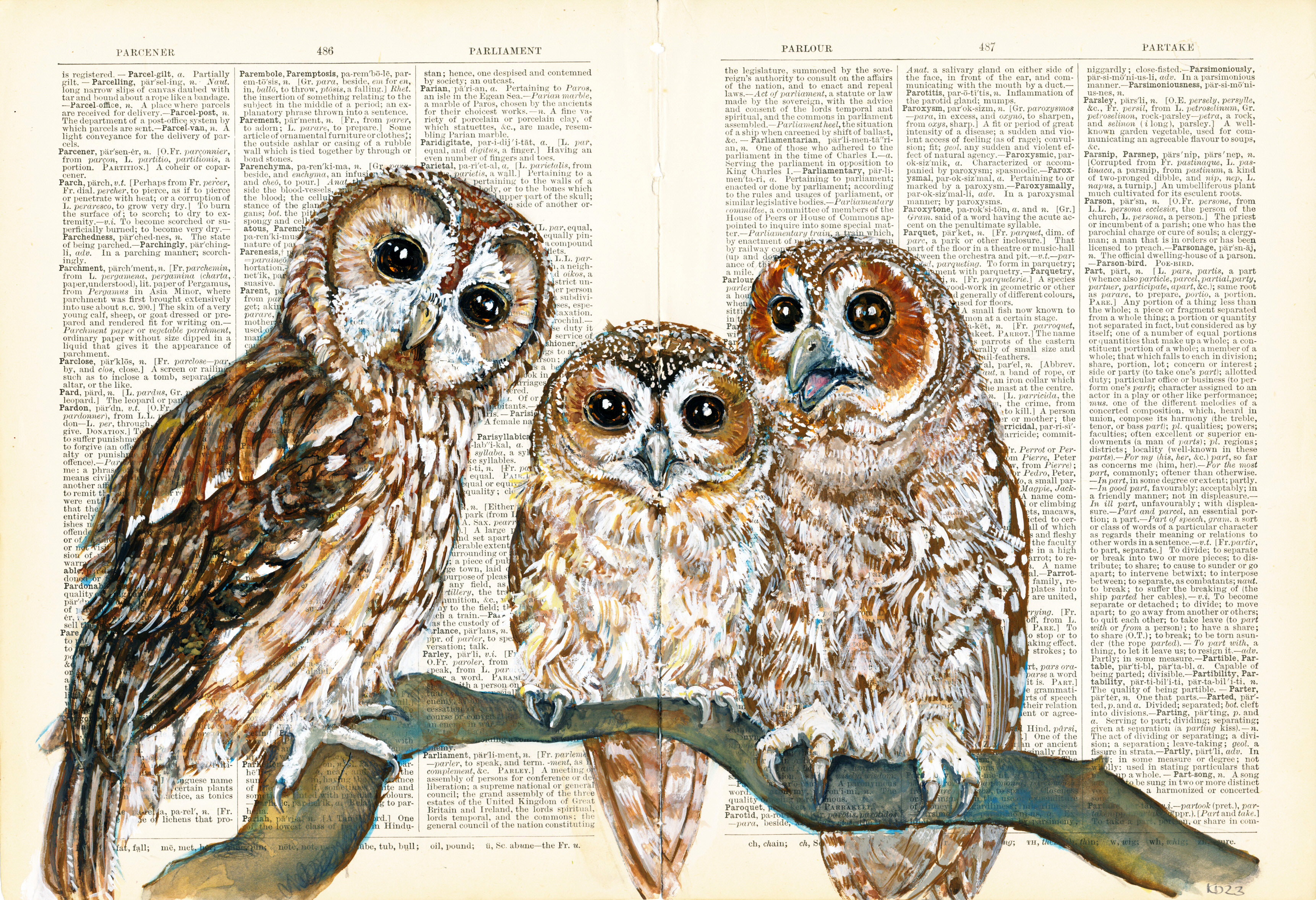 I have been very fortunate to find or be given on their last legs dictionaries that I can take apart to work on. I bravely paint straight onto the paper and build up an image of an animal, bird or plant in watercolor and gouache.