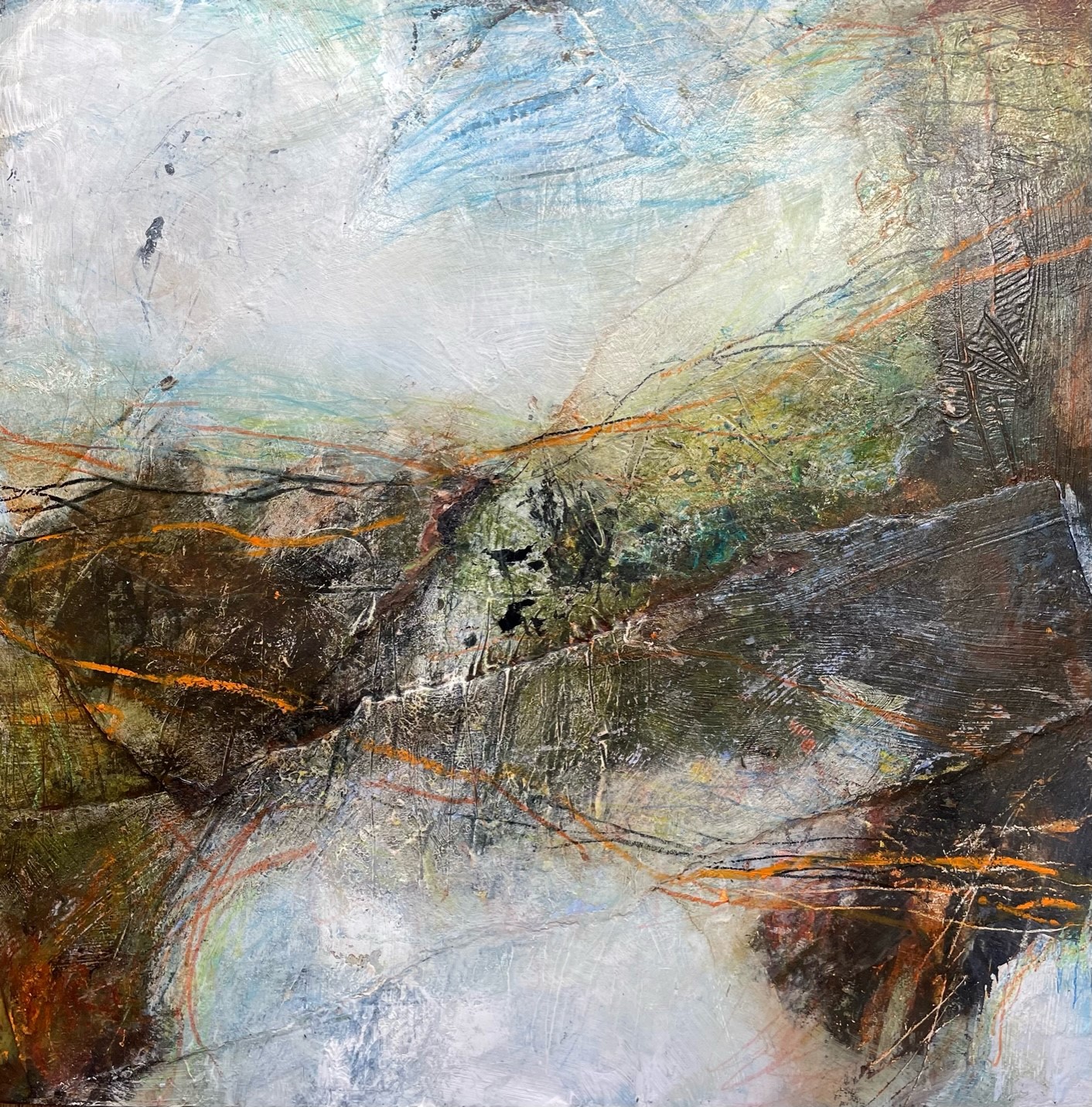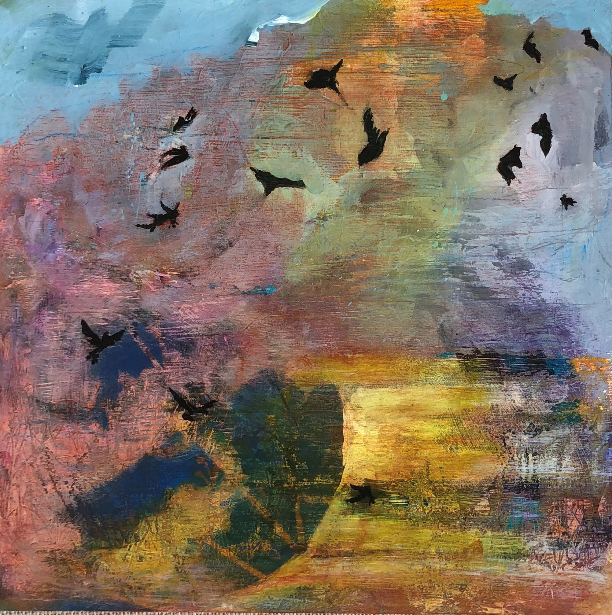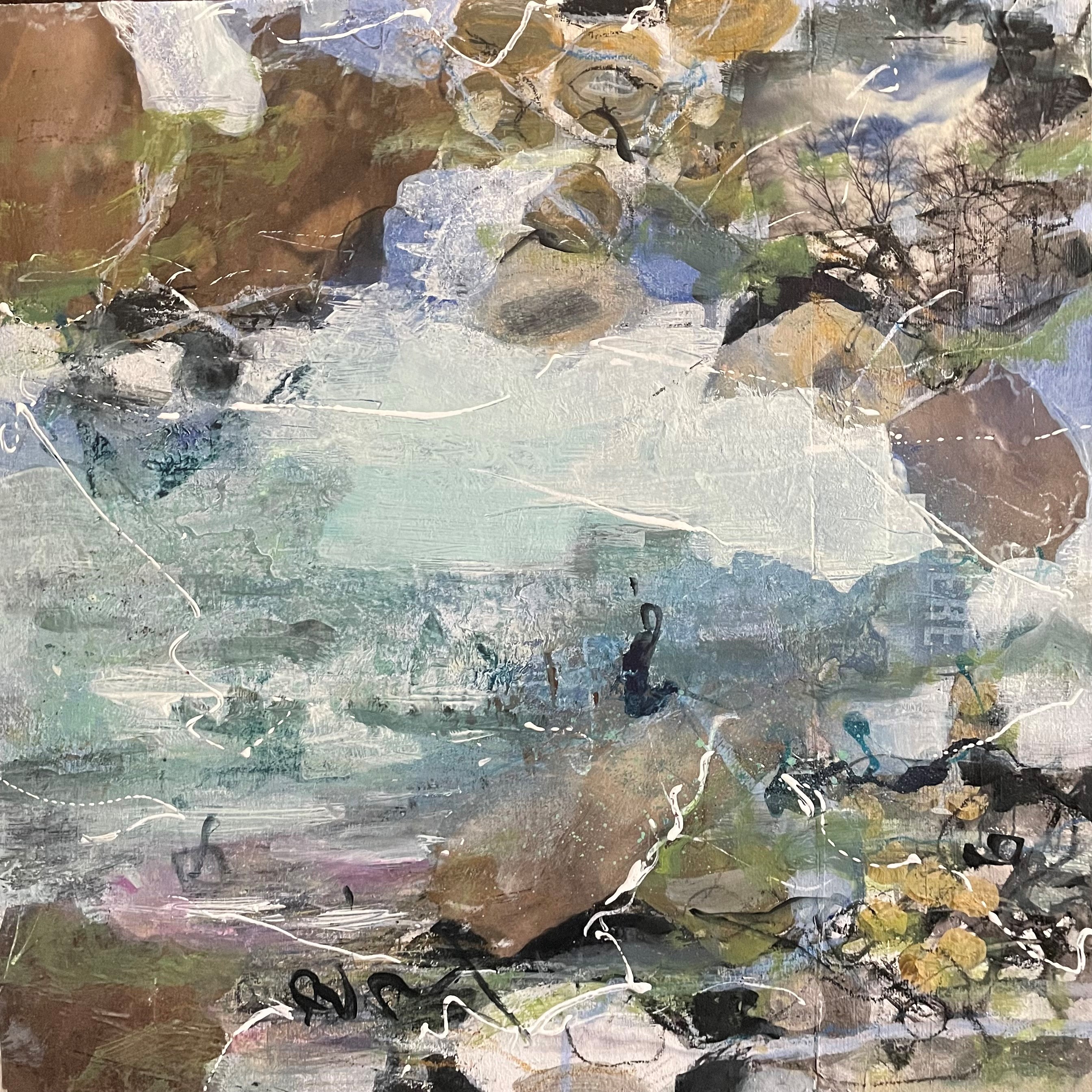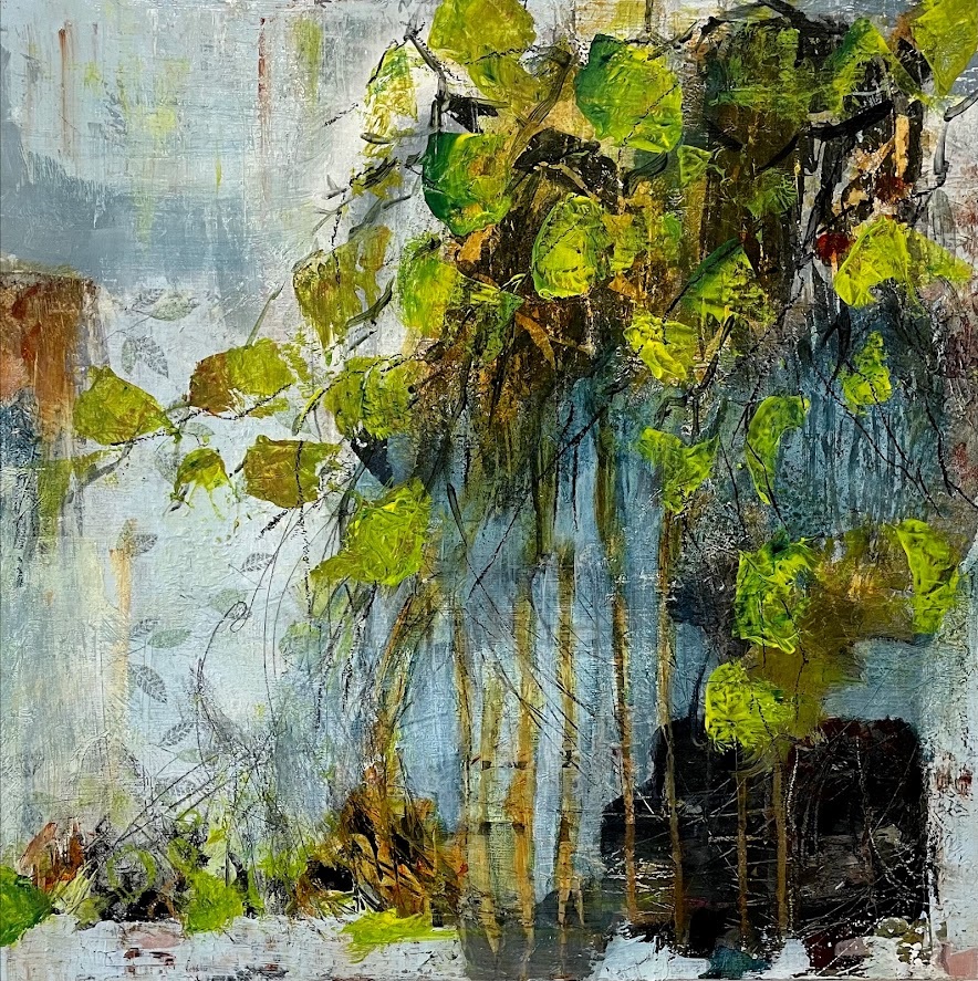 I am loving being able to take a more freeing approach in my work, capturing the beauty of the surrounding area that I am in. I like to sketch and paint outdoors and bring these back to the studio to use as ideas for my paintings. I love the many layers of paint, collage and other media that capture what it was like to be in the landscape. I work on a number of paintings at one time and on a variety of sizes.