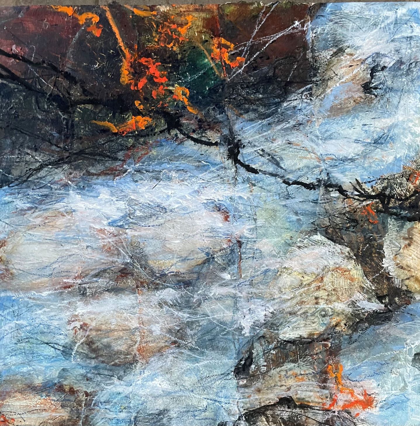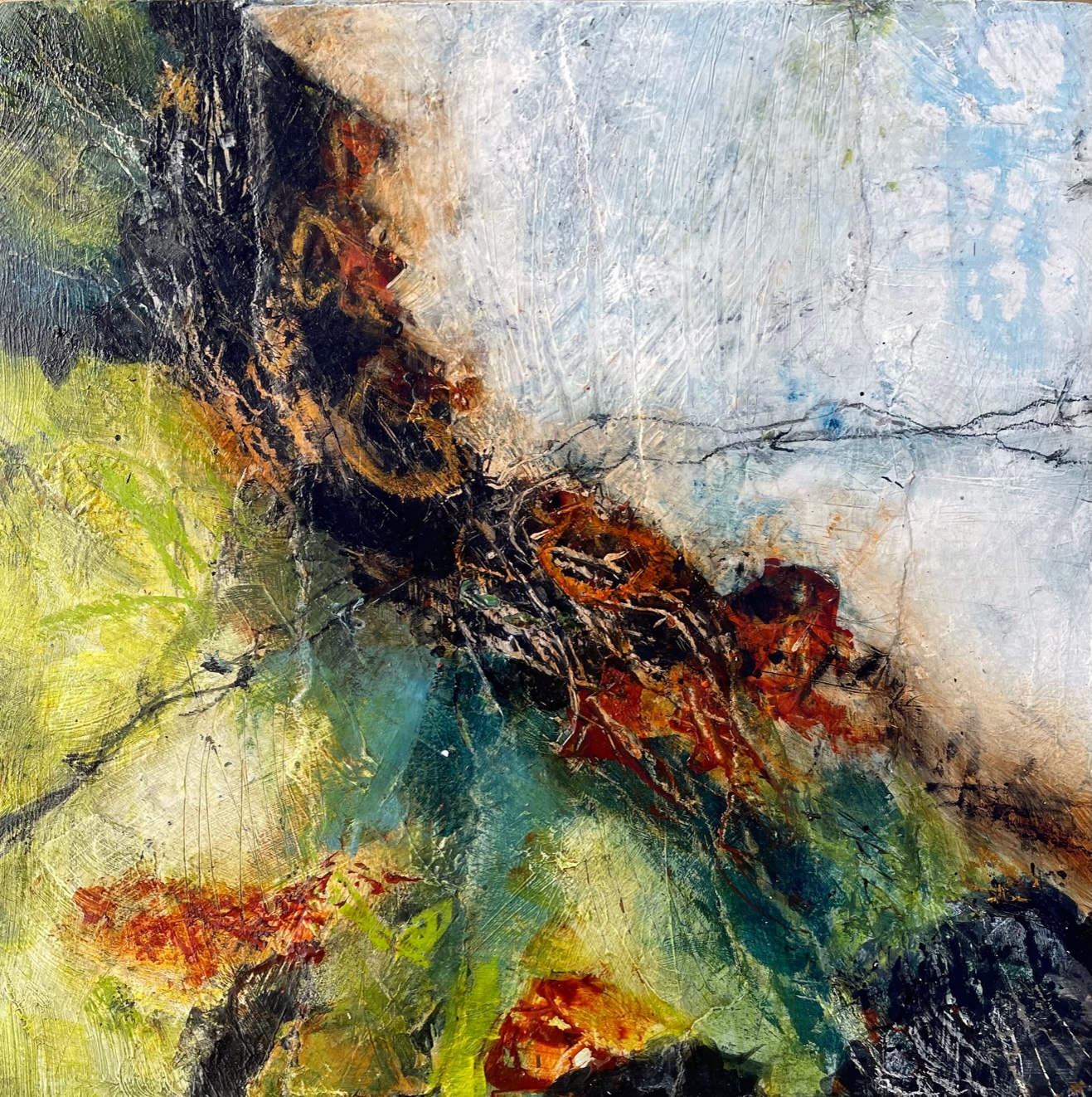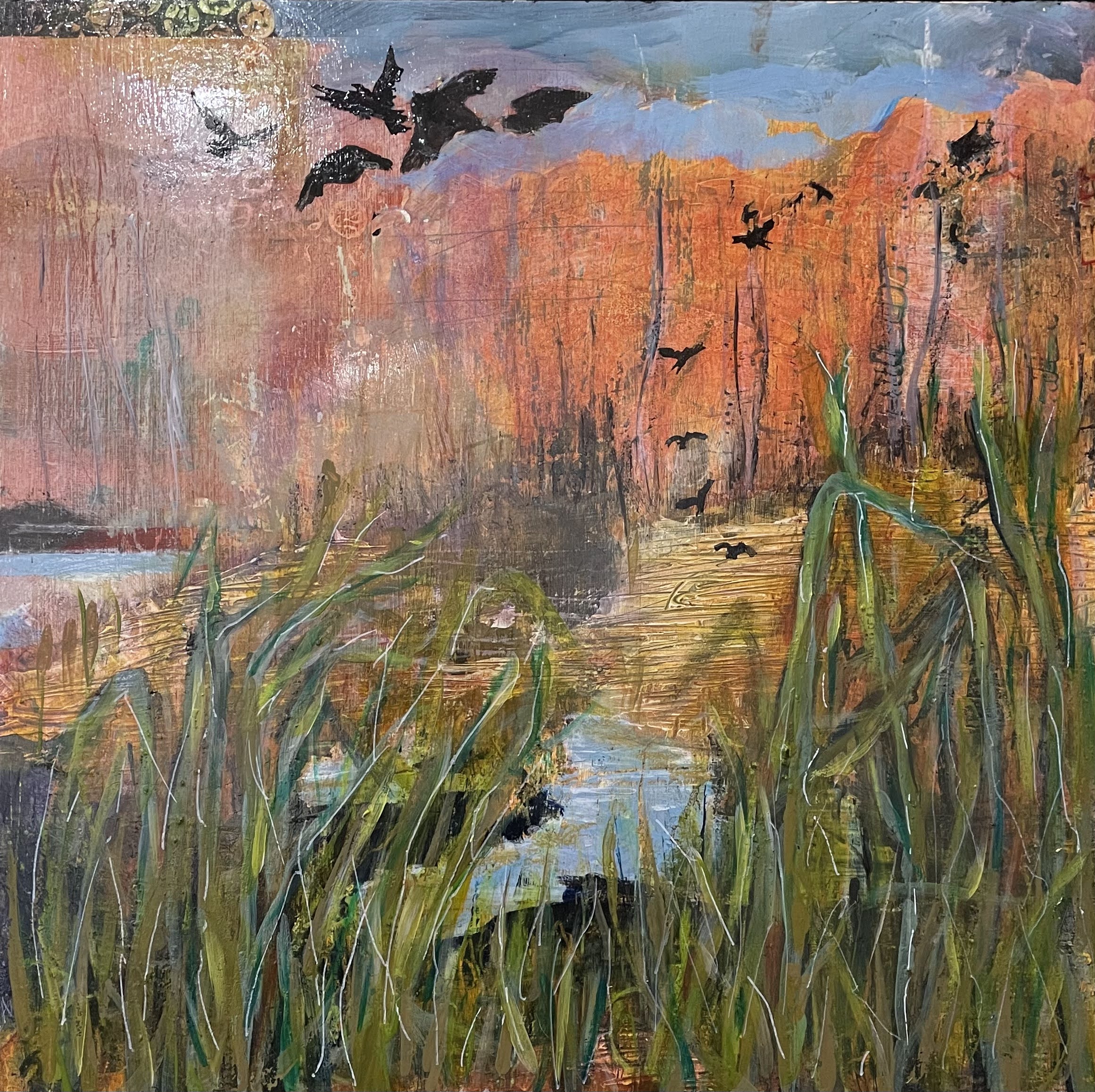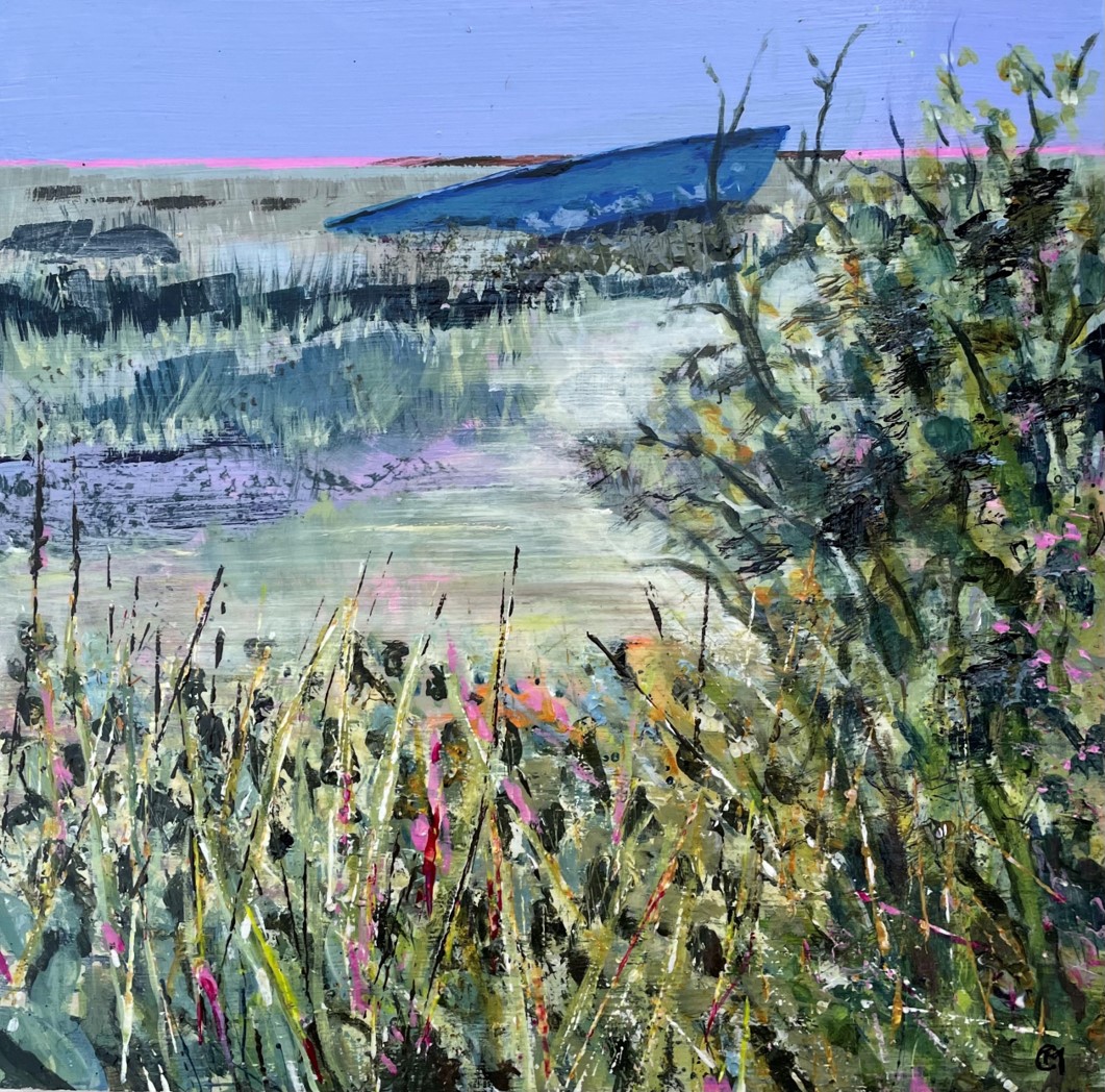 I am loving being able to take a more freeing approach in my work, capturing the beauty of the surrounding area that I am in. I like to sketch and paint outdoors and bring these back to the studio to use as ideas for my paintings. I love the many layers of paint, collage and other media that capture what it was like to be in the landscape. I work on a number of paintings at one time and on a variety of sizes.