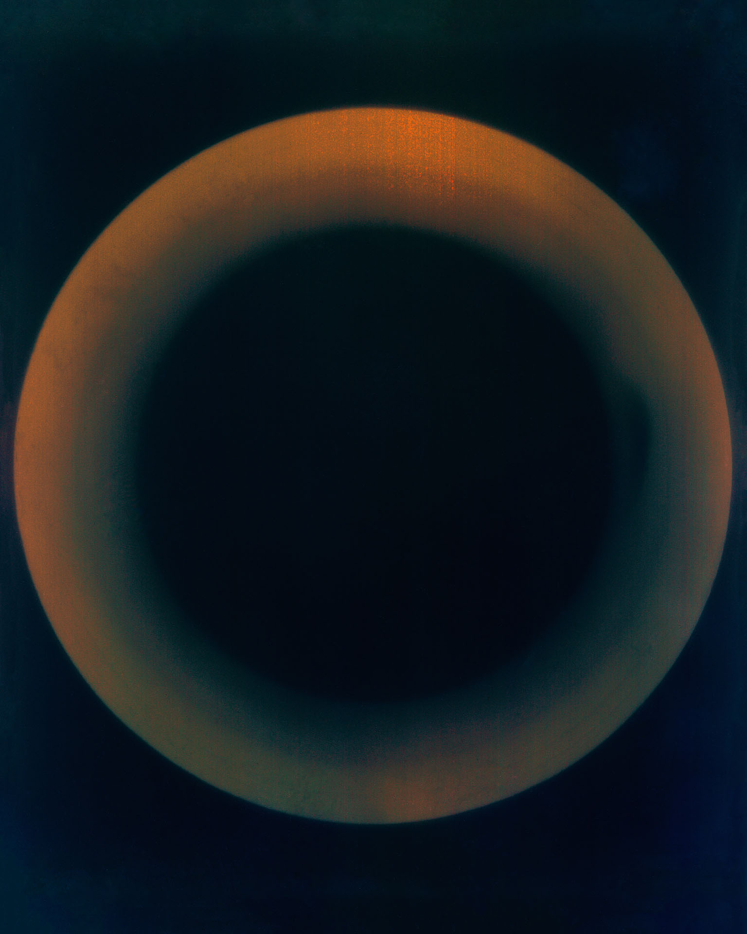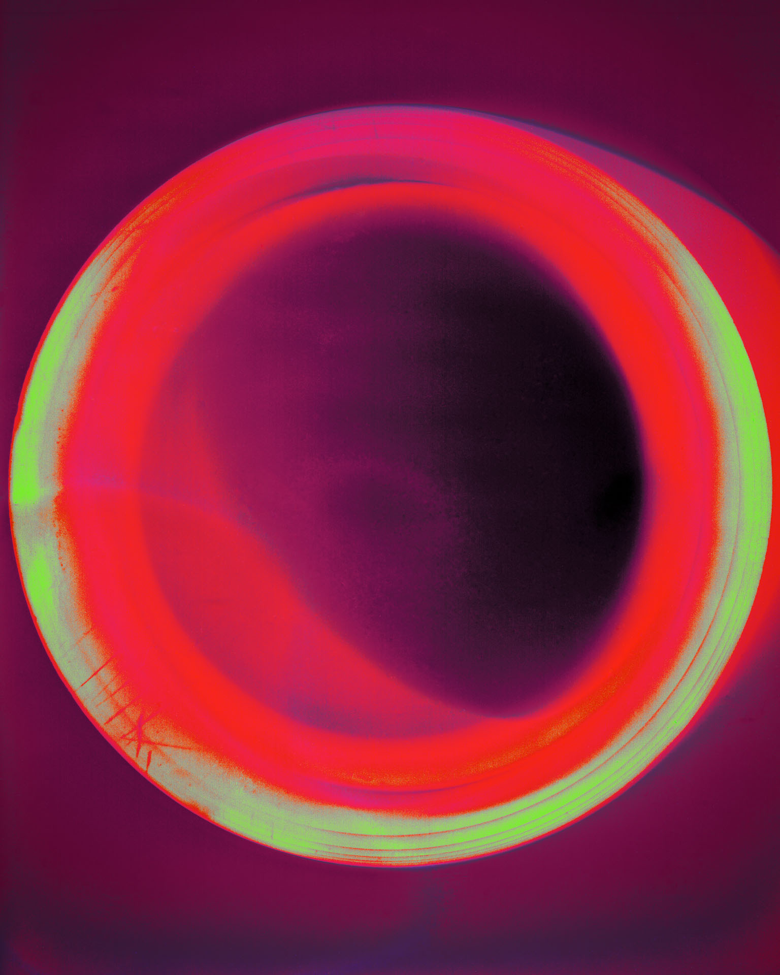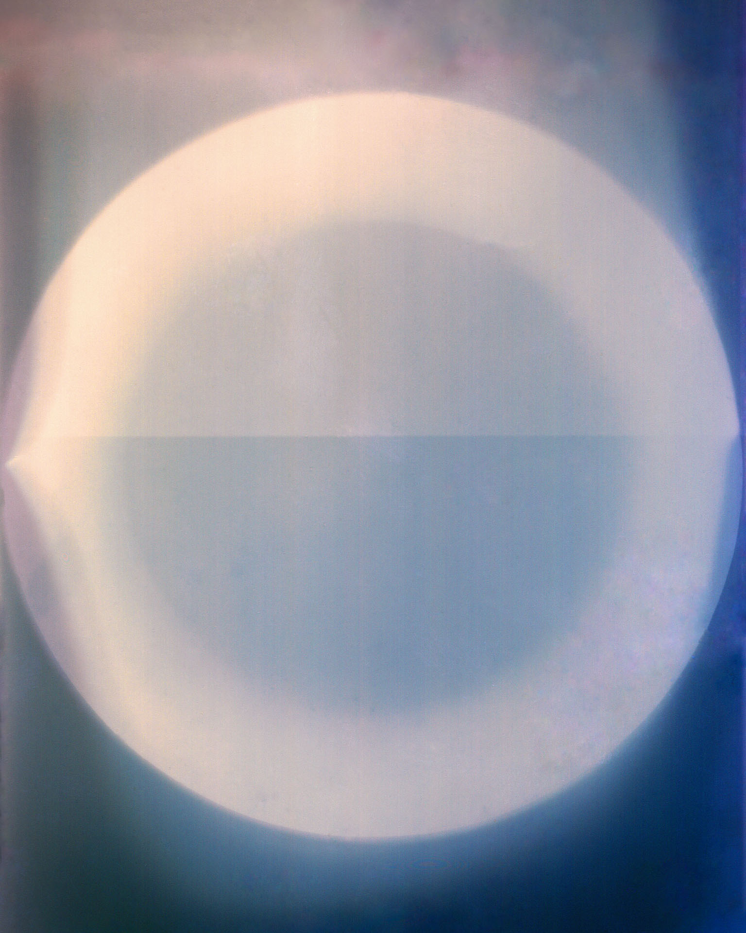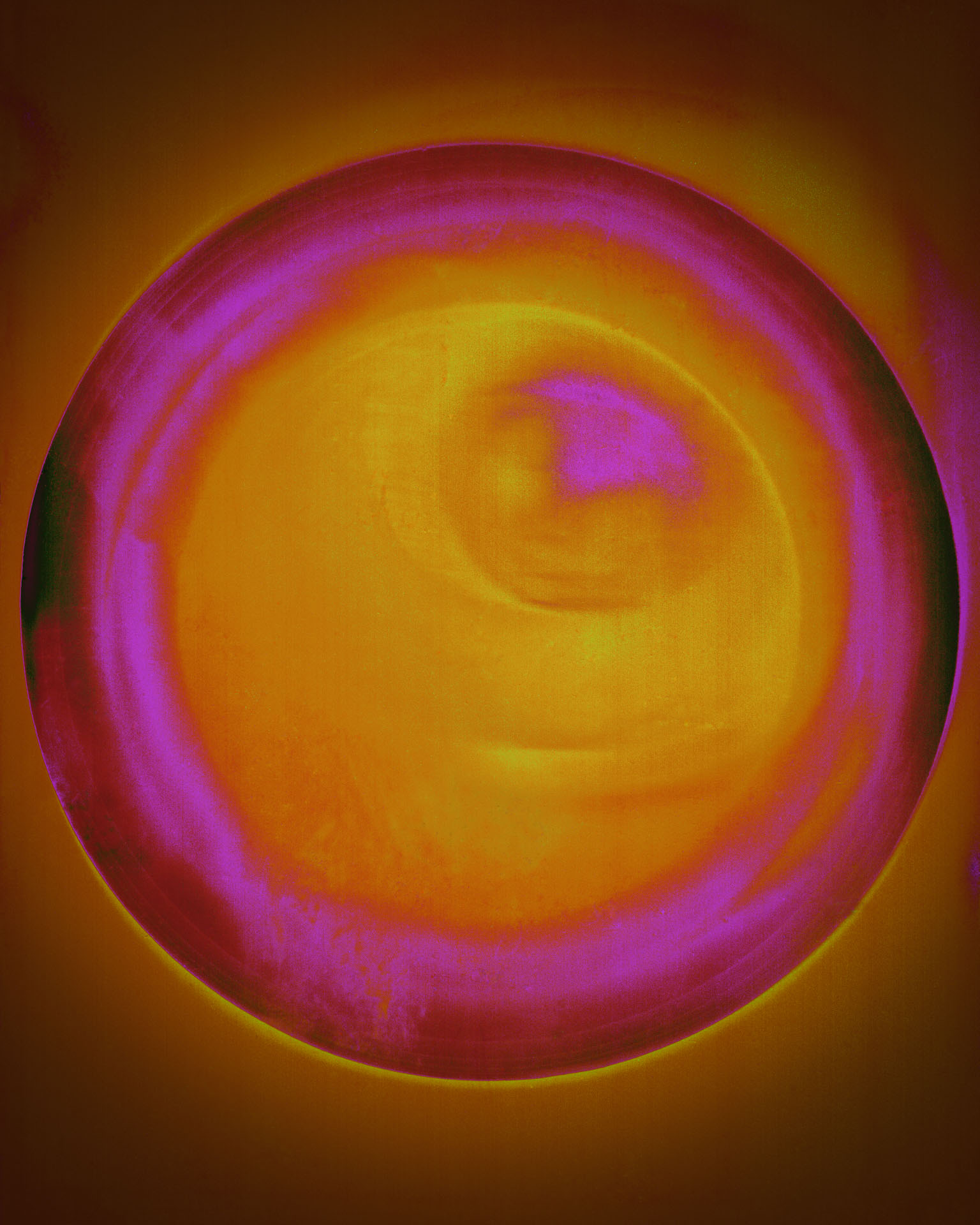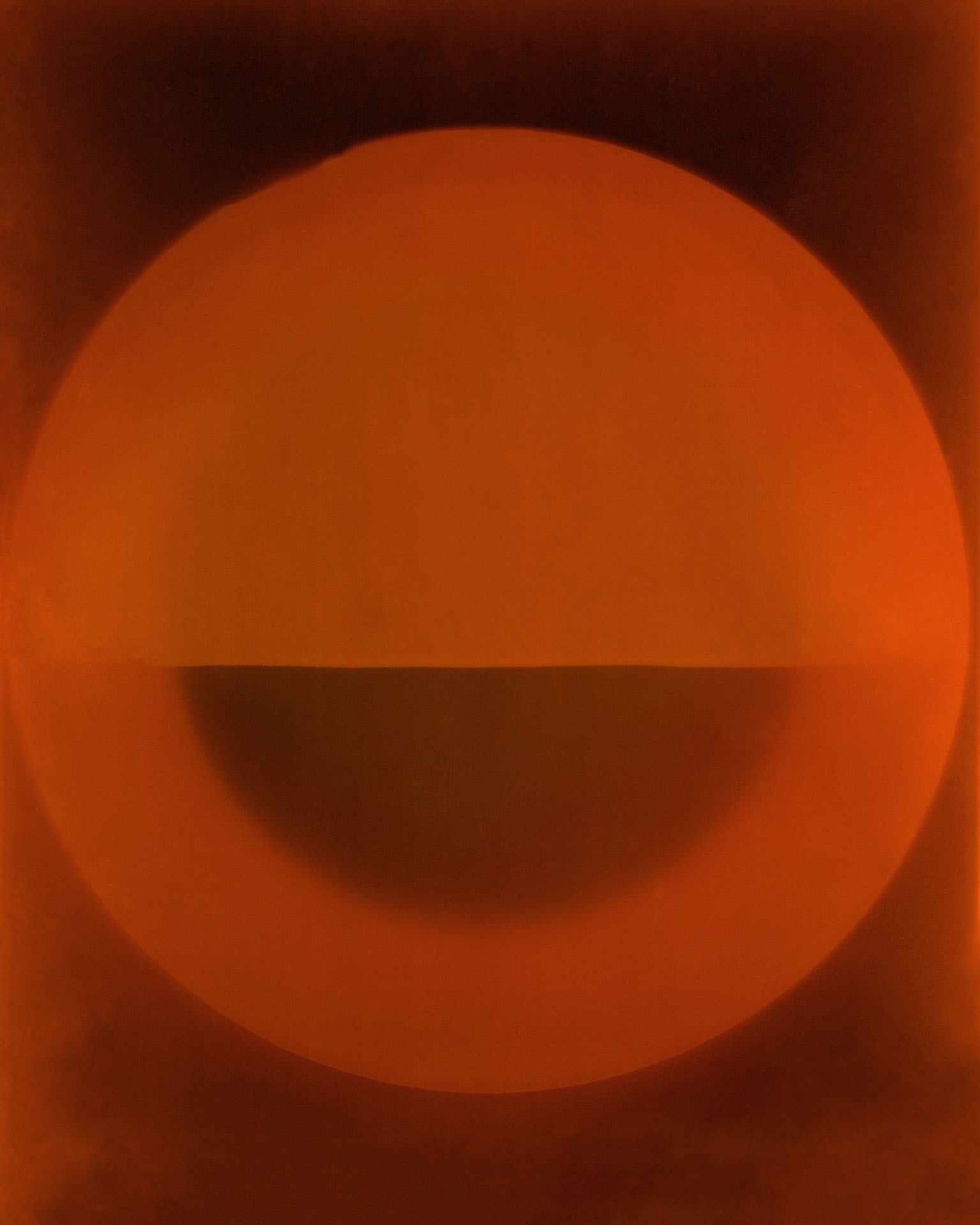 Technical note. These cameraless lumen prints were exposed to sunlight, for often a day or more, through a hemispheric glass lens mounted directly above black & white photographic ortho film; some had additional wood-ash sprinkled onto the emulsion. These negatives were processed in non-toxic caffenol developer and digitally scanned and outputted as archival giclée prints. While the resulting images respond to ambient light conditions, the contained spherical imagery raises the question of whether they have captured representational reality or something else. These images capture light across time, what we might refer to as ‘stretched temporality’.