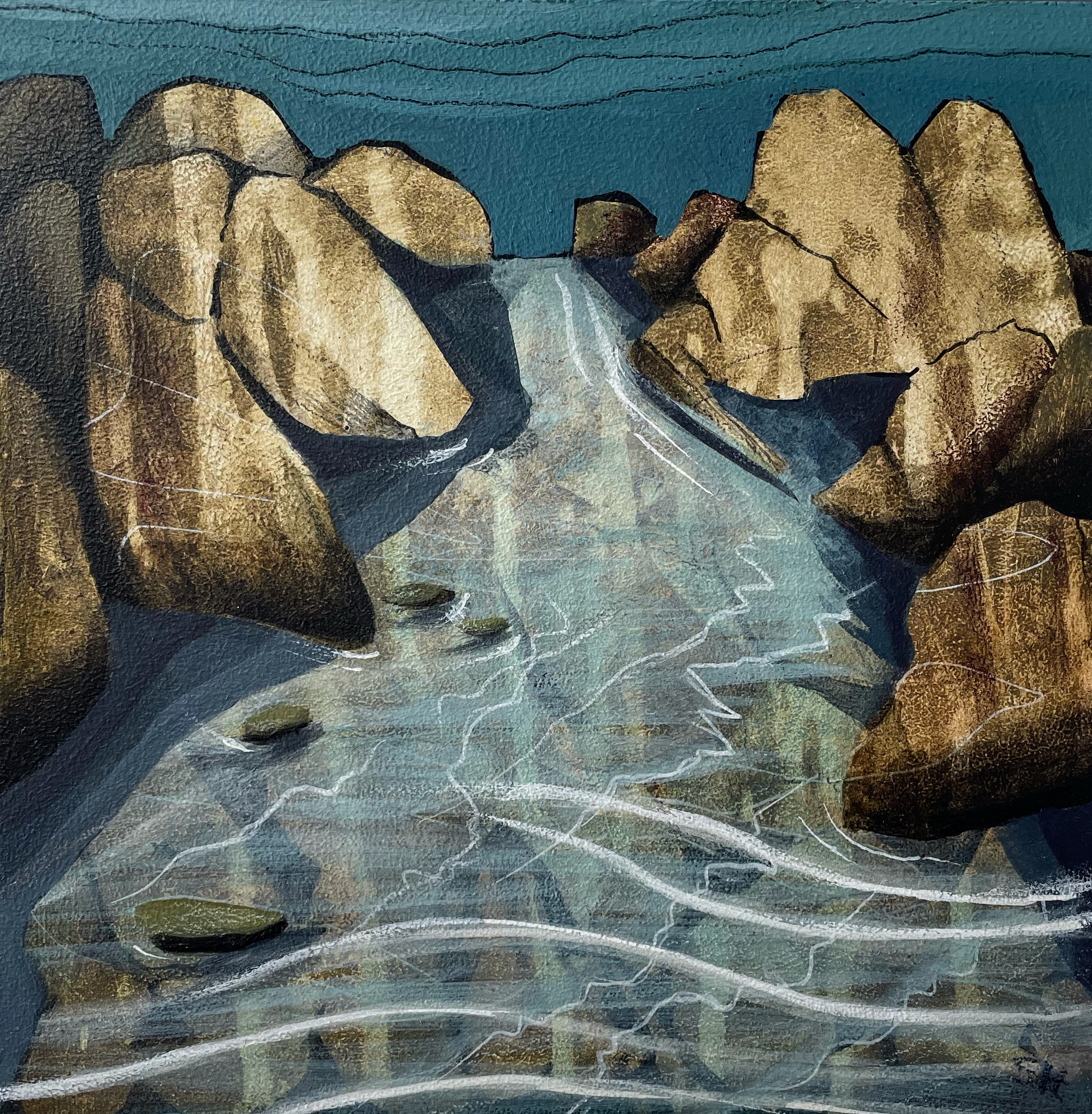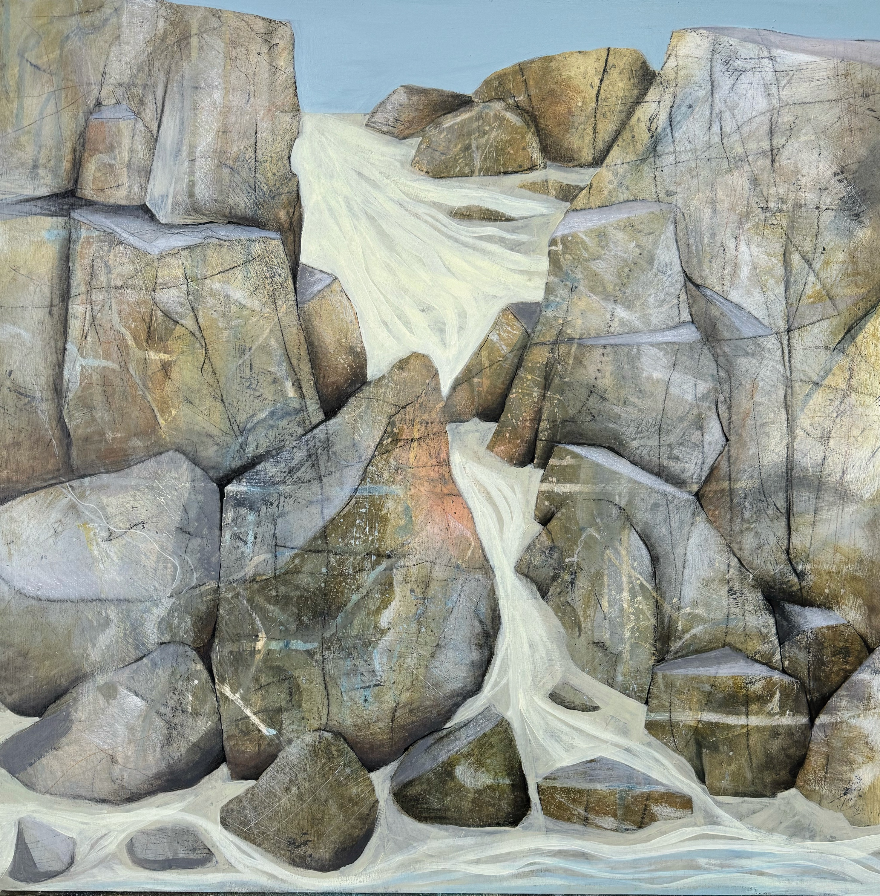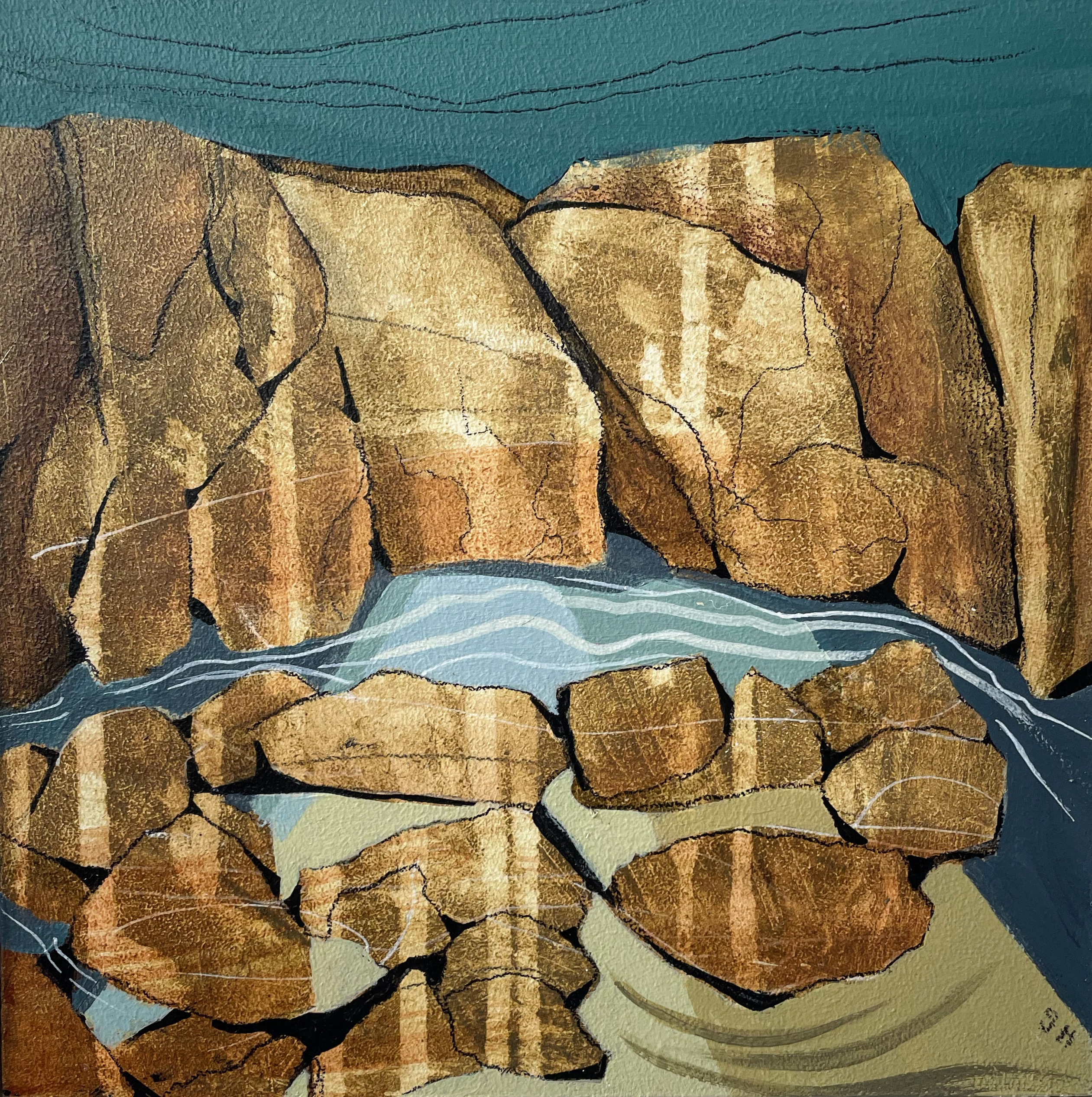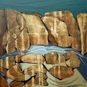 Abstracting landscapes can be challenging and very rewarding at the same time. I start by sketching a landscape over a variety of days and hopefully weather fronts. I identify the key shapes and textures found in my sketches. Once in the studio, I build up layers using my initial sketches as collages and by painting into them or over them. I rotate my work as the layers build trying not to consider composition or direction. Slowly the painting will start to reveal itself.