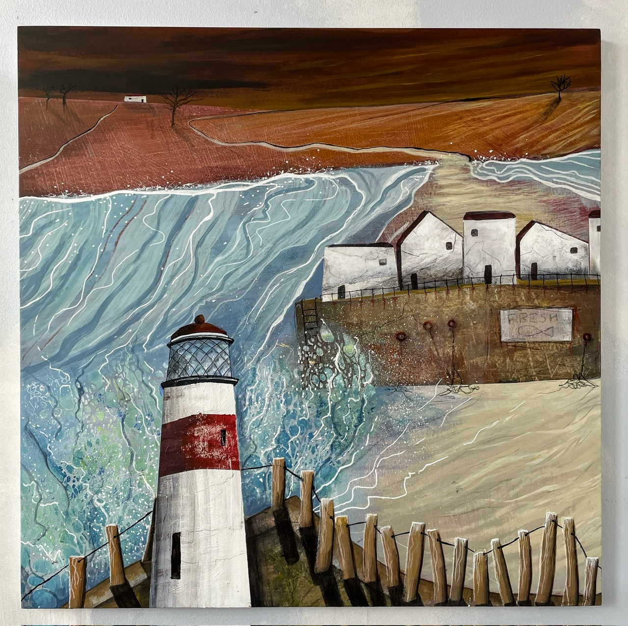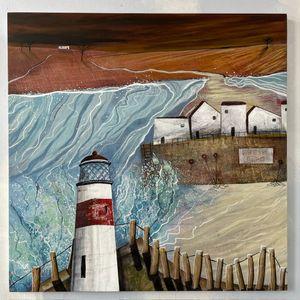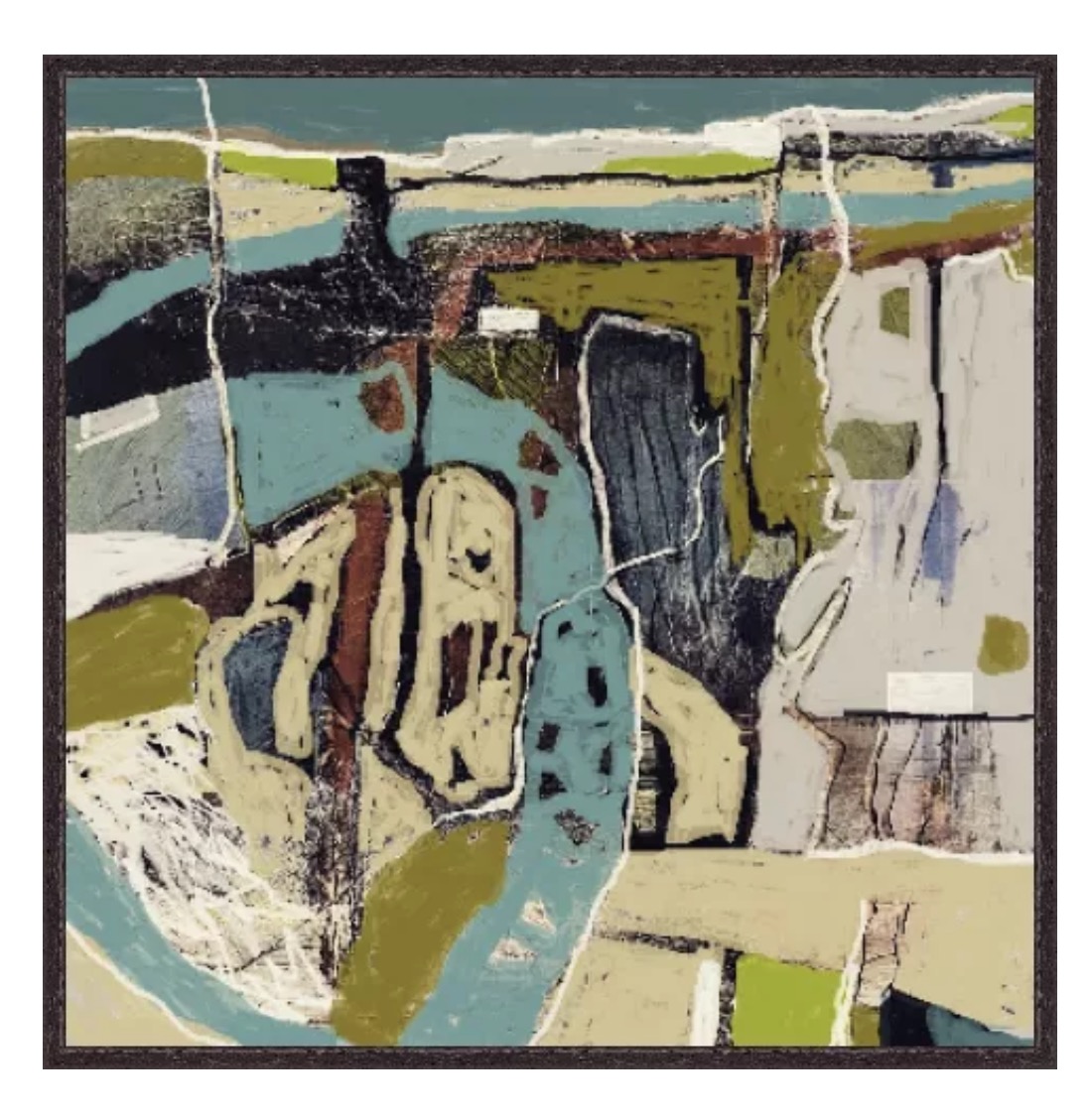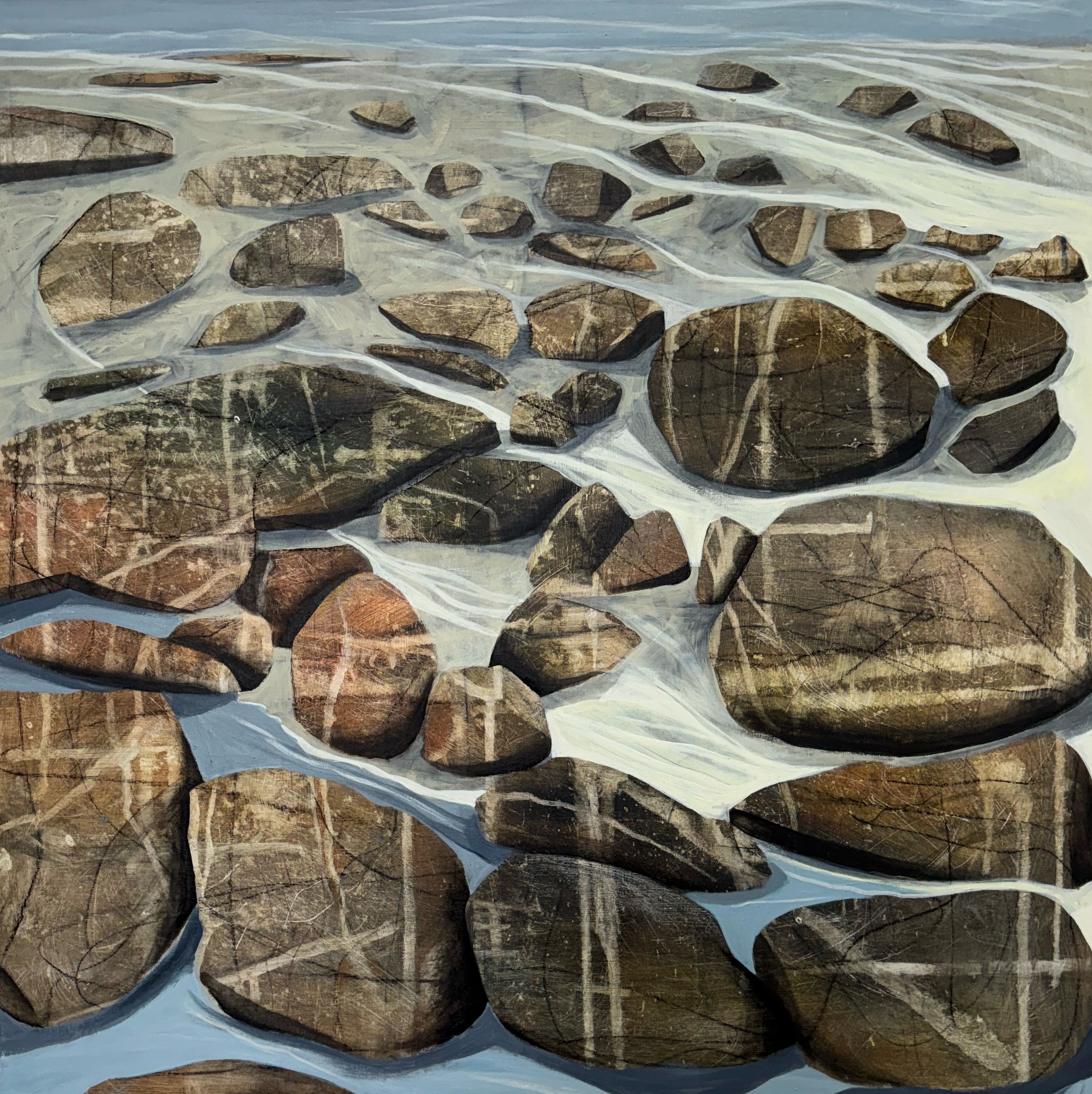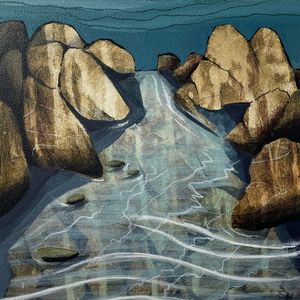 Abstracting landscapes can be challenging and very rewarding at the same time. I start by sketching a landscape over a variety of days and hopefully weather fronts. I identify the key shapes and textures found in my sketches. Once in the studio, I build up layers using my initial sketches as collages and by painting into them or over them. I rotate my work as the layers build trying not to consider composition or direction. Slowly the painting will start to reveal itself.