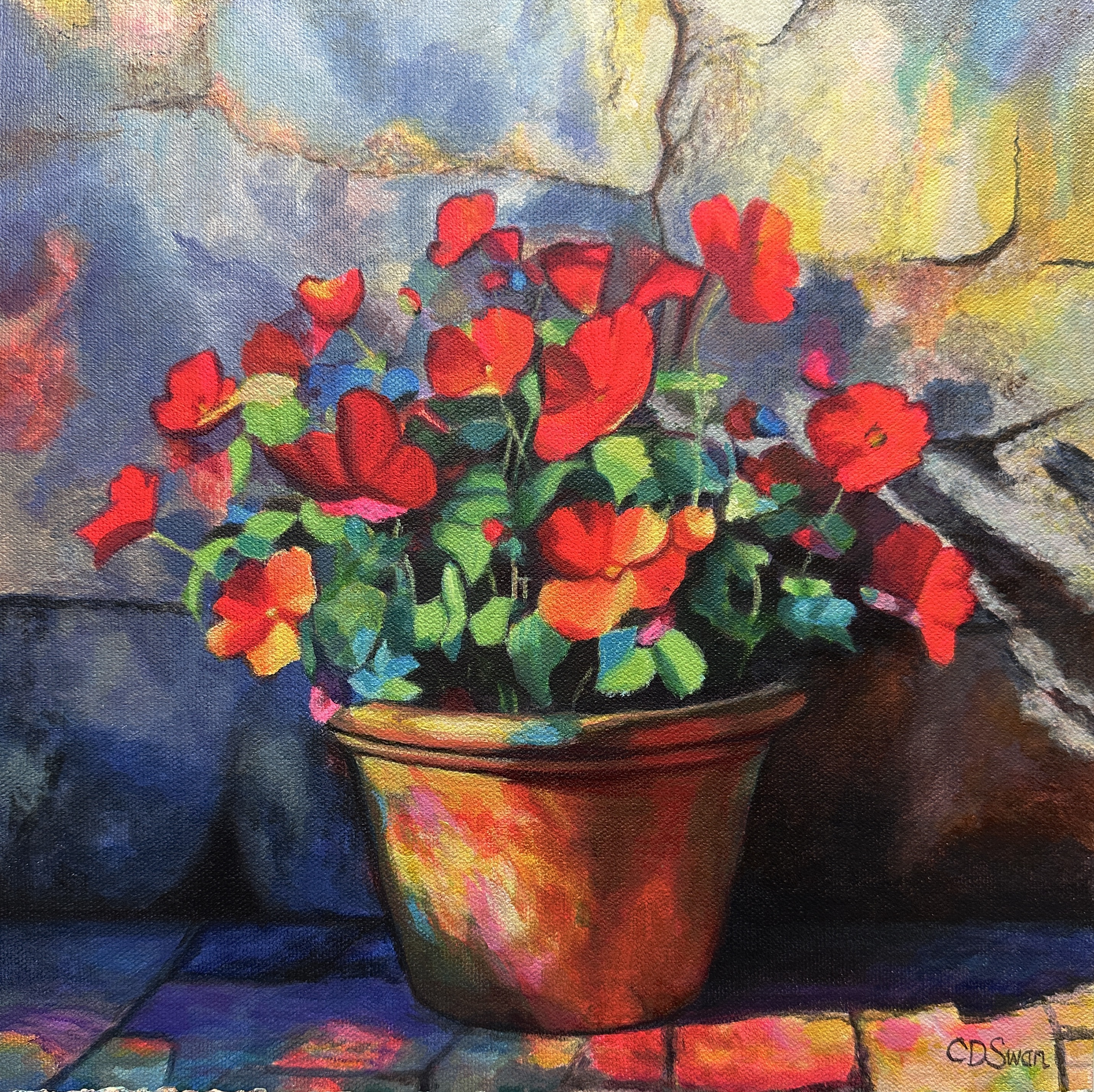 Caroline Swan’s new series of terracotta pot paintings brings a joyful burst of colour and creativity to a classic subject. Featuring blooming flowers in sun-soaked pots, each piece is alive with energy, bold brushstrokes, and playful paint splashes that add a contemporary, abstract twist.