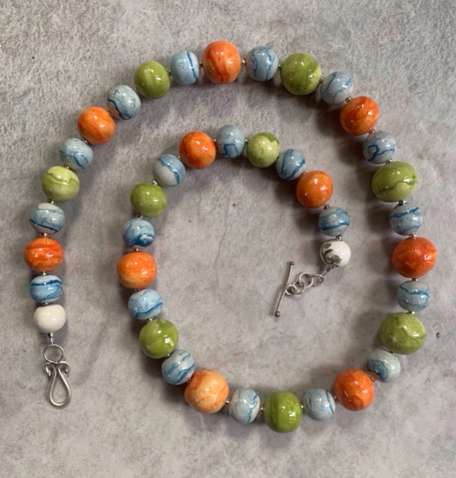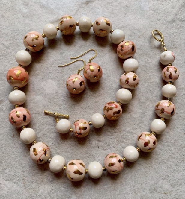 The beads fashioned from earthenware clay and biscuit fired. They are then hand painted and glazed. This may be a pattern from ancient symbols or a complete landscape painted on an individual bead. These are then fired again, in a traditional kiln. If a real gold or platinum detail is added this then requires the beads to be fired a third time.