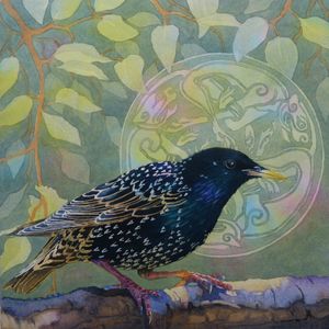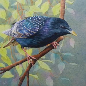 Sturnus Vulgaris or common starling, these birds are anything but with their beautiful iridescent plumage and star tipped feathers. I have attempted to capture this in watercolour.
