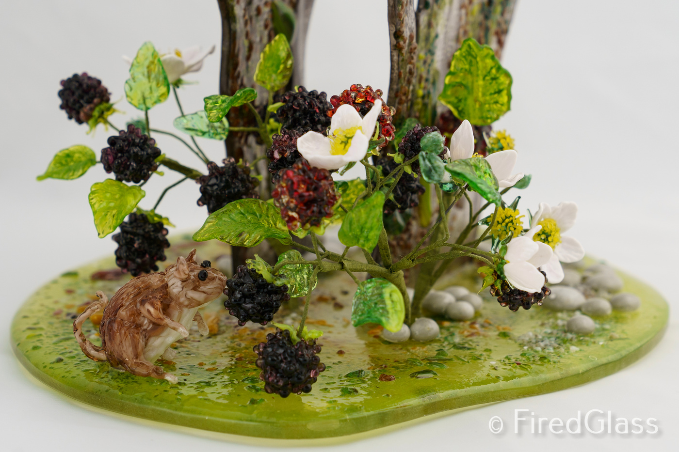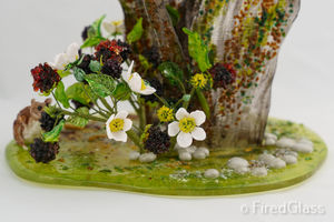 Most of these works feature fused glass elements (usually the main subject), that have been cut from sheet glass then painted with enamels. Enamel is exceptionally fine ground glass mixed with a binder to form a paint. The piece is then fired in a kiln at around 760 deg C. More delicate elements like flowers and leaves are sculpted in a lamp work torch flame. This is an Oxygen/Propane torch that allows glass to be melted at around 1200 deg C then sculpted into shapes. A base is created by fusing glass in the kiln, then drilled to accept the rest of the pieces.