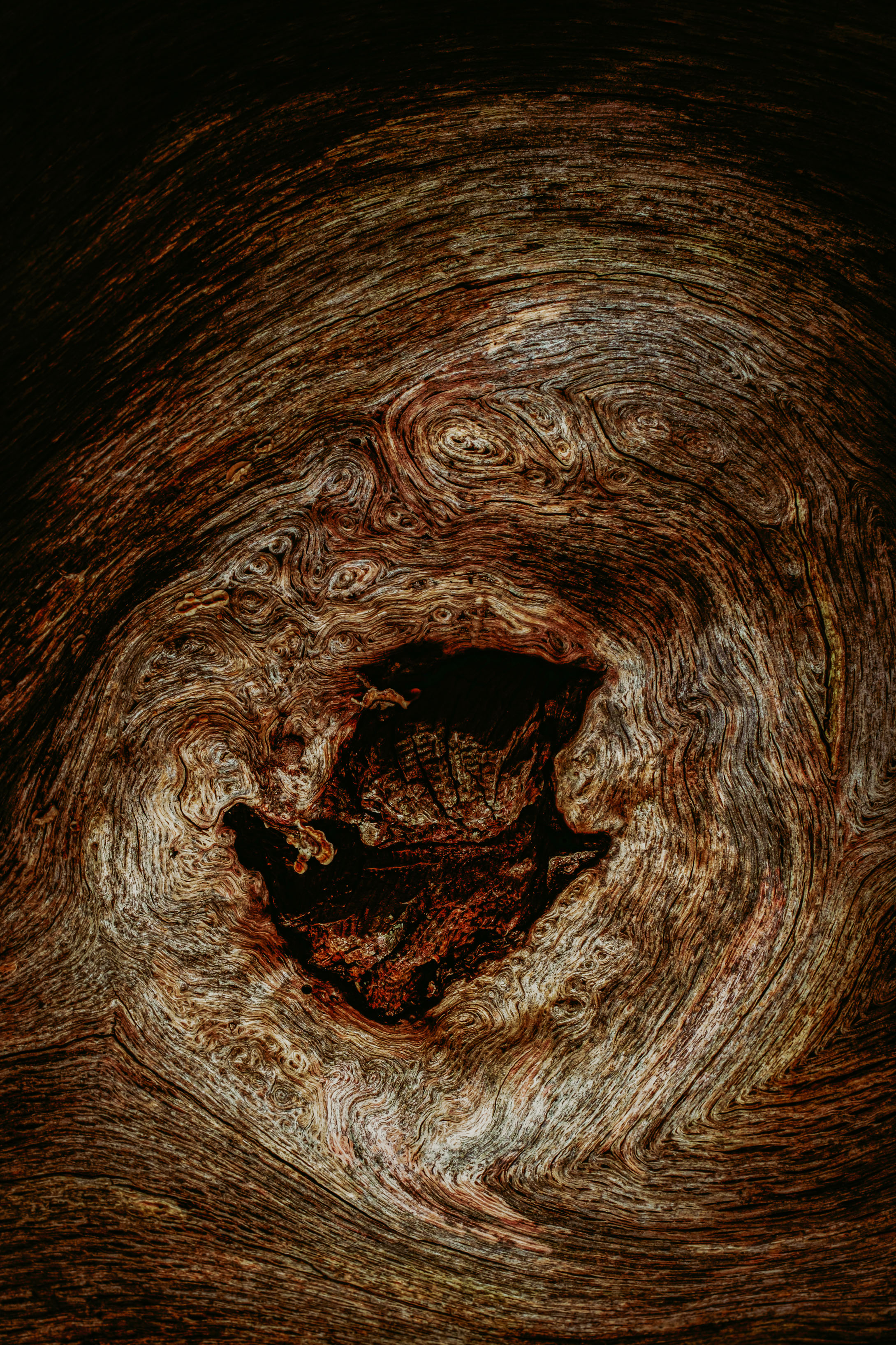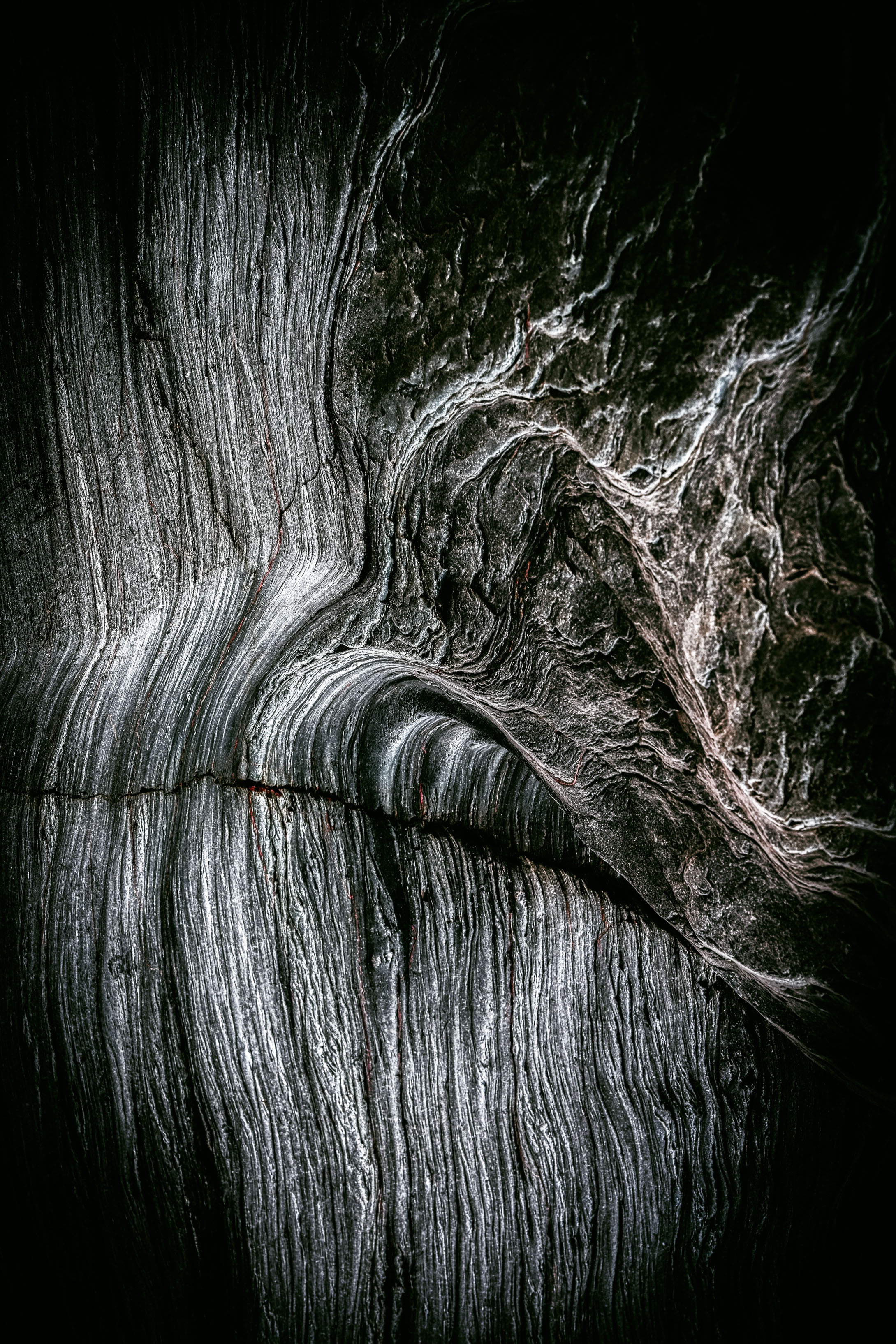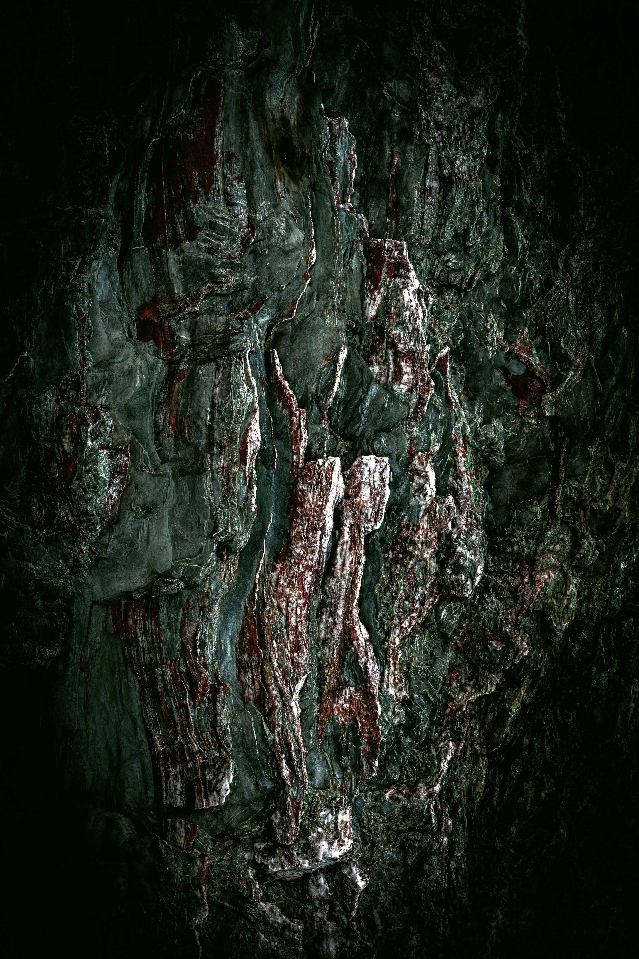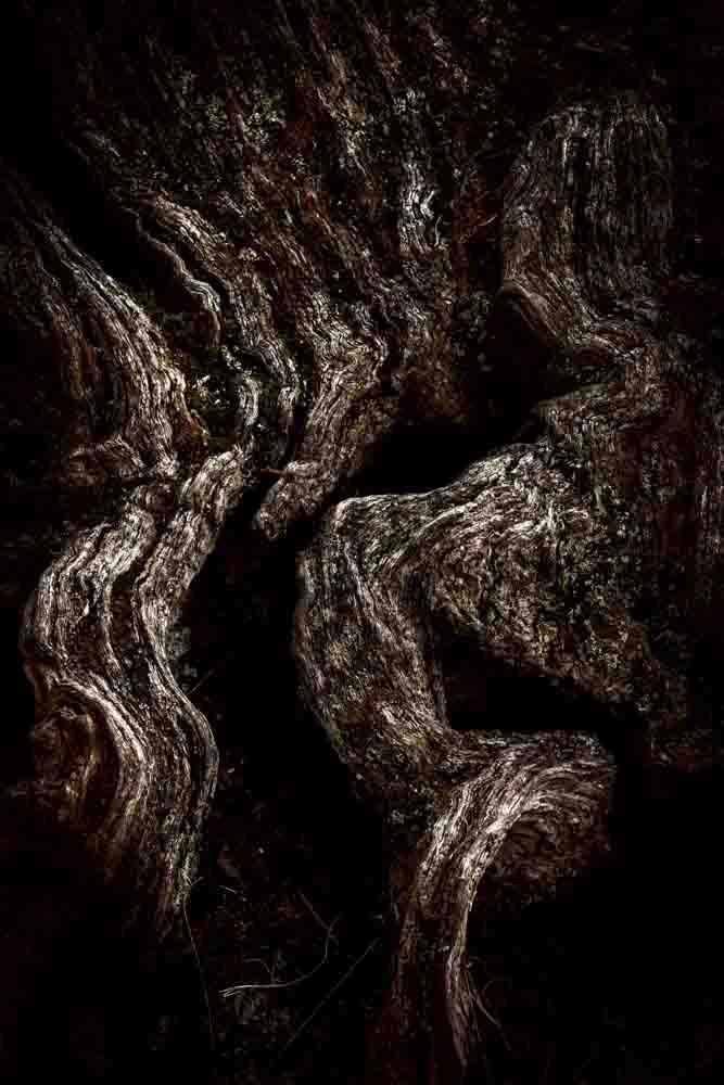 Searching out rock and wood with interesting textures and contours becomes a very tactile experience. Each surface must be touched to gain a sense of age and history, elements that hold the land together. Working mainly with a macro lens I am able to emphasise fine detail and blur the boundaries (in some cases) between rock and wood. Use of chiaroscuro popularised in the Renaissance and Baroque periods by artists such as Rembrandt and Caravaggio, create mono-chromatic images with richness and depth.
