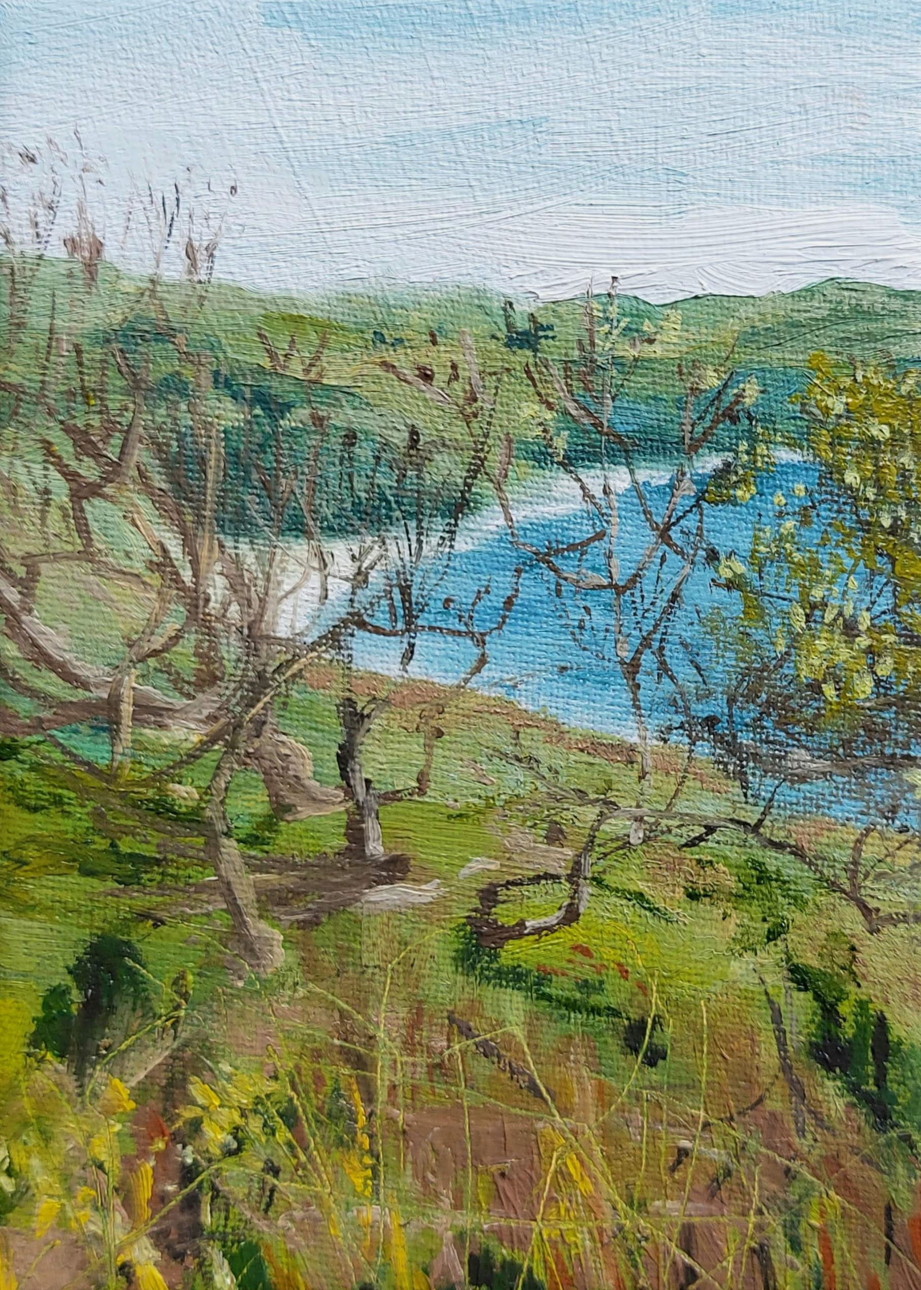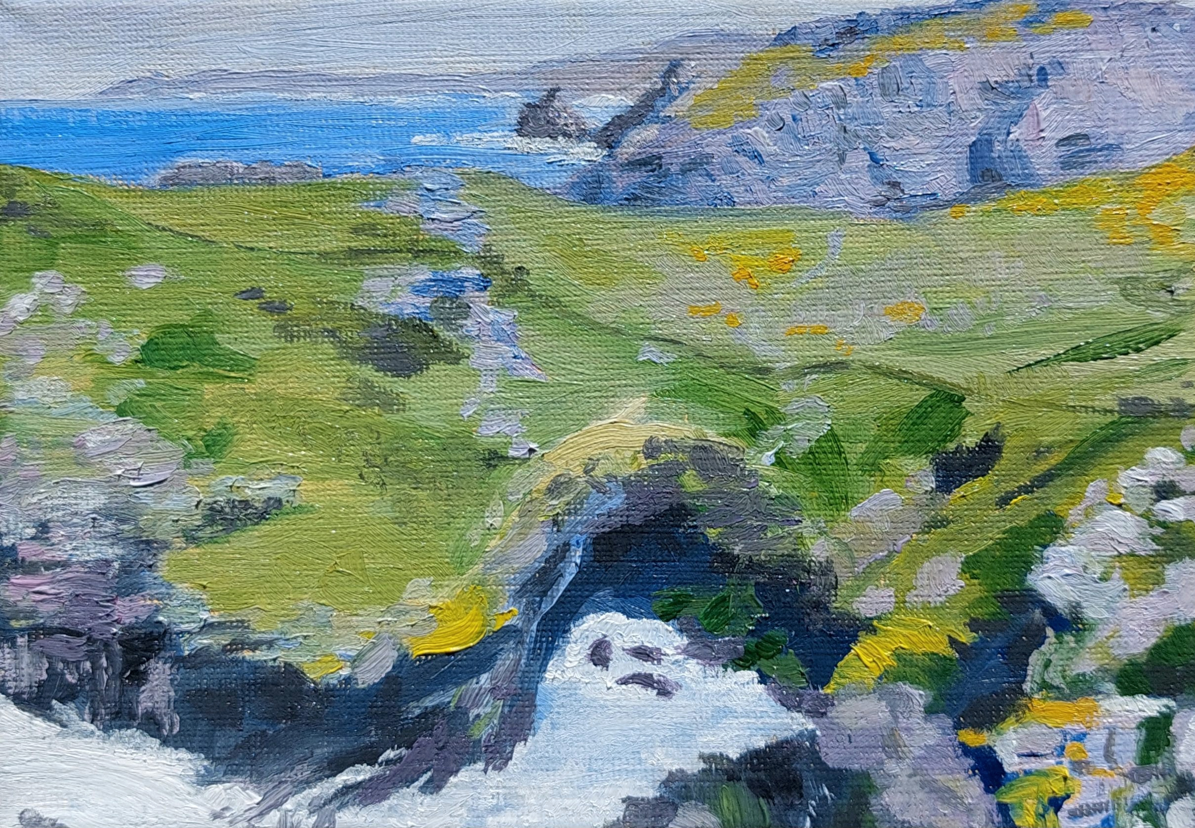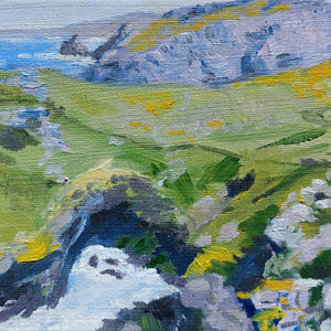During my travels around Dorset, Devon and Cornwall, I love to walk the south-west coastal path and explore coves and beaches across this beautiful section of the English coast, watching the changing colours of the sea and shifting skies under transient weather. I love the acid yellow of gorse, the pungent aroma and delicate flowers of wild garlic, along with lush ferns, moss and gnarly branches across gurgling coastal streams. My paintings and prints reflect these journeys.
