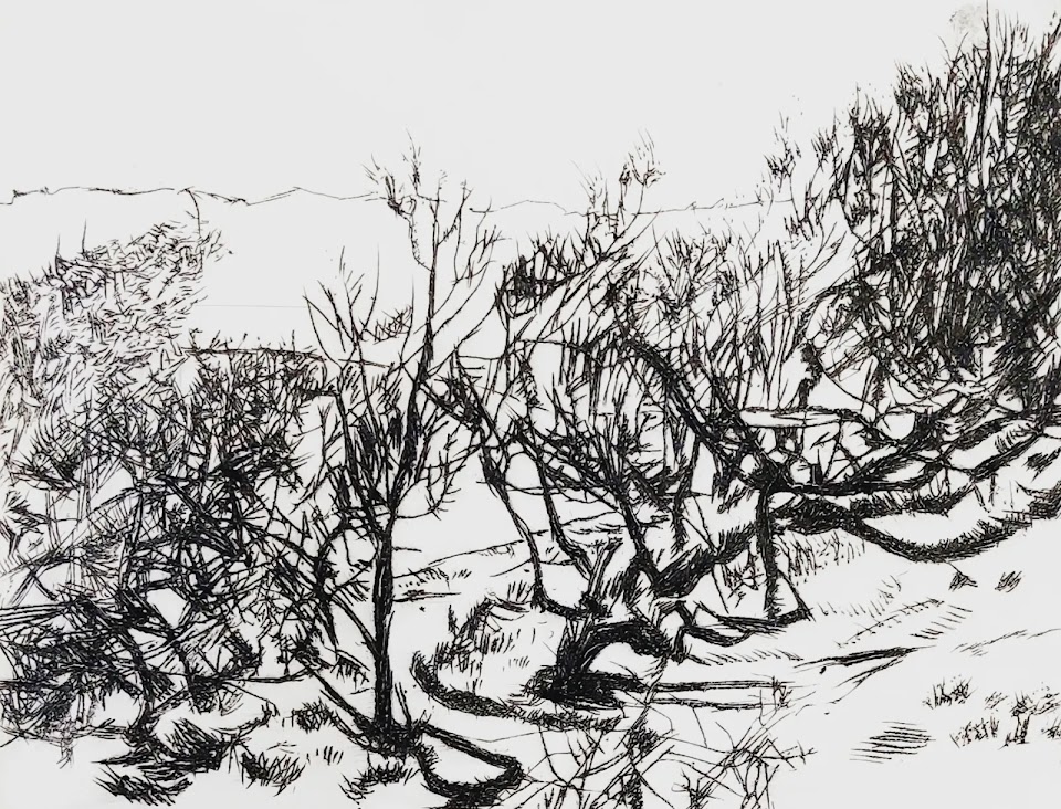 A series of original paintings and drypoint intaglio prints inspired by the sea, coastal paths and woodland near the shores of south west England.