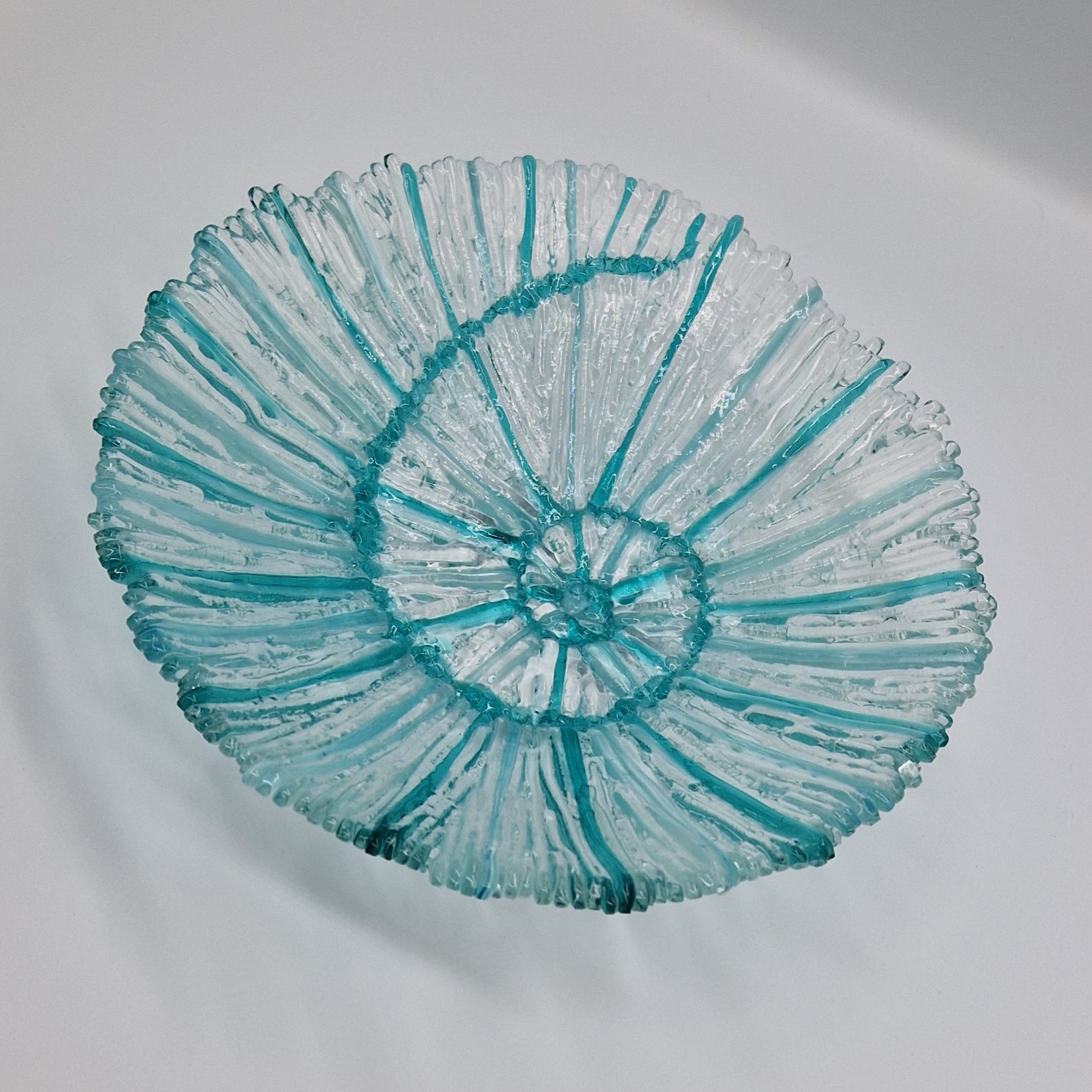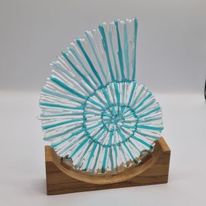 Exploring the colour and texture of glass, my new works feature a striking freestanding Ammonite sculpture and a beautiful 30cm Ammonite bowl, both in a lovely shade of blue.