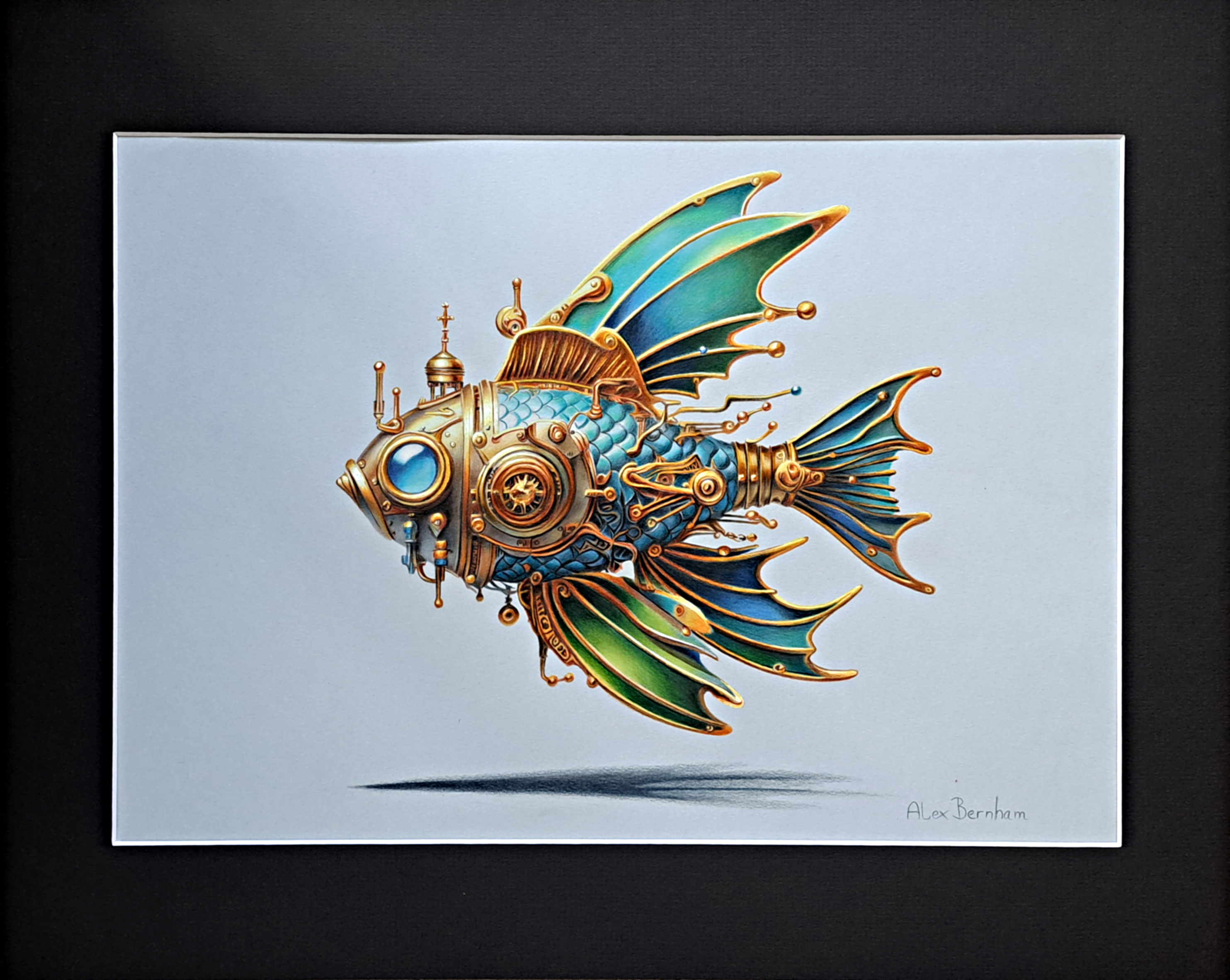I imagined a world where steam hisses underwater and gears churn beneath the waves. These fish emerged from that dreamscape, half creature, half contraption. Coloured pencils were my tool of choice: soft enough for scales, precise enough for rivets, and perfect for capturing a sense of playful impossibility."